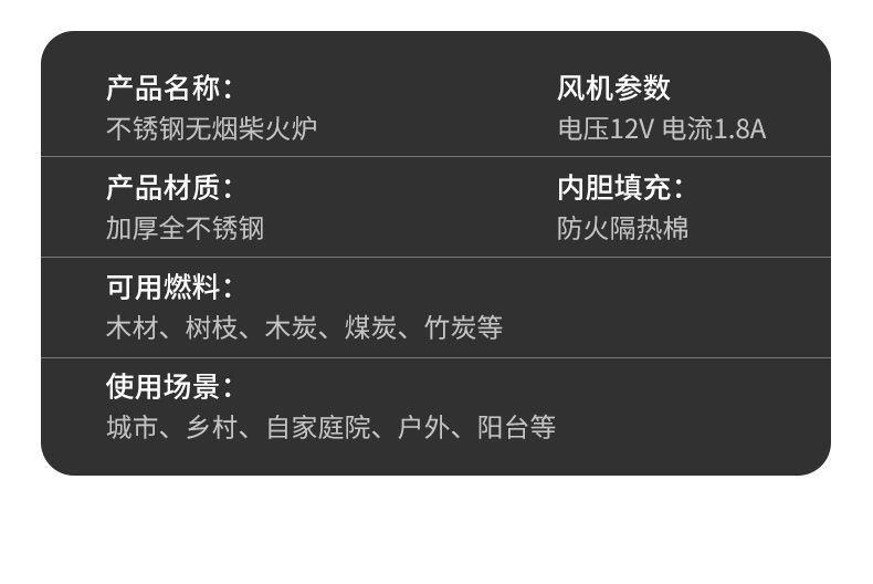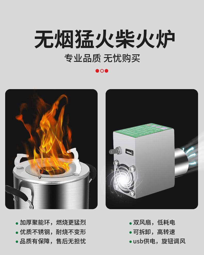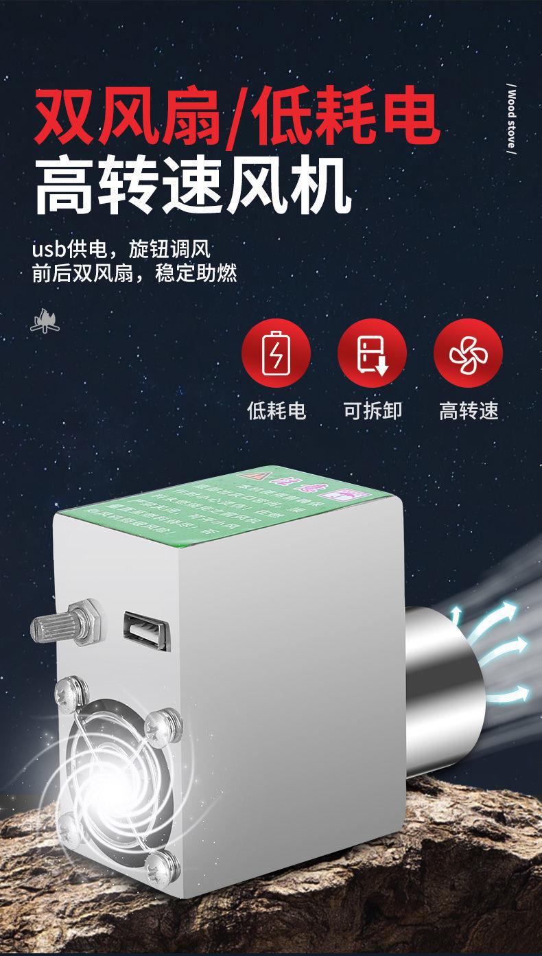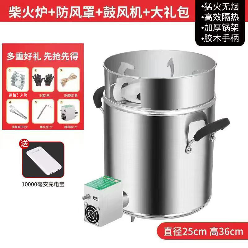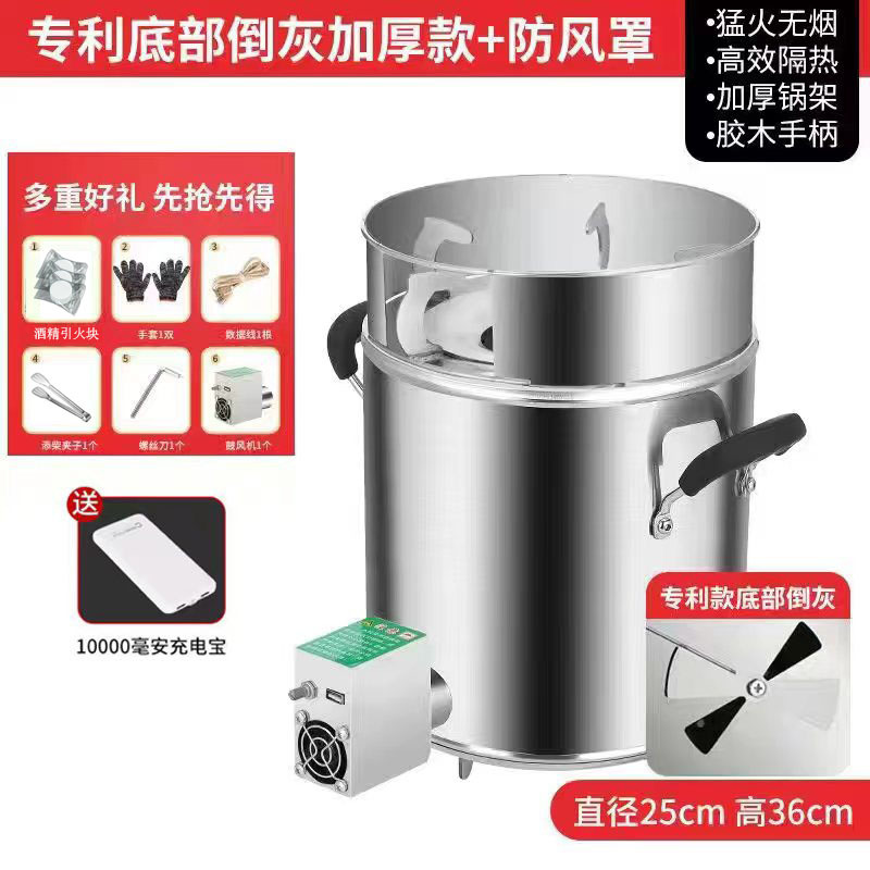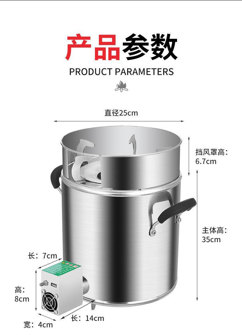 • 두꺼운 재 난로 + 방풍 굴뚝 + 팬 + 선물 가방 + 보조베터리