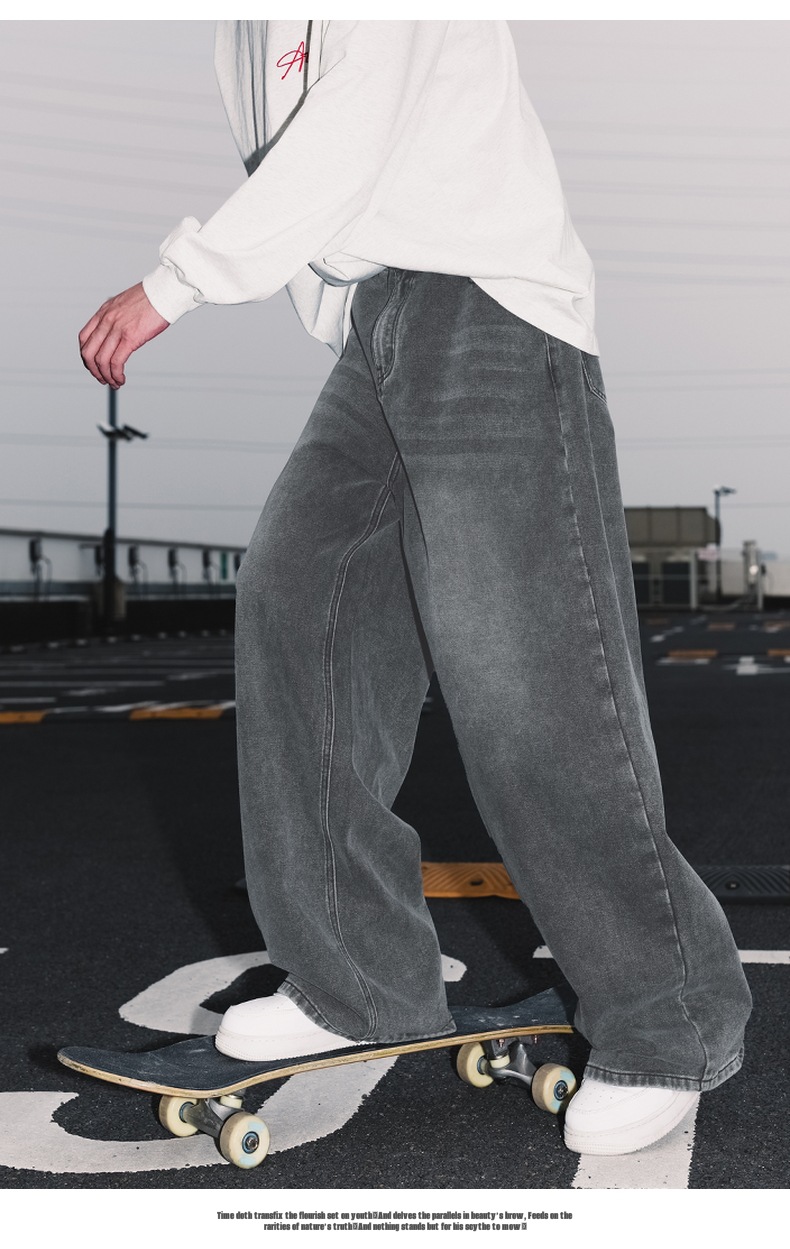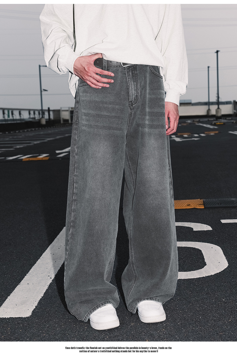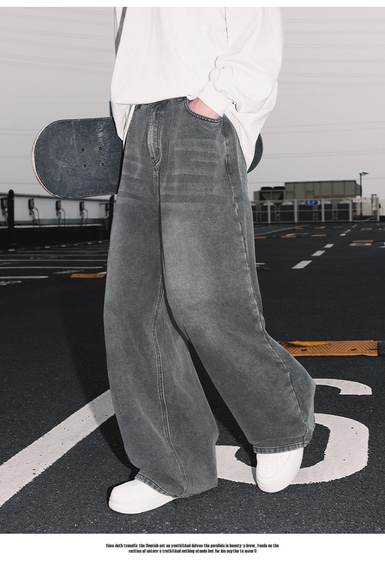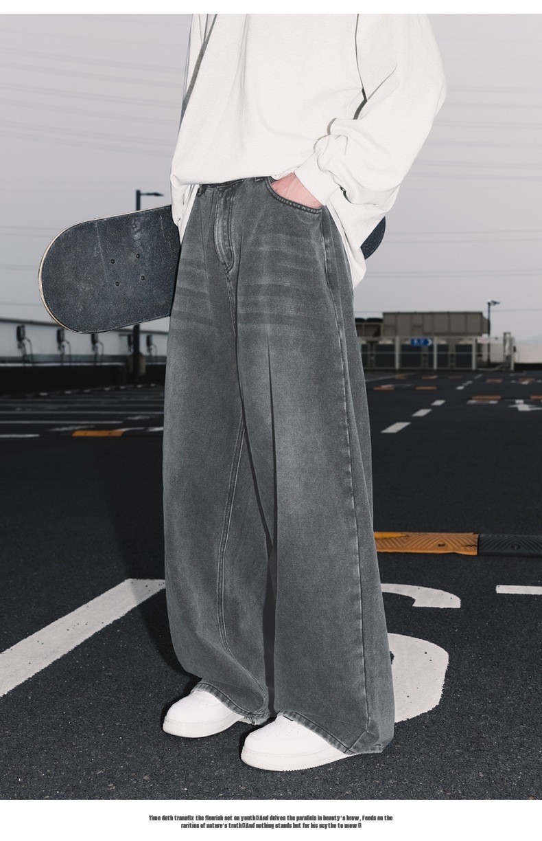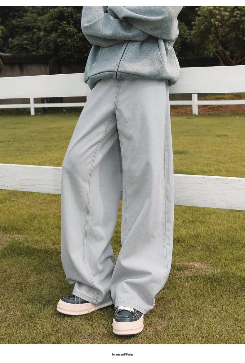 가을 신상 기본 루즈 스트레이트 팬츠 트렌디 브랜드 바지 남성용 아메리칸 레트로 워싱 디스트레스드 와이드 레그 청바지스토어 가기