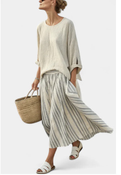 유럽과 미국의 새로운 컬러 블록 스트라이프 캐주얼 티셔츠 모조 린넨 슈트 루즈 스커트 스트라이프 캐주얼 슈트 독립 스테이션