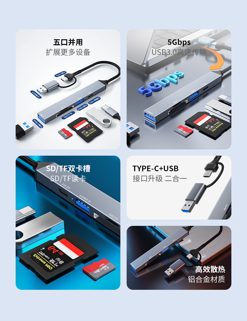 type-c 도킹 스테이션 허브 카드 리더기 5-in-one 허브 SD/TF 듀얼 카드 슬롯 USB 3.0 확장기스토어 가기