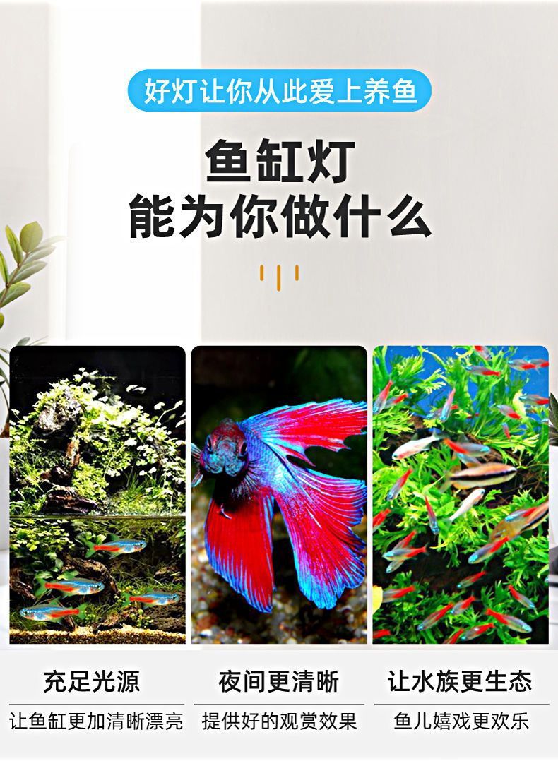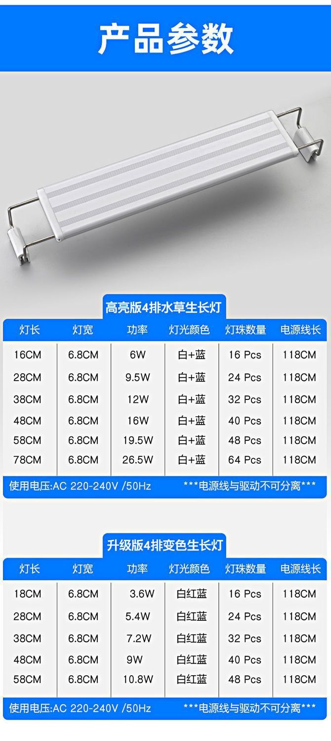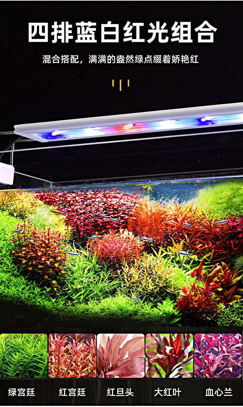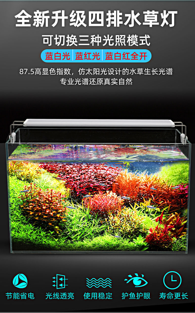 • 50-60cm 탱크에 적합한 파란색, 빨간색 및 흰색 조명의 4줄