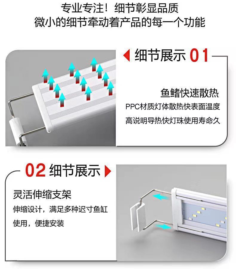 • 50-60cm 탱크에 적합한 6줄의 매우 밝은 파란색 및 흰색 조명
