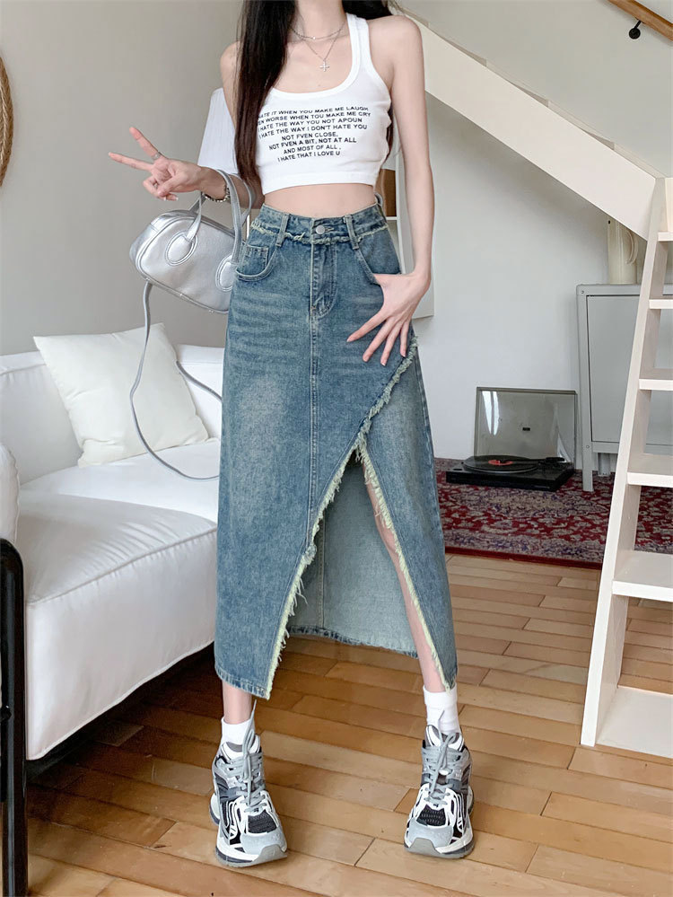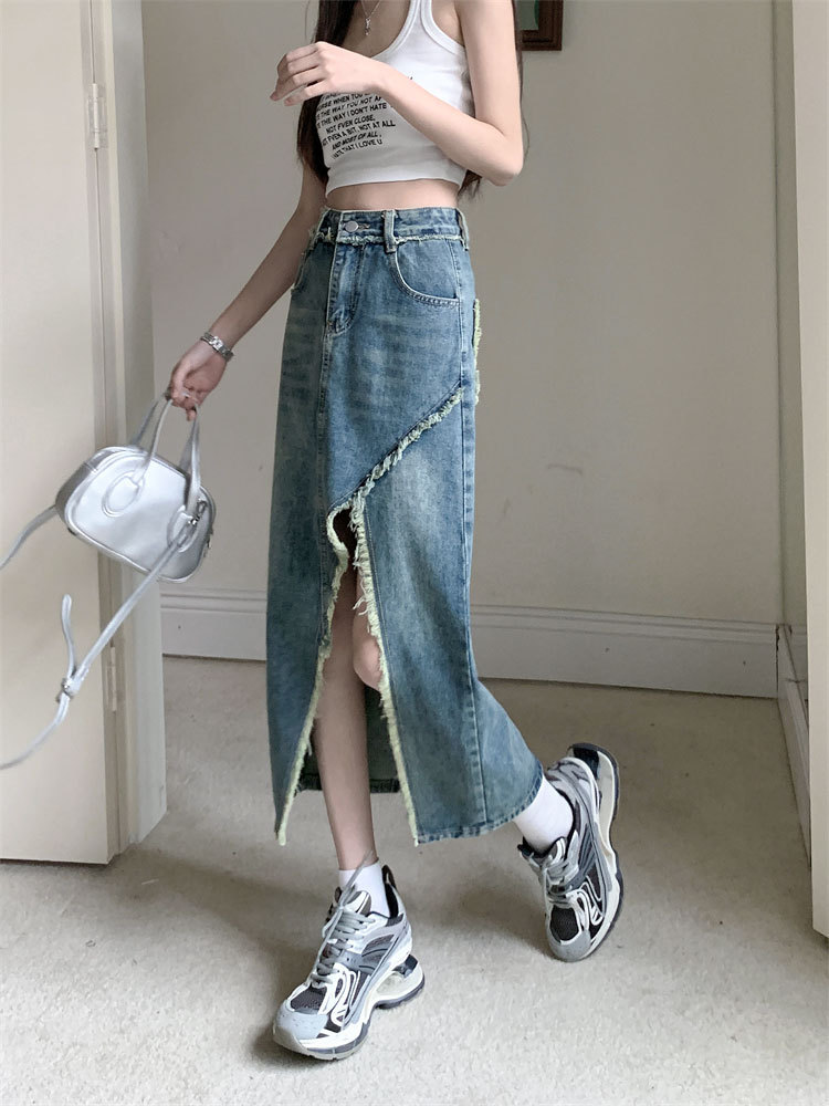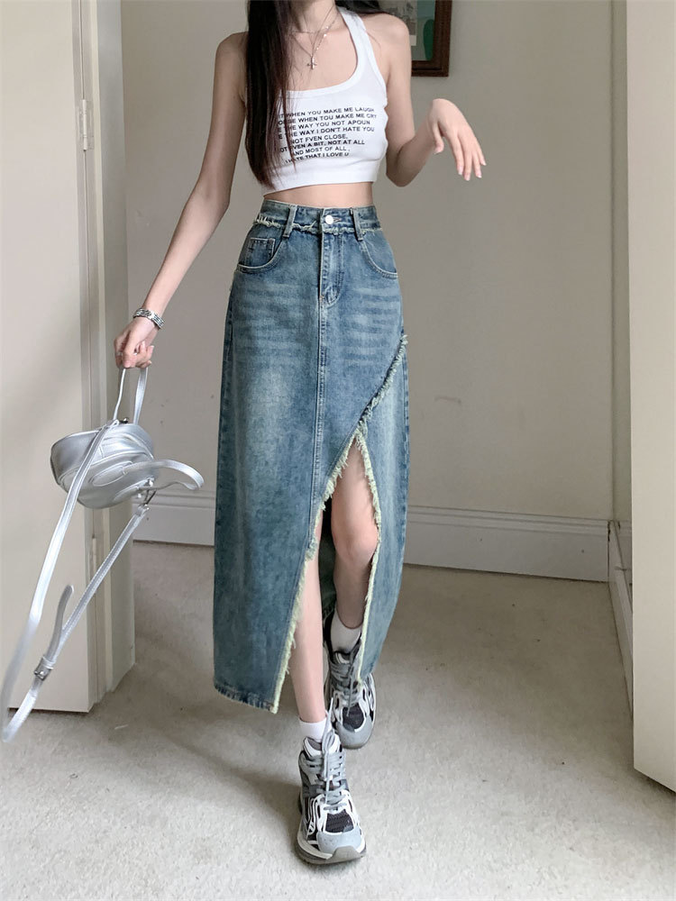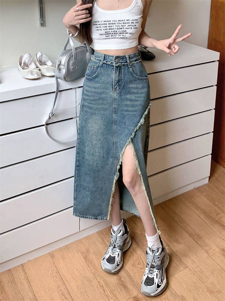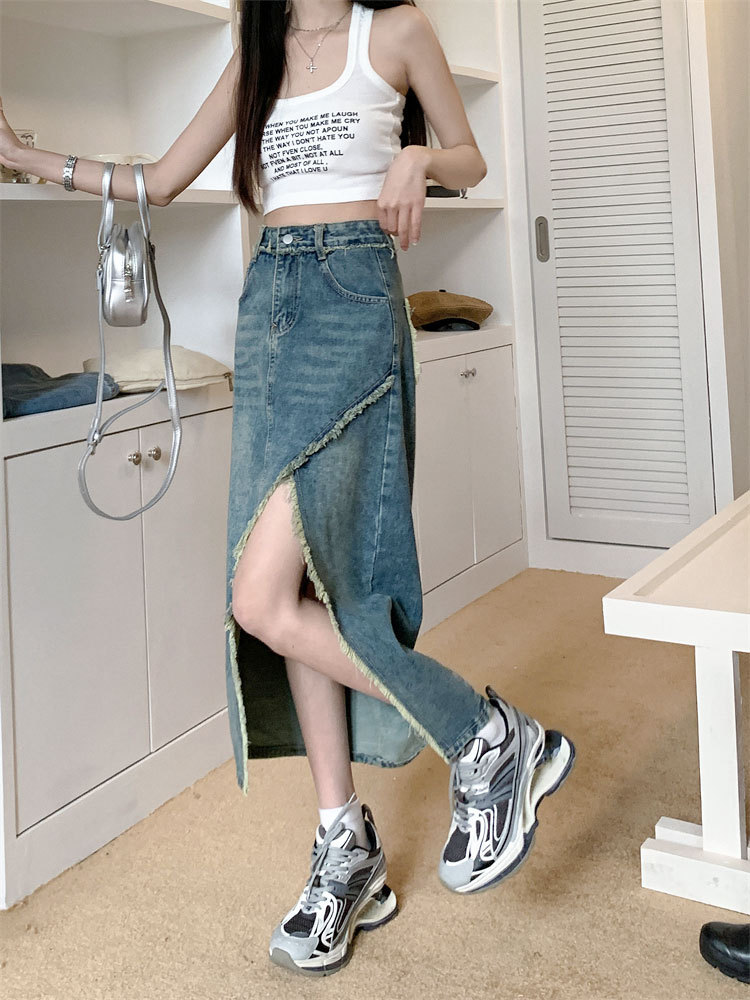 여성용 데님 로우 엣지 스커트, 니치 슬릿 미드기장 스커트, 불규칙한 A라인 트렌디 스트레이트 힙 커버 하이웨이스트 디자인