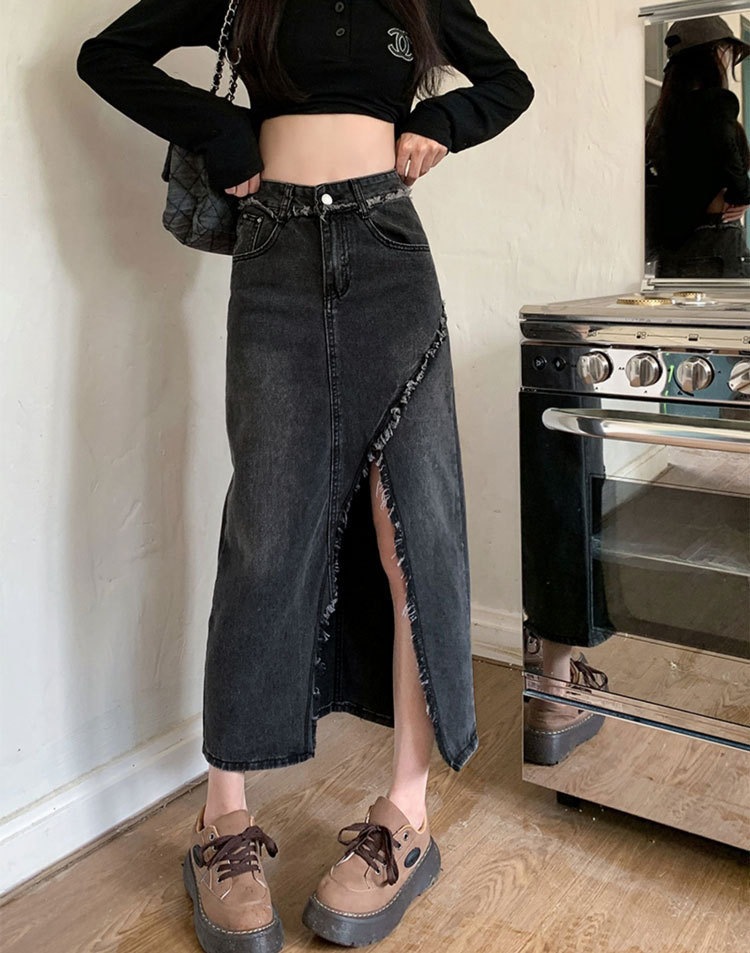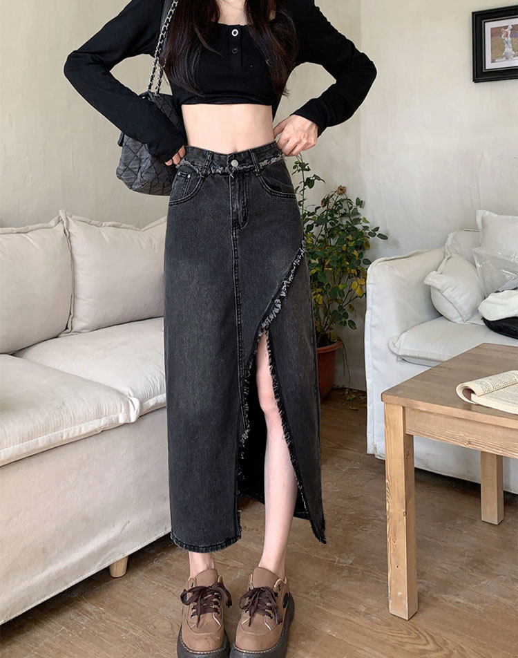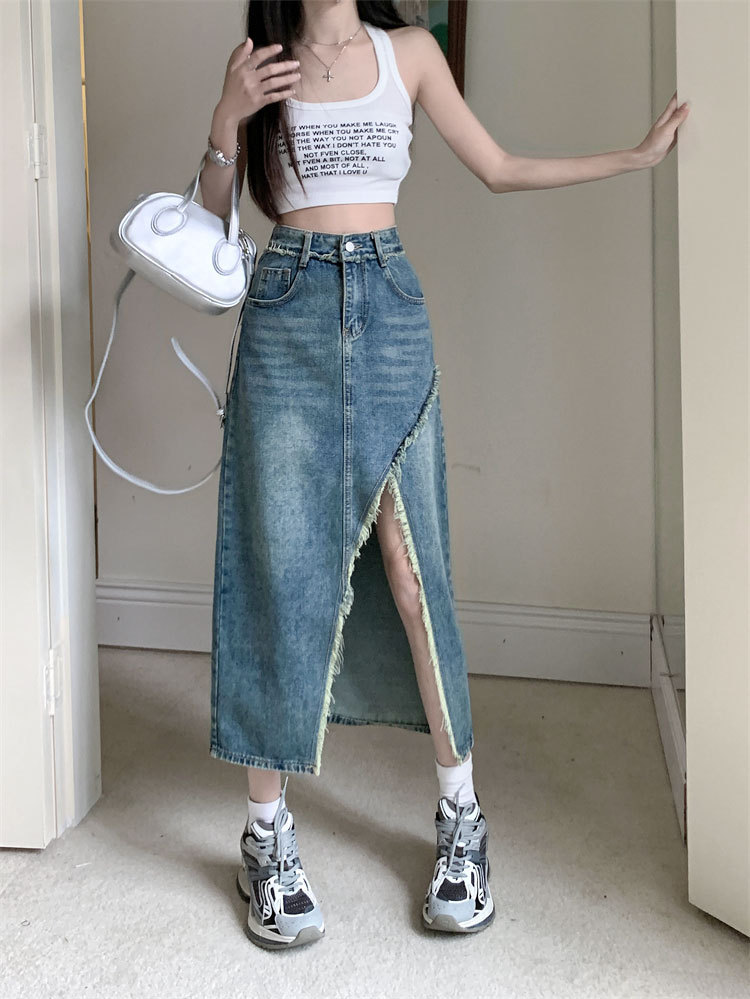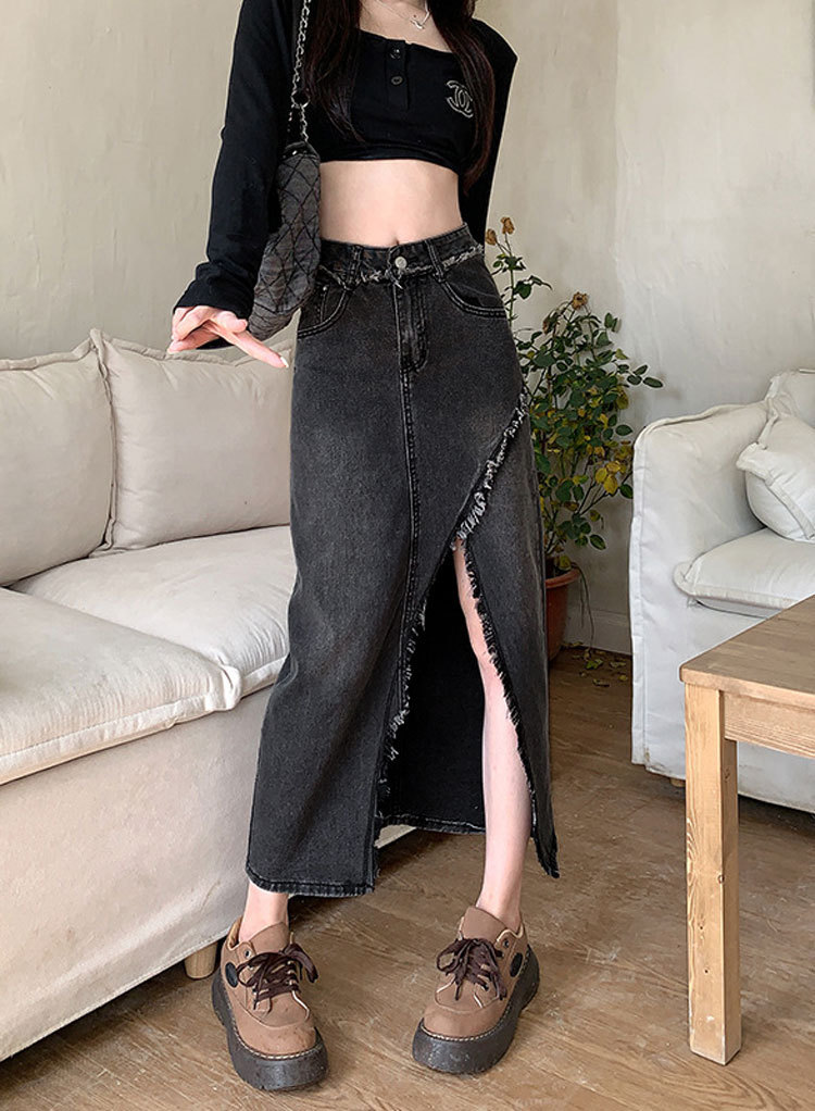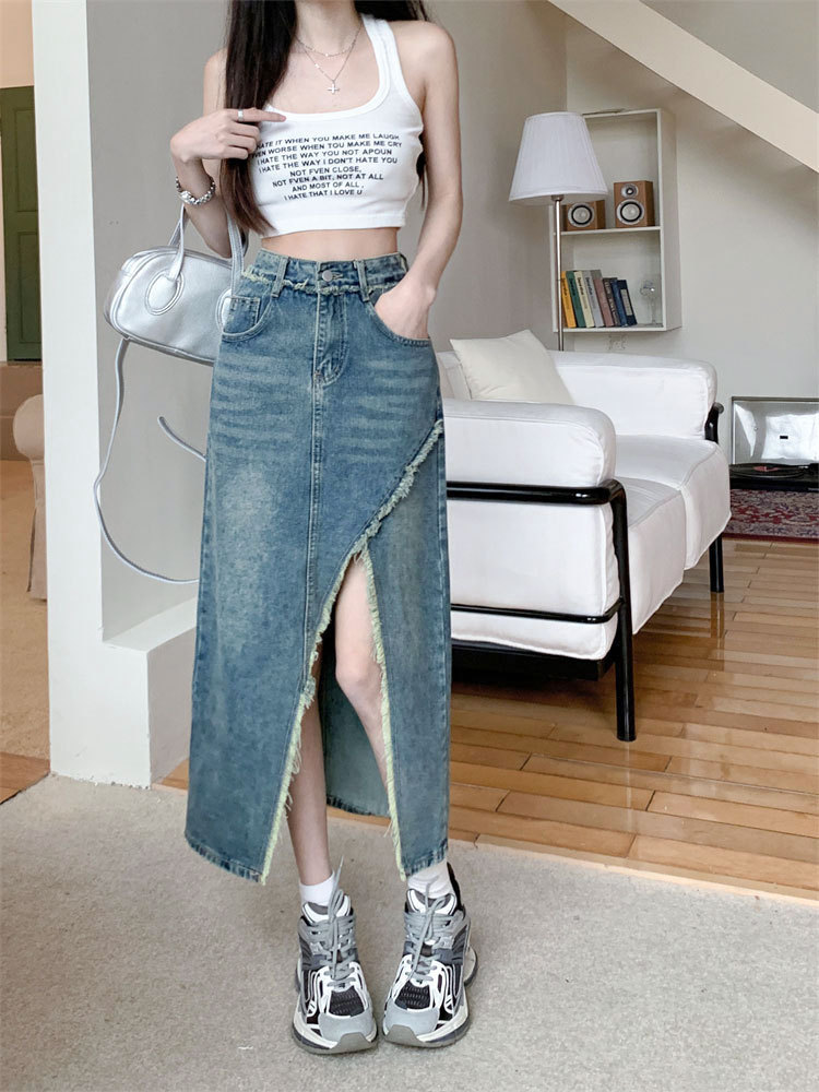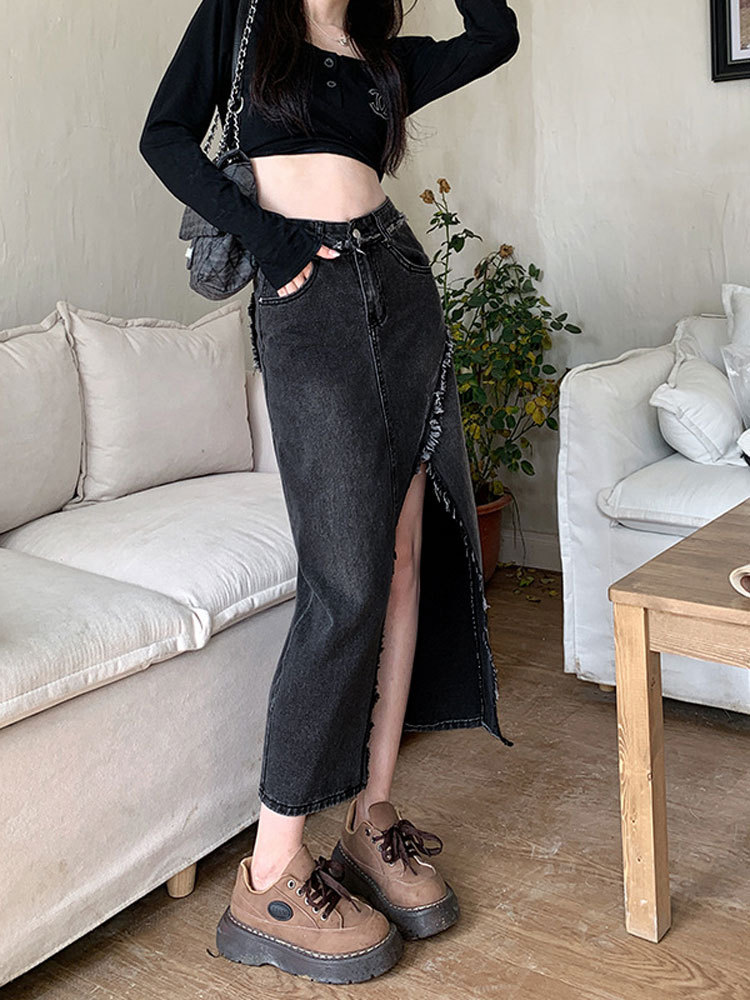 여성용 데님 로우 엣지 스커트, 니치 슬릿 미드기장 스커트, 불규칙한 A라인 트렌디 스트레이트 힙 커버 하이웨이스트 디자인