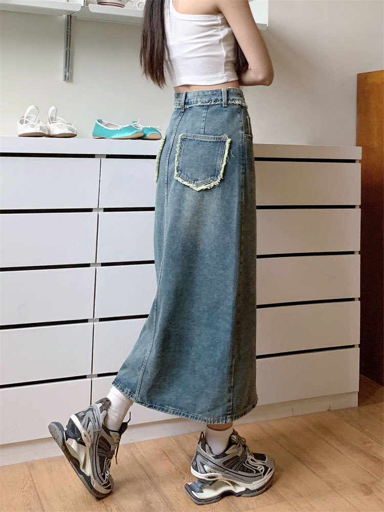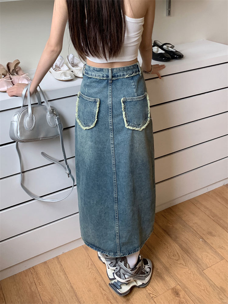 여성용 데님 로우 엣지 스커트, 니치 슬릿 미드기장 스커트, 불규칙한 A라인 트렌디 스트레이트 힙 커버 하이웨이스트 디자인스토어 가기