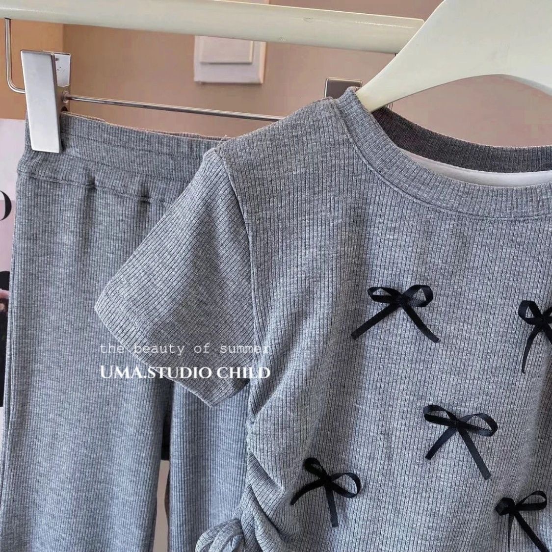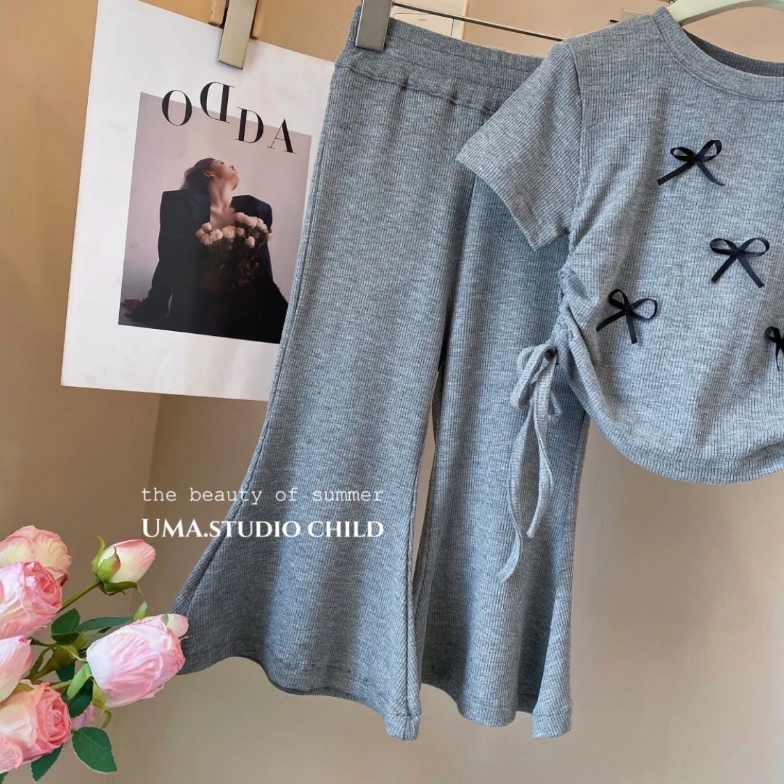 여자 정장 2025 Bowknot 여름 슬림 플레어 바지 어린이 캐주얼 스타일 반팔 유행 투피스 세트