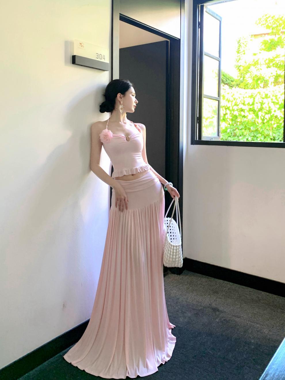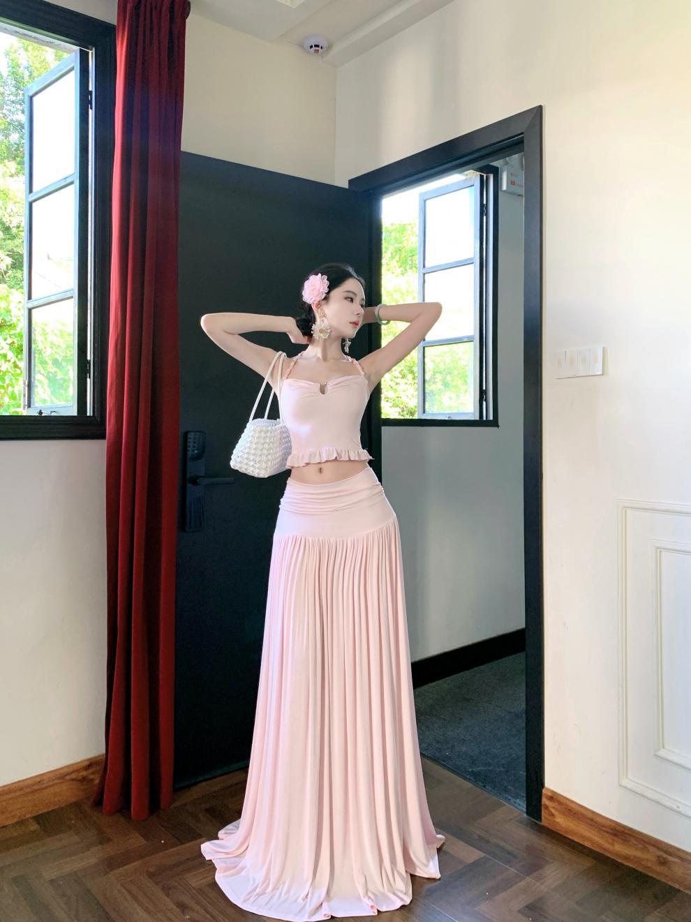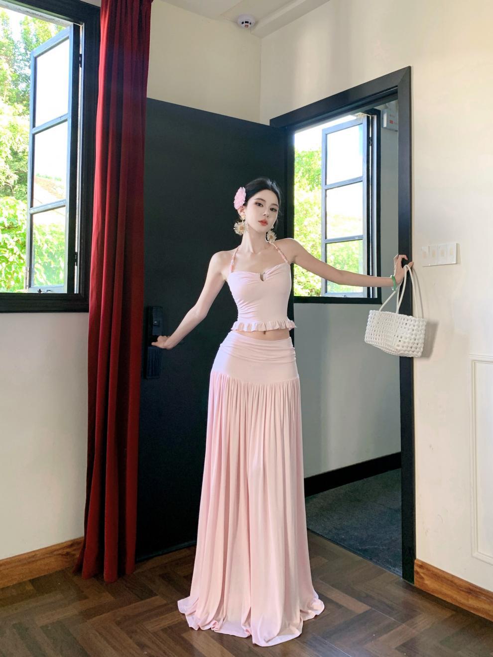 2026년 여름 신상 섹시한 해변 휴가룩 허리라인을 강조하는 홀터넥 탑 여성 비치웨어 스커트 세트