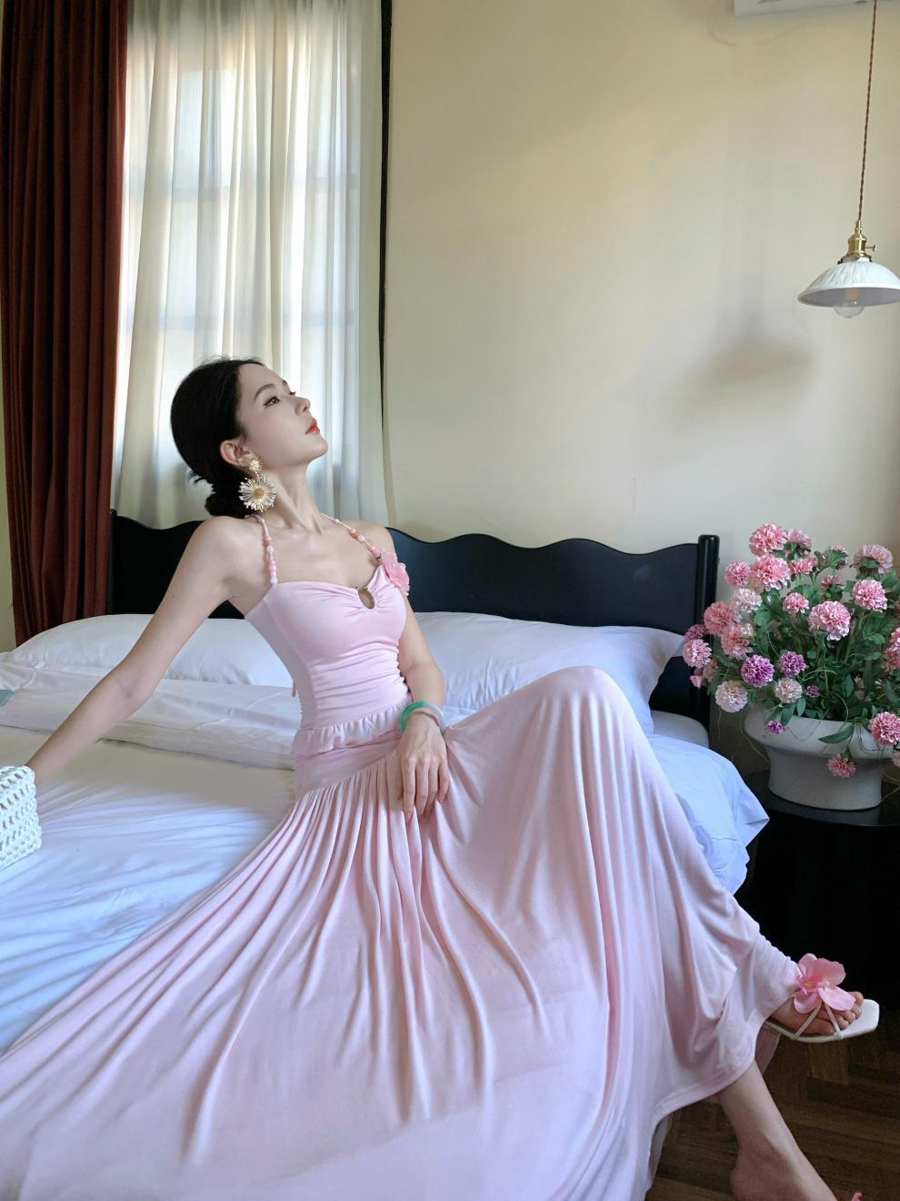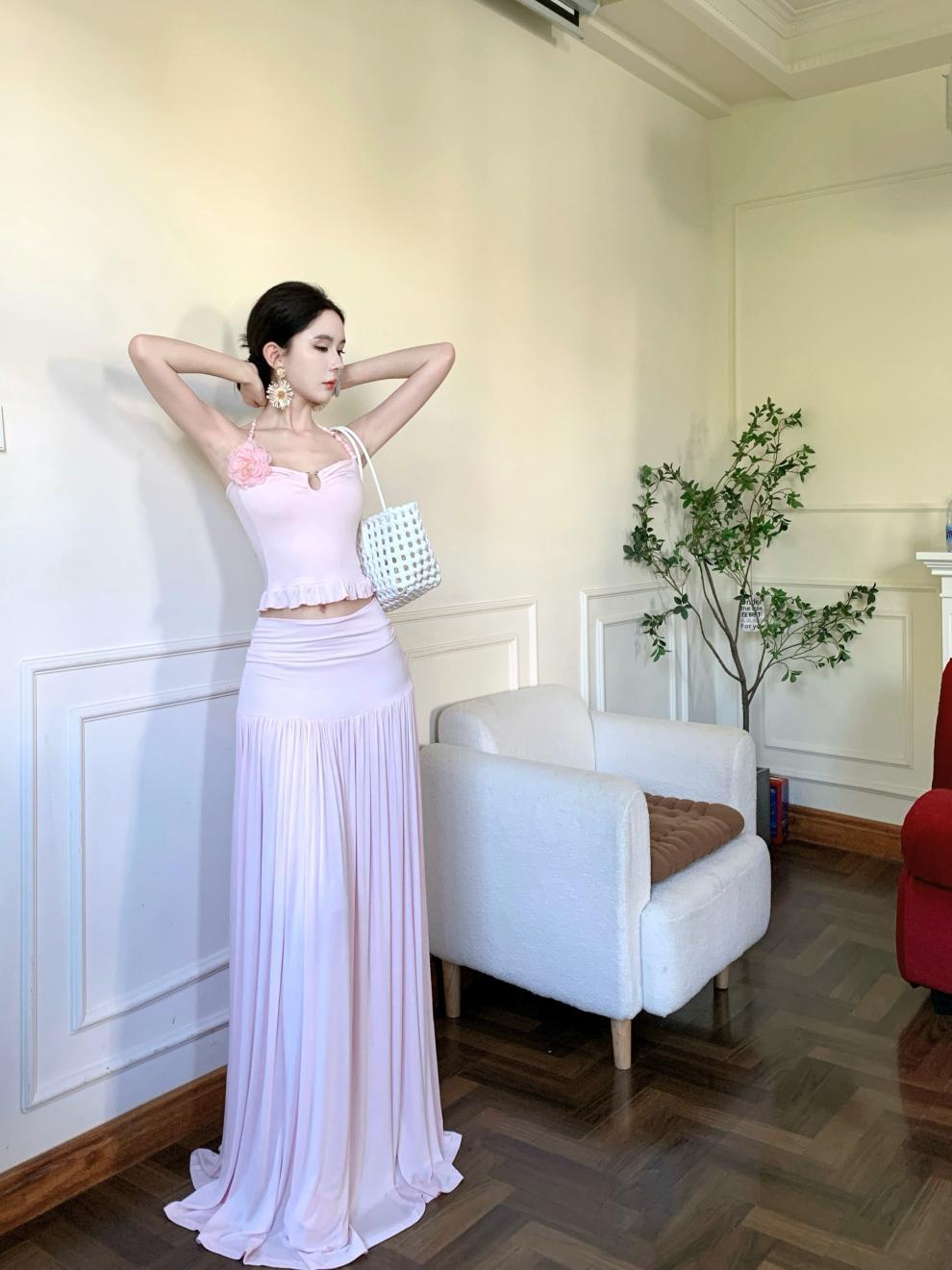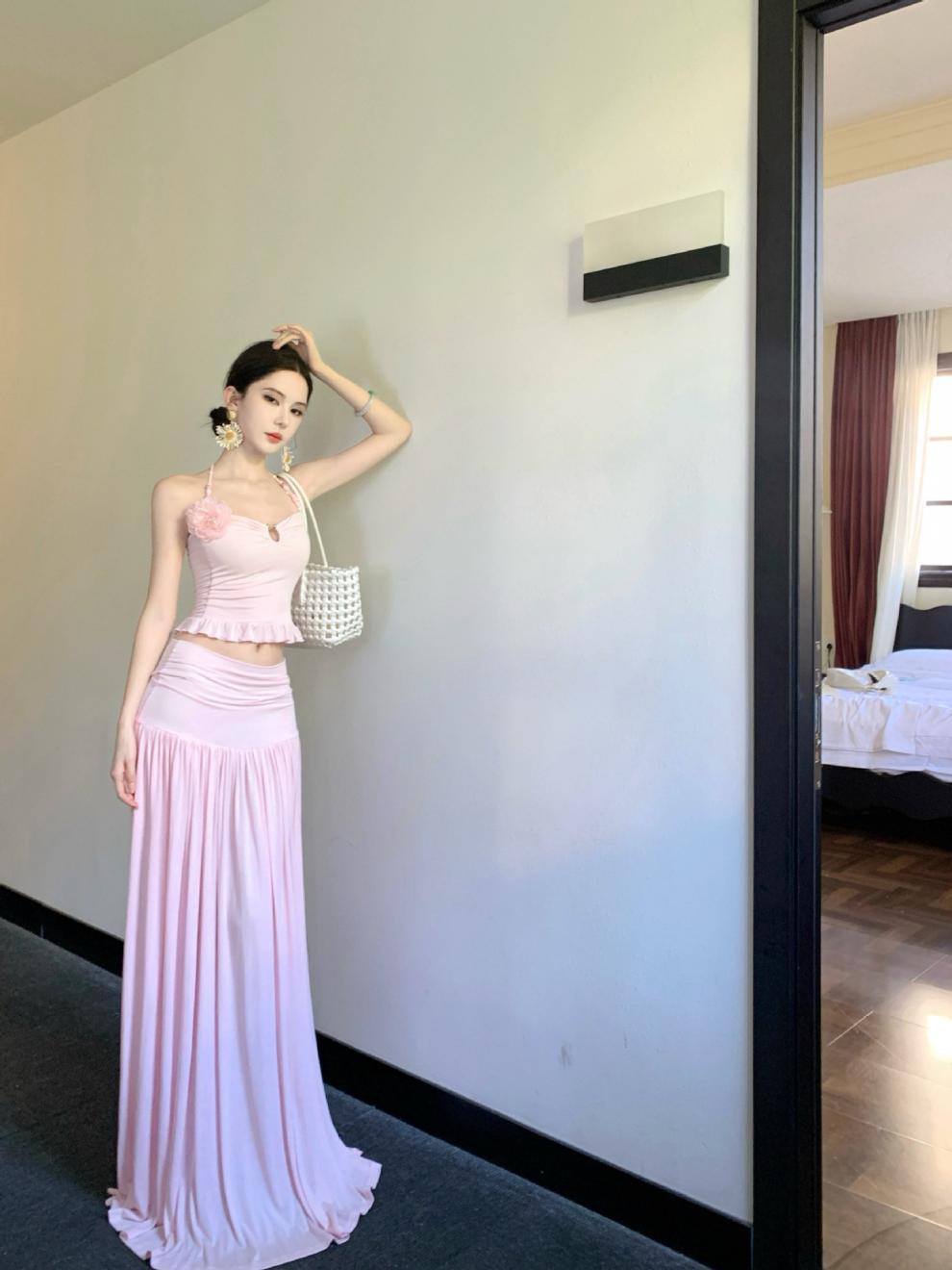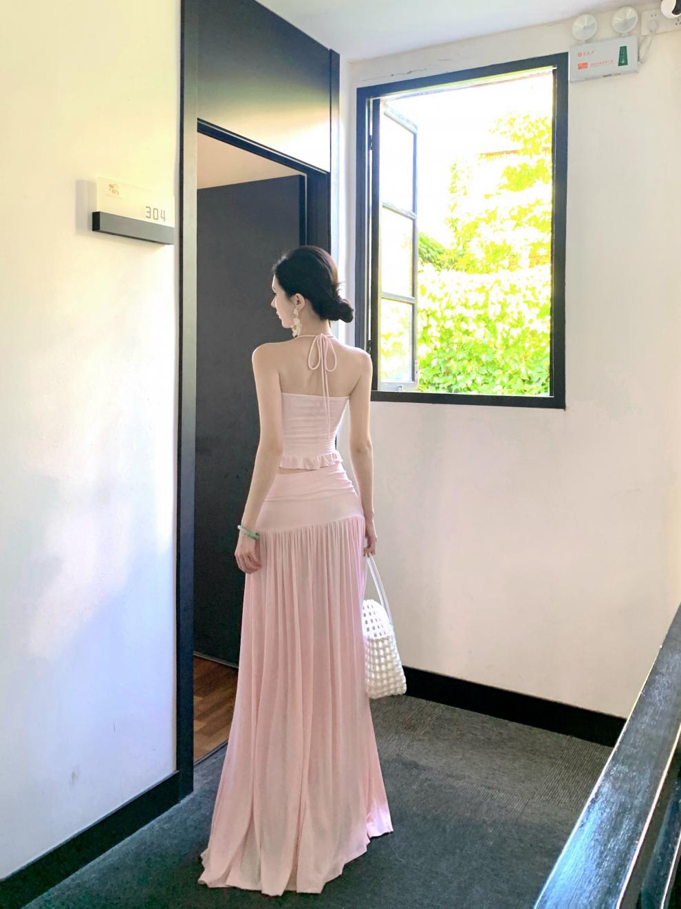 2026년 여름 신상 섹시한 해변 휴가룩 허리라인을 강조하는 홀터넥 탑 여성 비치웨어 스커트 세트
