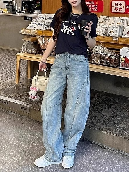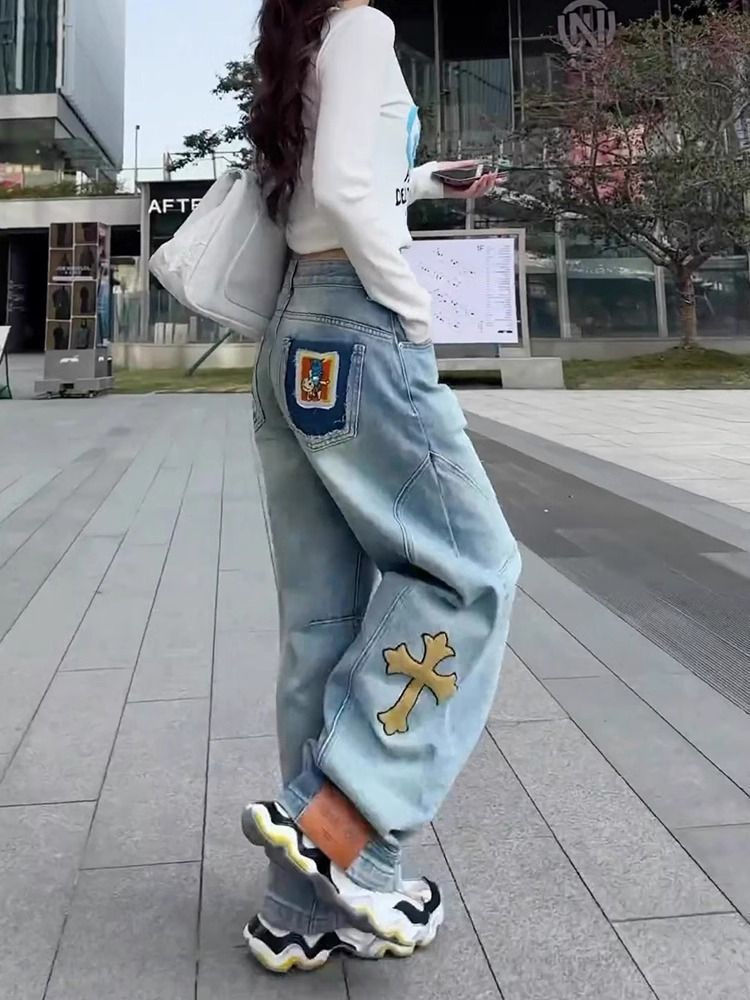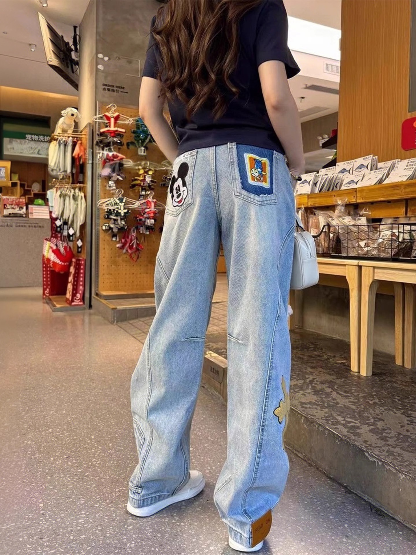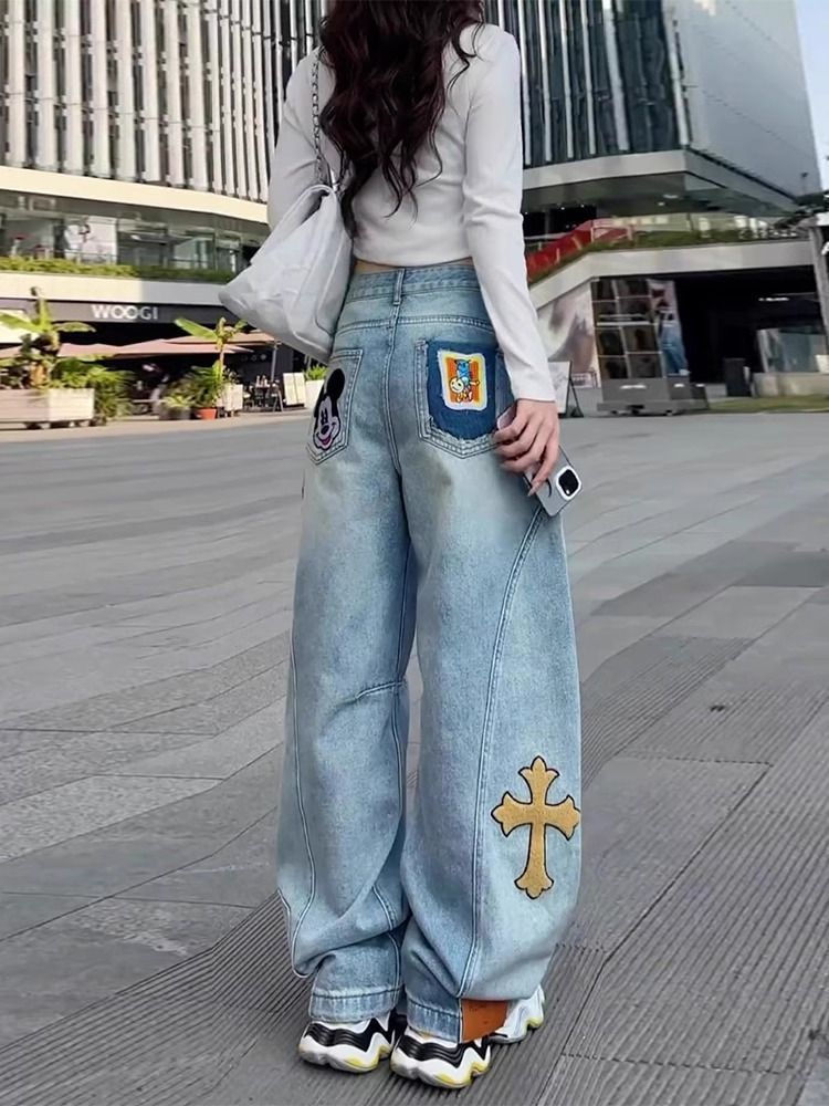 2025 새로운 미키 만화 수 놓은 칼집 청바지 여성 플러스 사이즈 높은 허리 느슨한 슬리밍 바나나 바지 국경 간스토어 가기