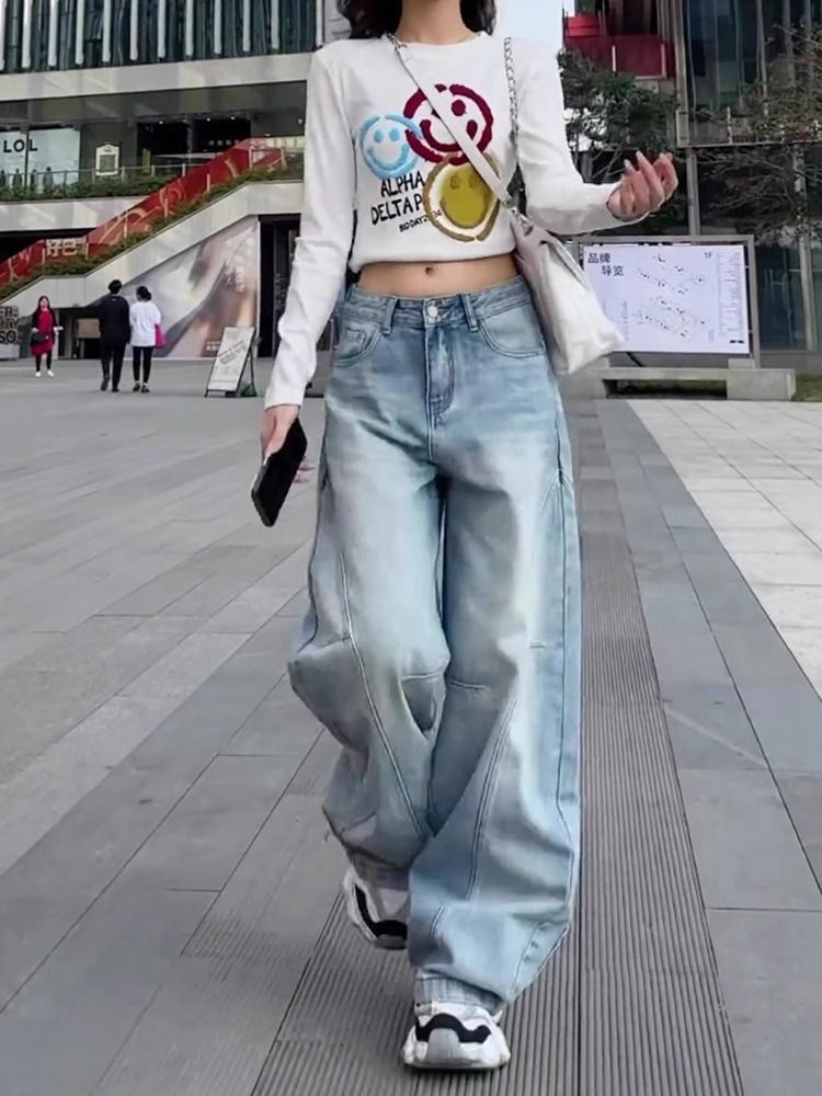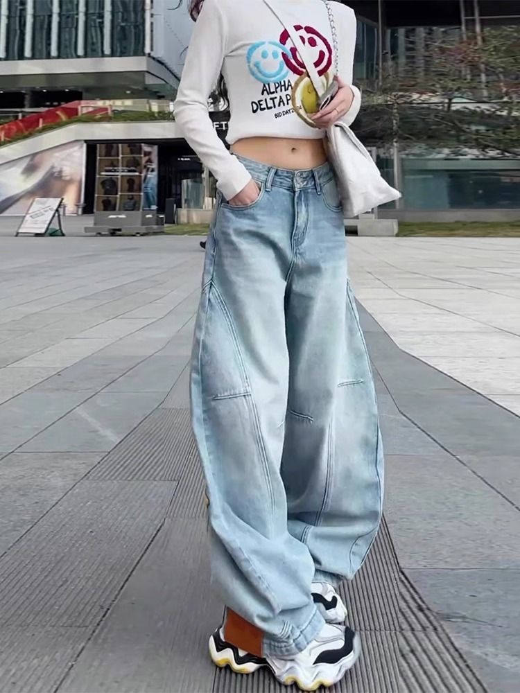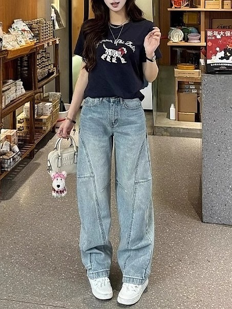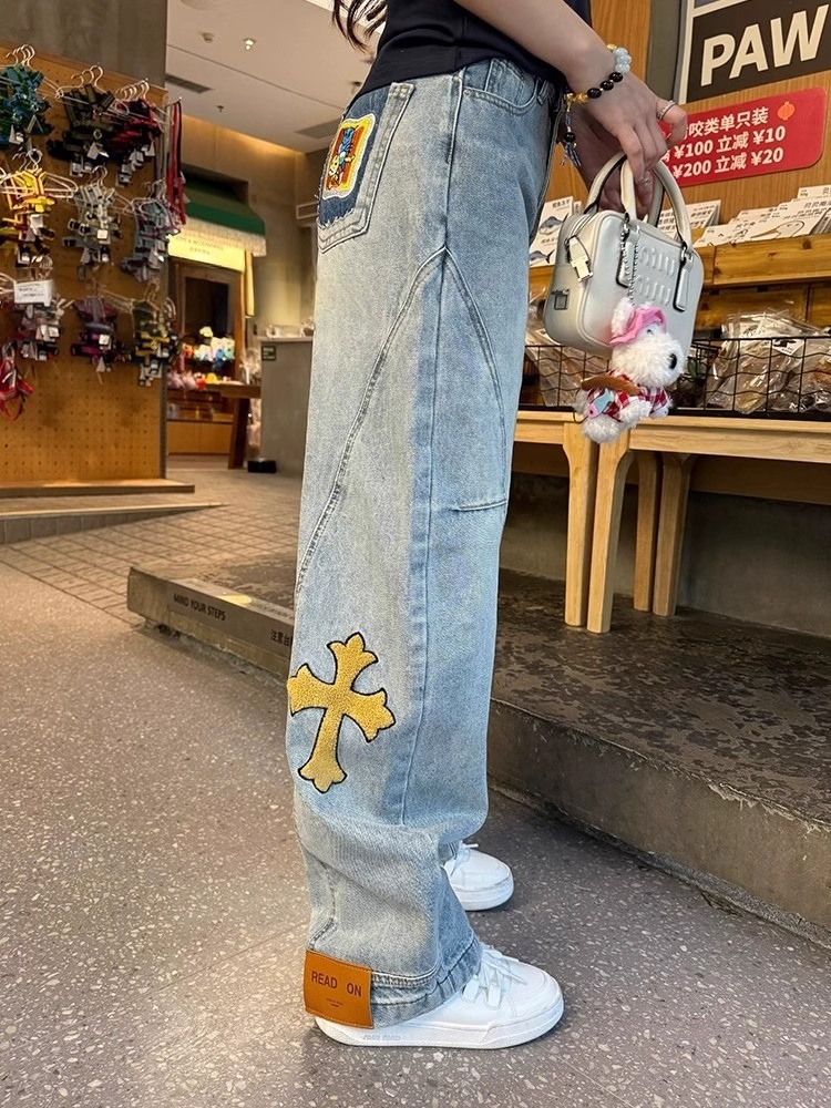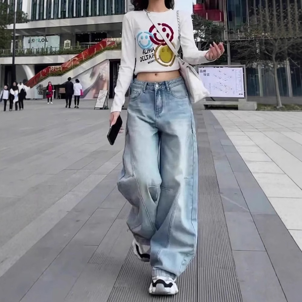 2025 새로운 미키 만화 수 놓은 칼집 청바지 여성 플러스 사이즈 높은 허리 느슨한 슬리밍 바나나 바지 국경 간스토어 가기