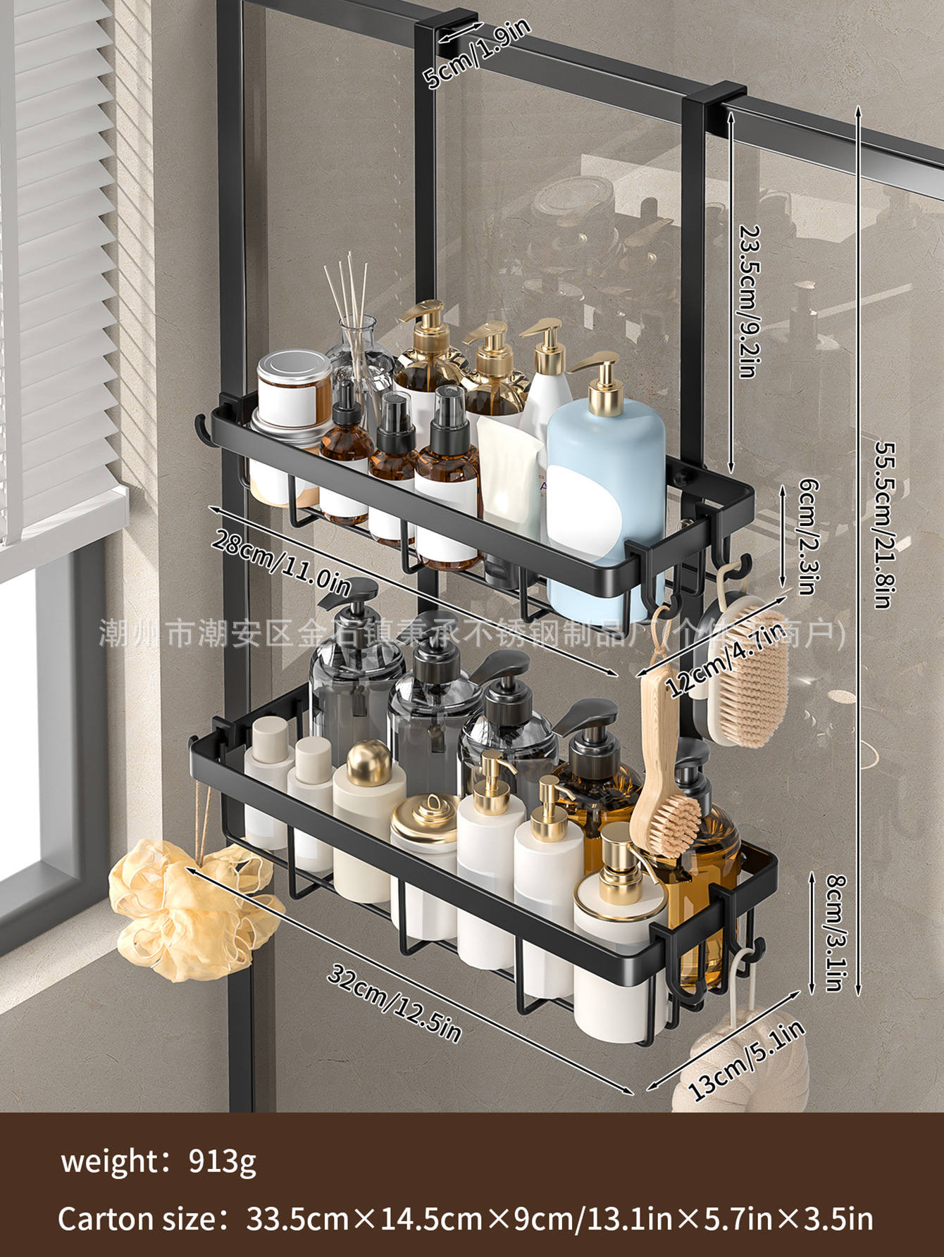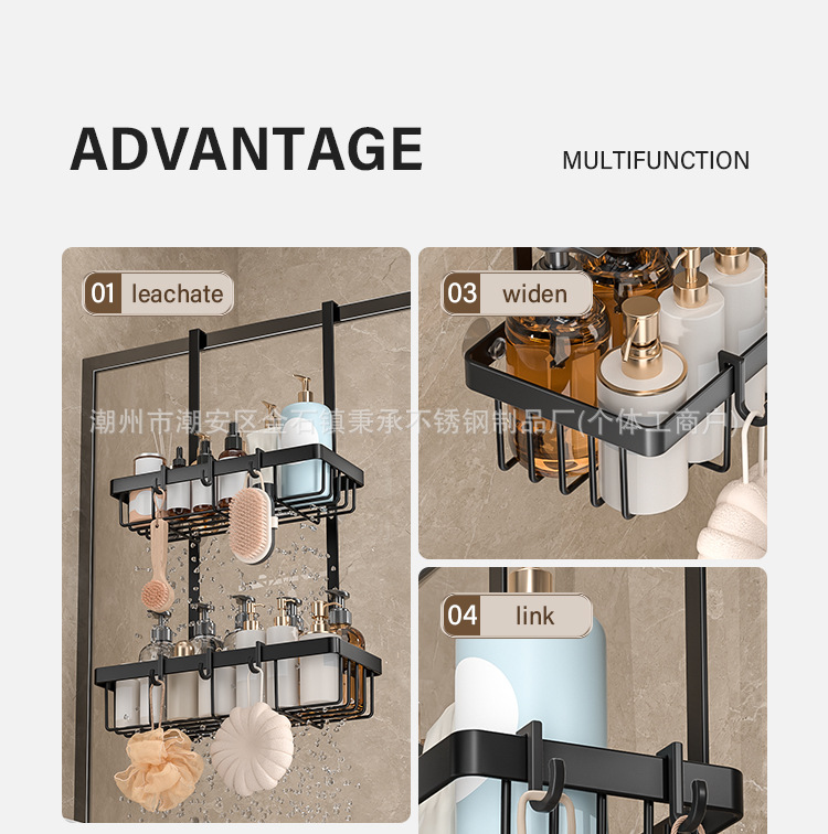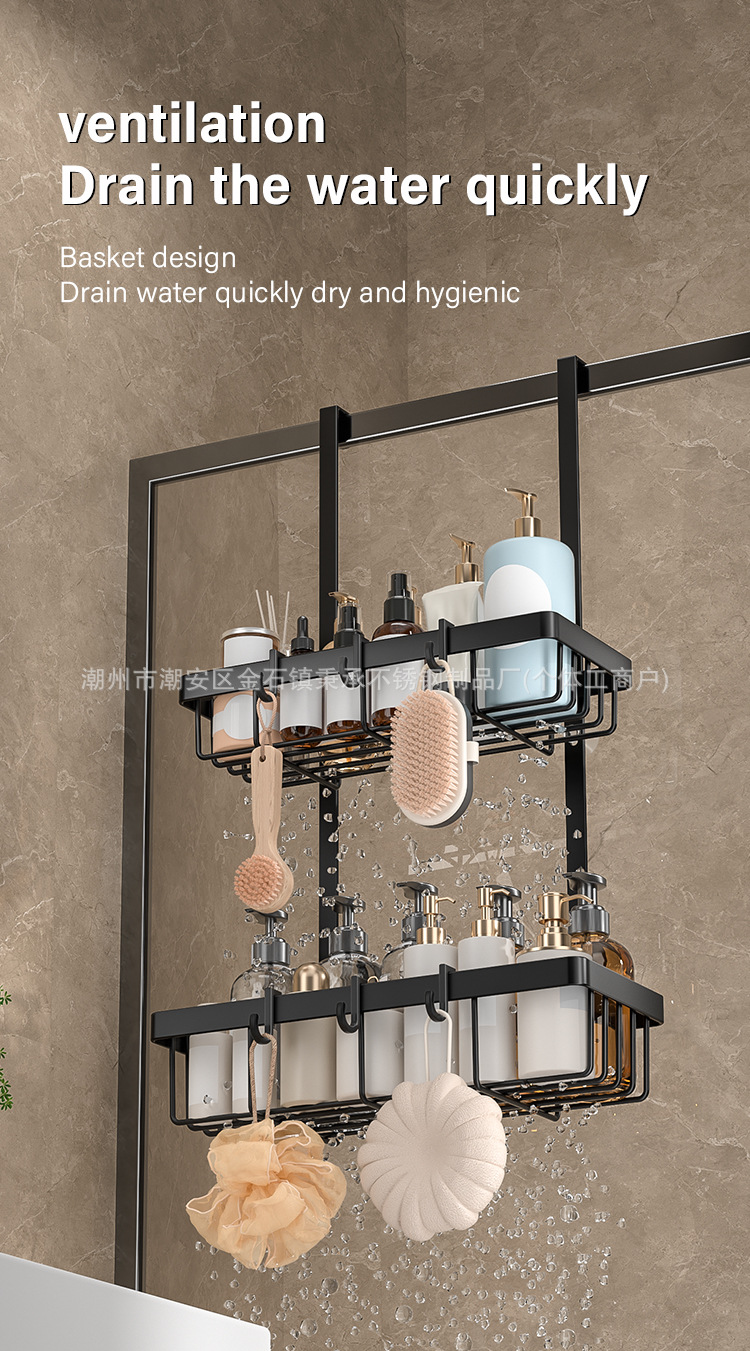 욕실 문 뒤에 있는 후면 후크가 있는 이중층 수납 선반, 다기능 욕실 용품 걸이, 구멍이 없는 욕실 수납 선반