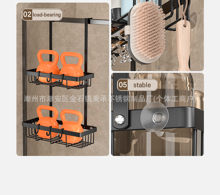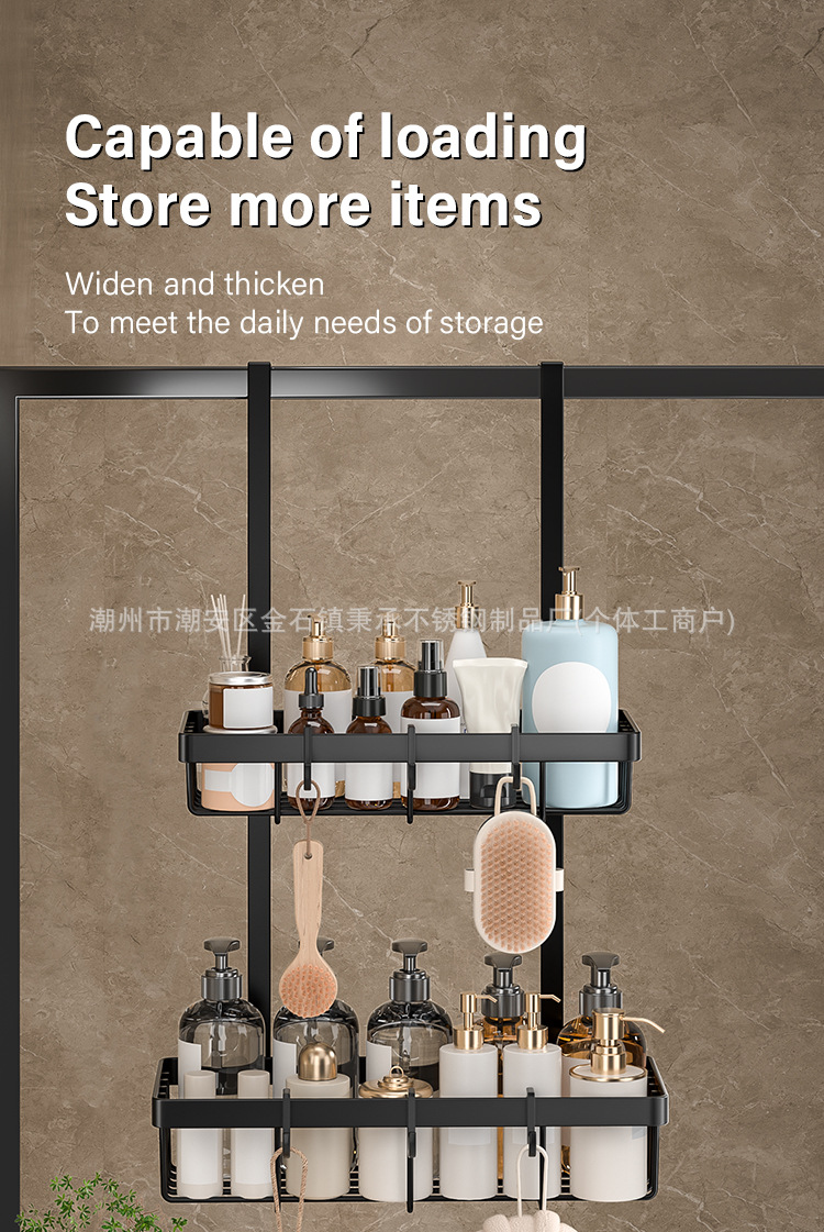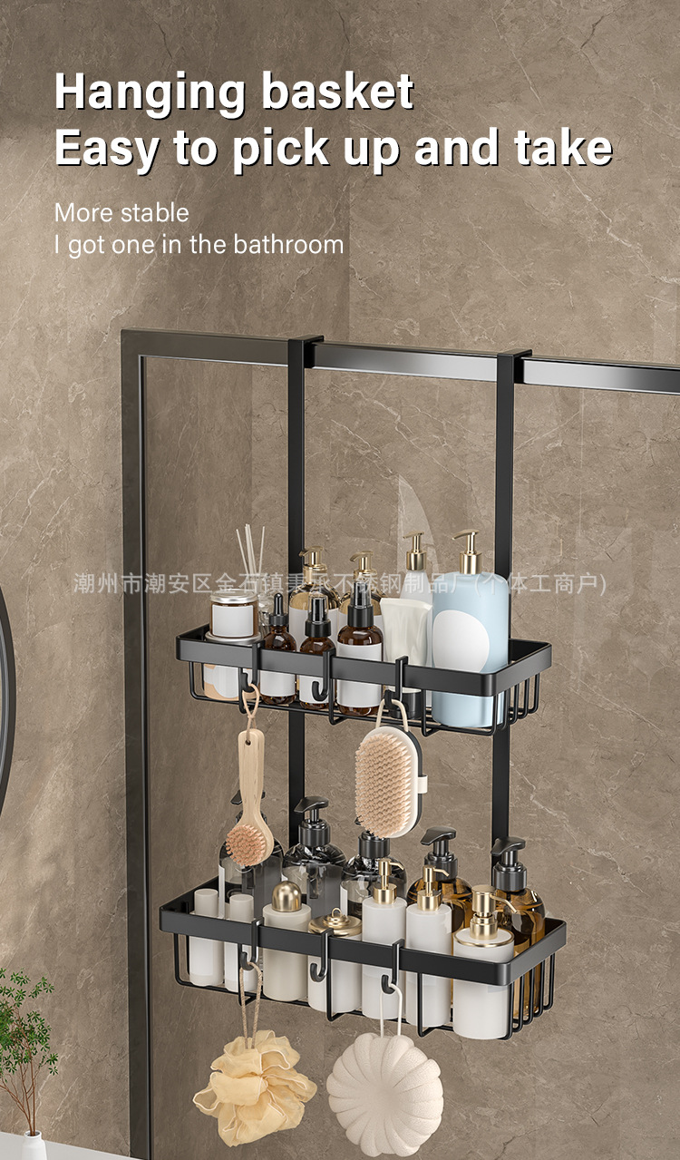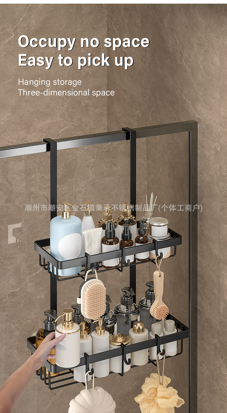 욕실 문 뒤에 있는 후면 후크가 있는 이중층 수납 선반, 다기능 욕실 용품 걸이, 구멍이 없는 욕실 수납 선반스토어 가기