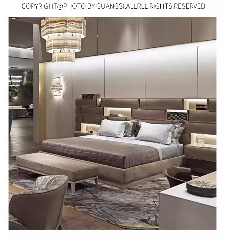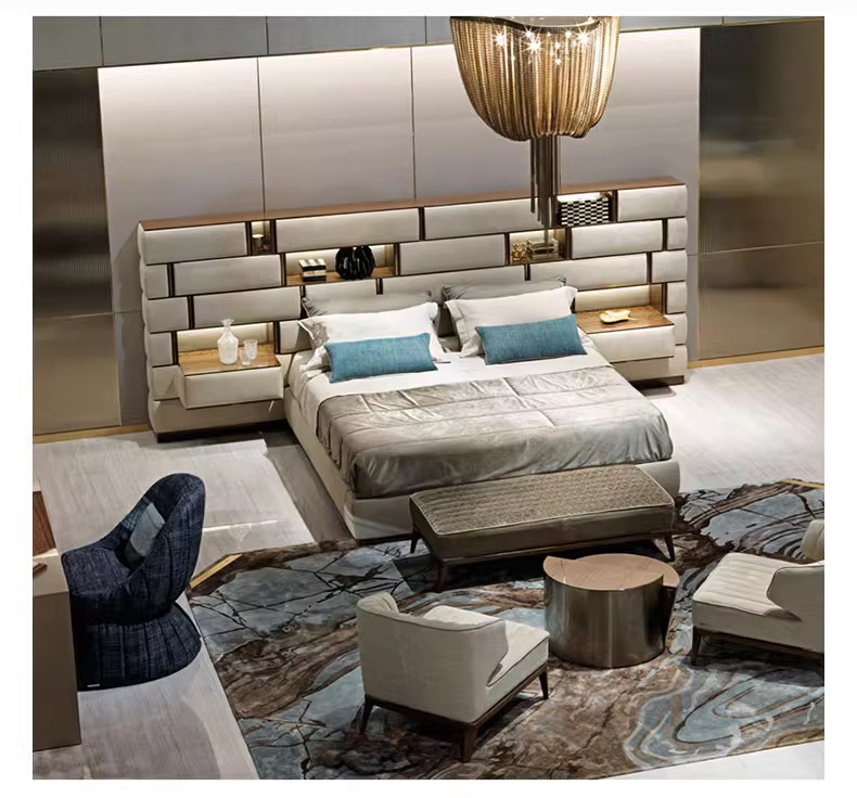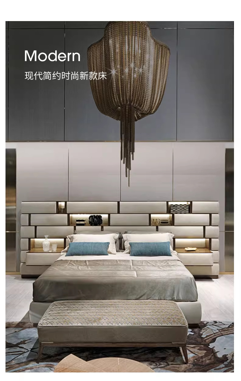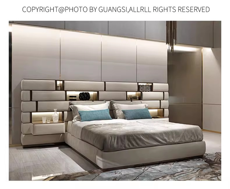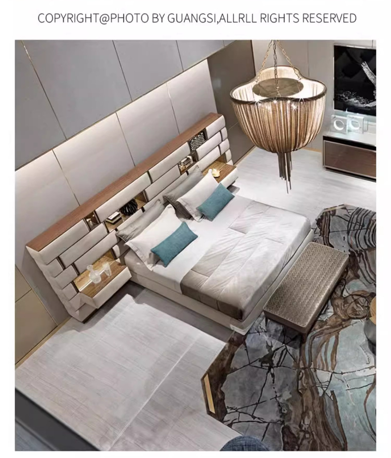 이탈리아 디자이너 와이드 스크린 침대 라이트 럭셔리 모던 더블 침대 럭셔리 빌라 대형 평면 반투명 가죽 마스터 침대