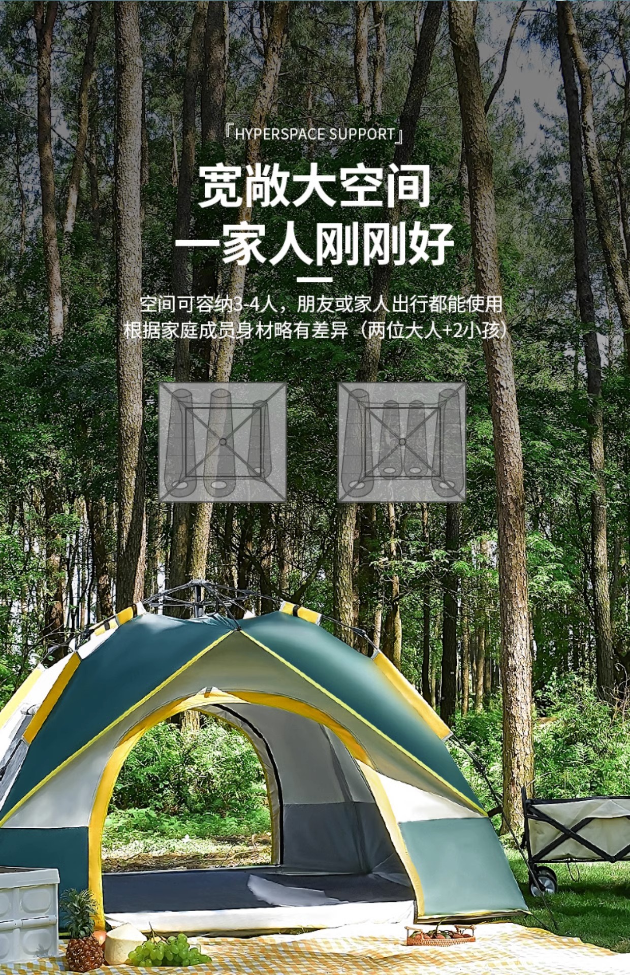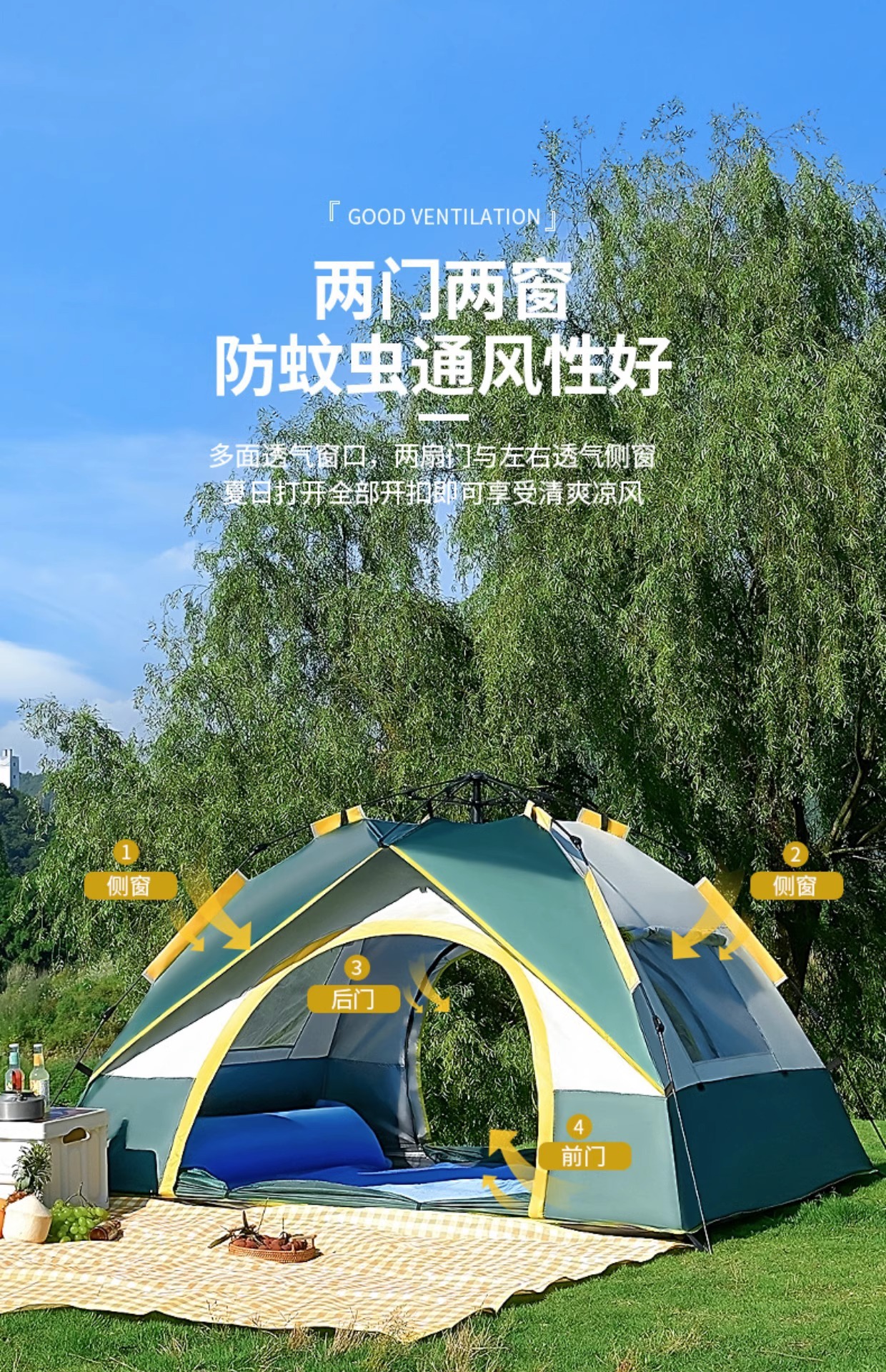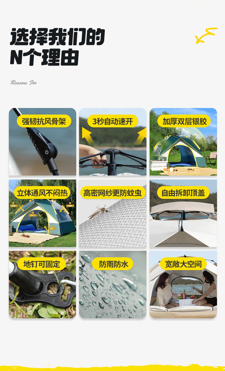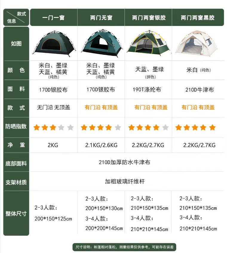 야외 캠핑용 텐트, 휴대용 접이식 캠핑 장비, 완전 자동 빠른 개방 - 비와 햇빛 차단