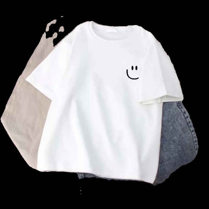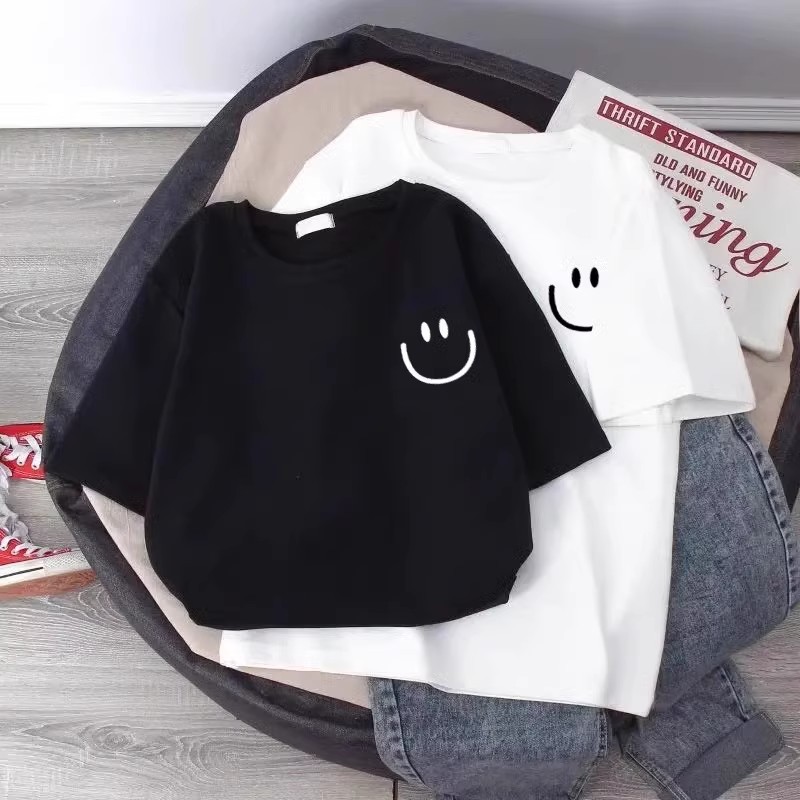 2025 큰 어린이를위한 패션 기본 셔츠 여름 면화 소년 티셔츠 어린이 간단한 웃는 얼굴 아동 의류 반팔 소녀