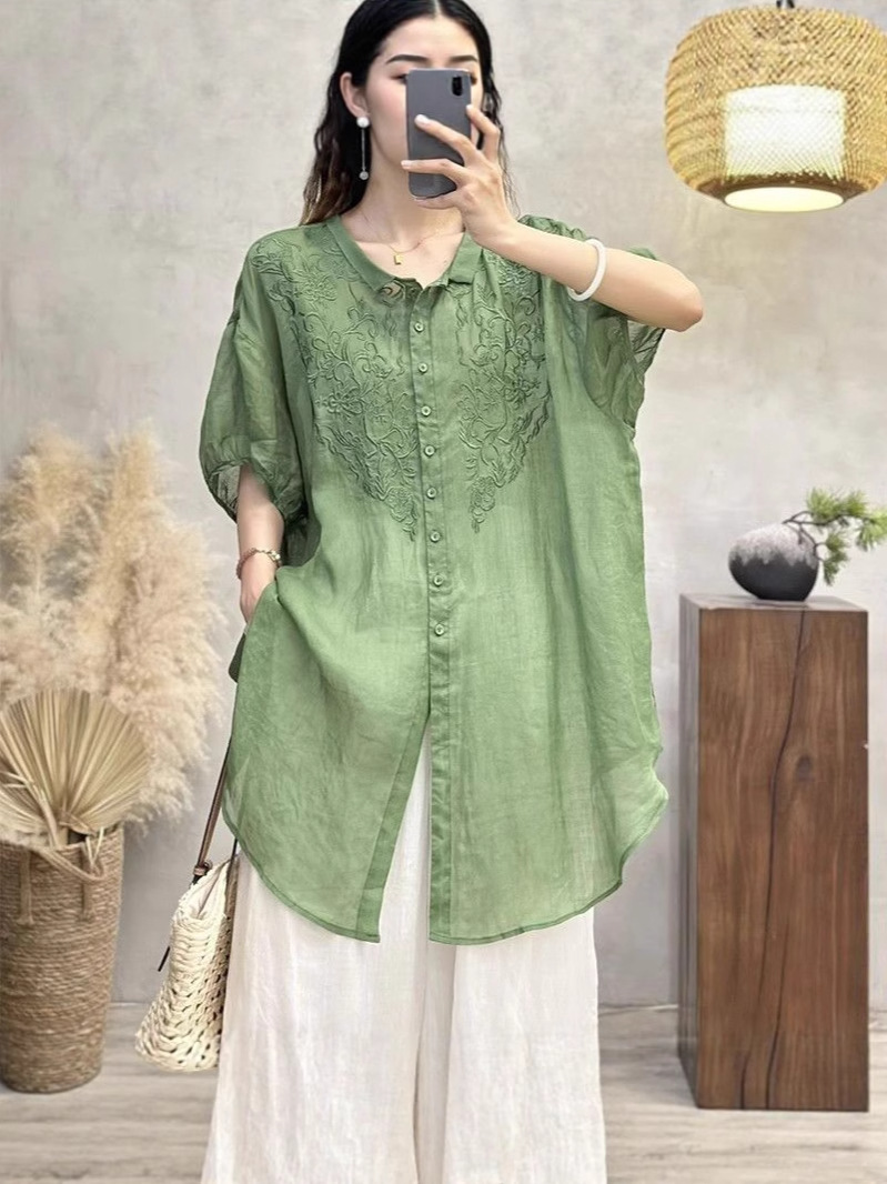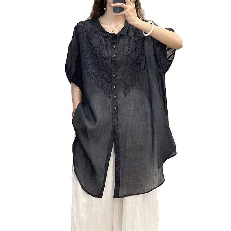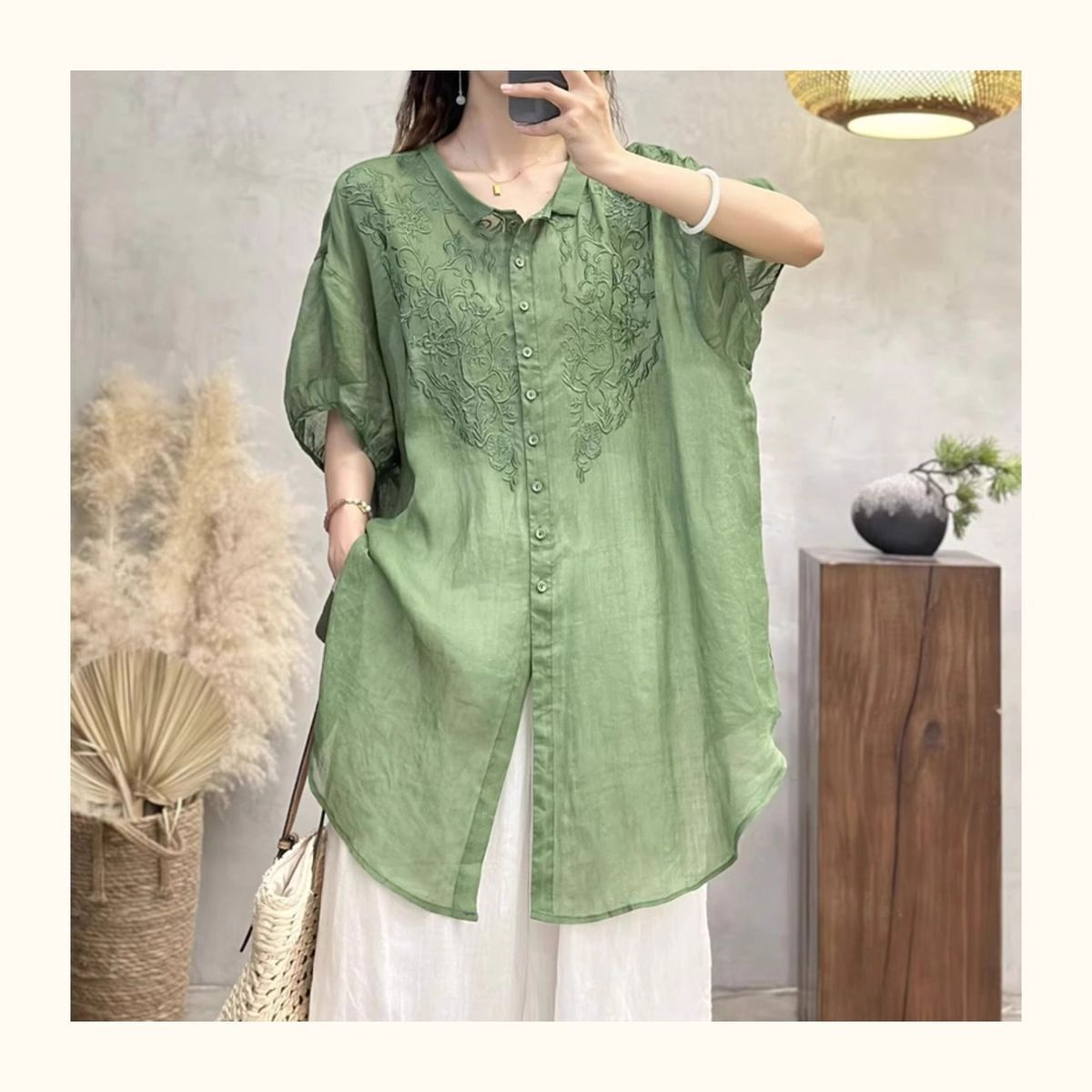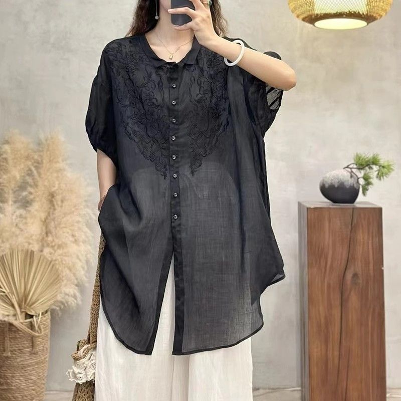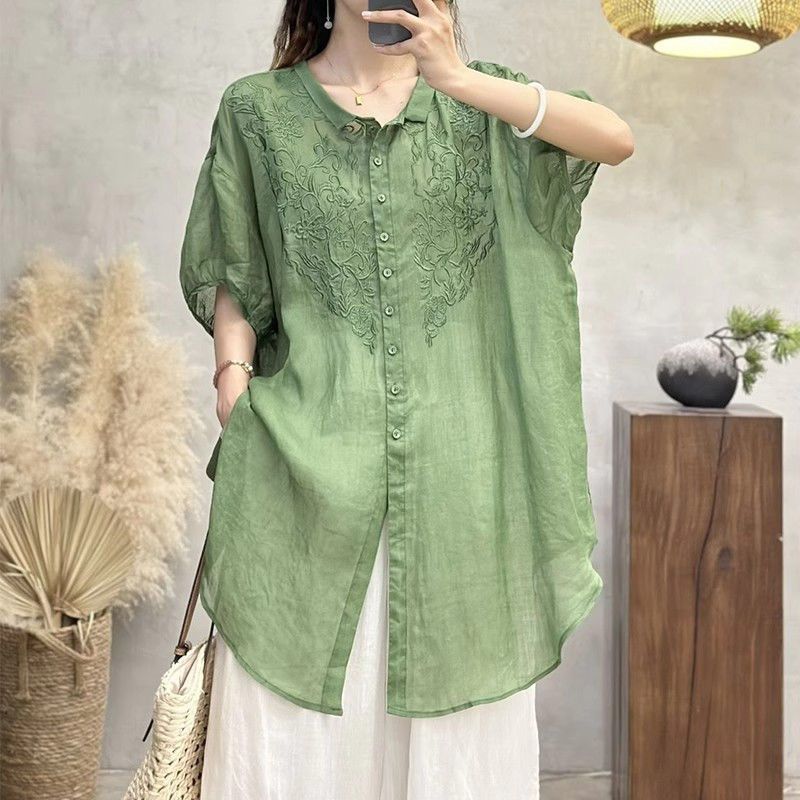 여성을위한 수 놓은 코튼 린넨 반팔 셔츠 2025 여름 중간 길이 느슨한 슬림 캐주얼 얇은 탑 여성
