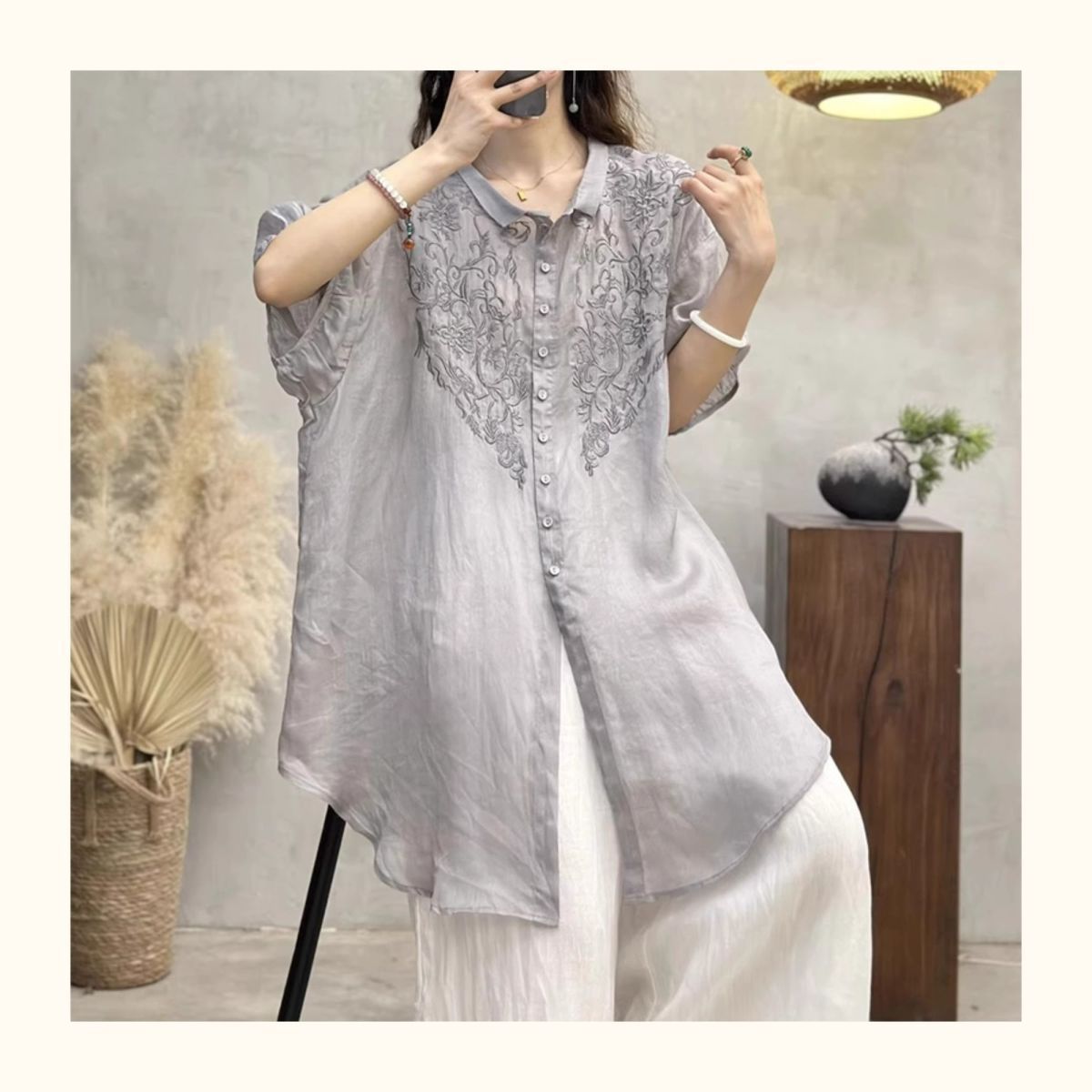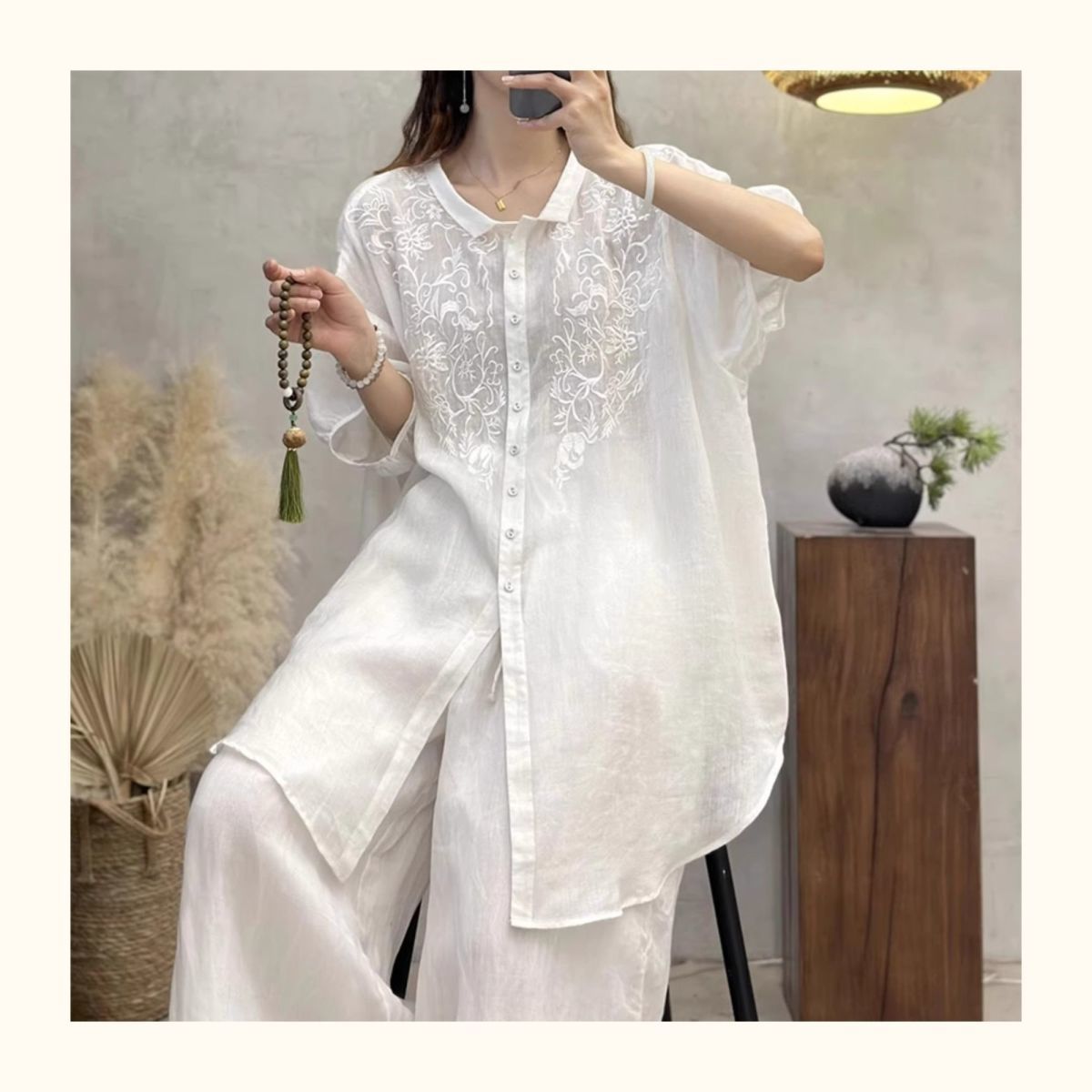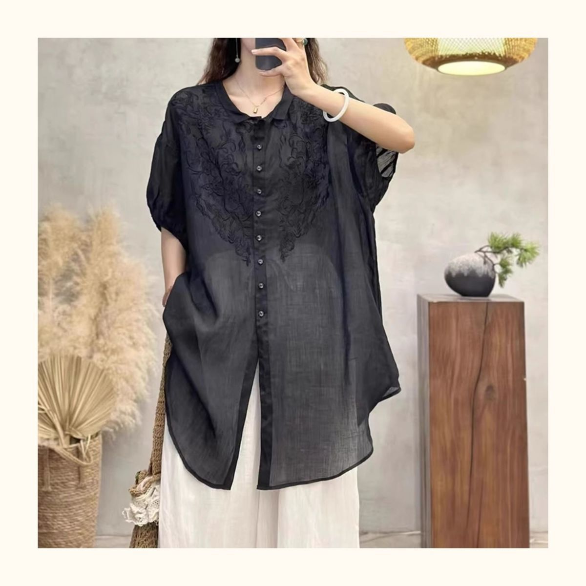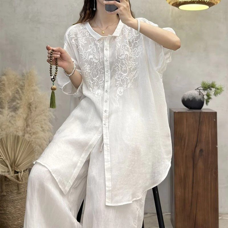 여성을위한 수 놓은 코튼 린넨 반팔 셔츠 2025 여름 중간 길이 느슨한 슬림 캐주얼 얇은 탑 여성
