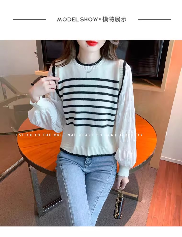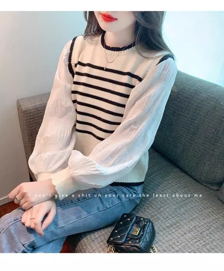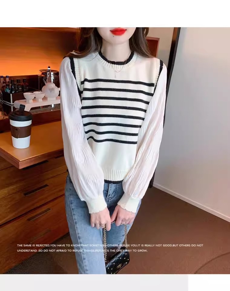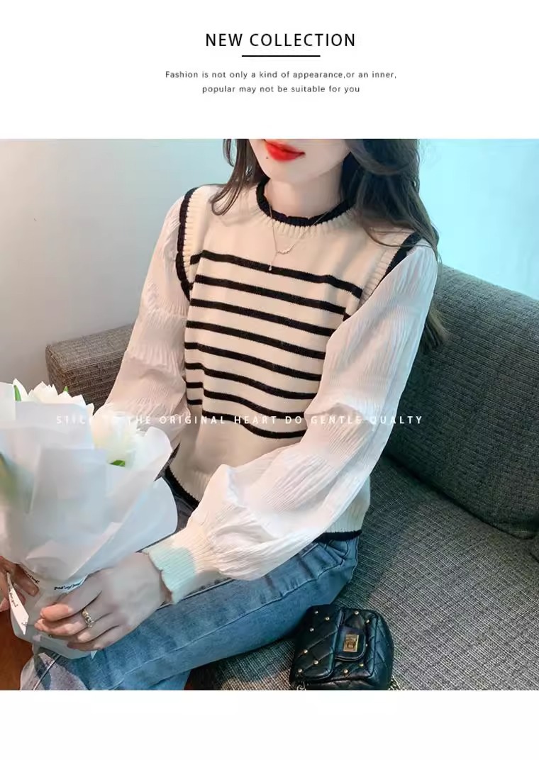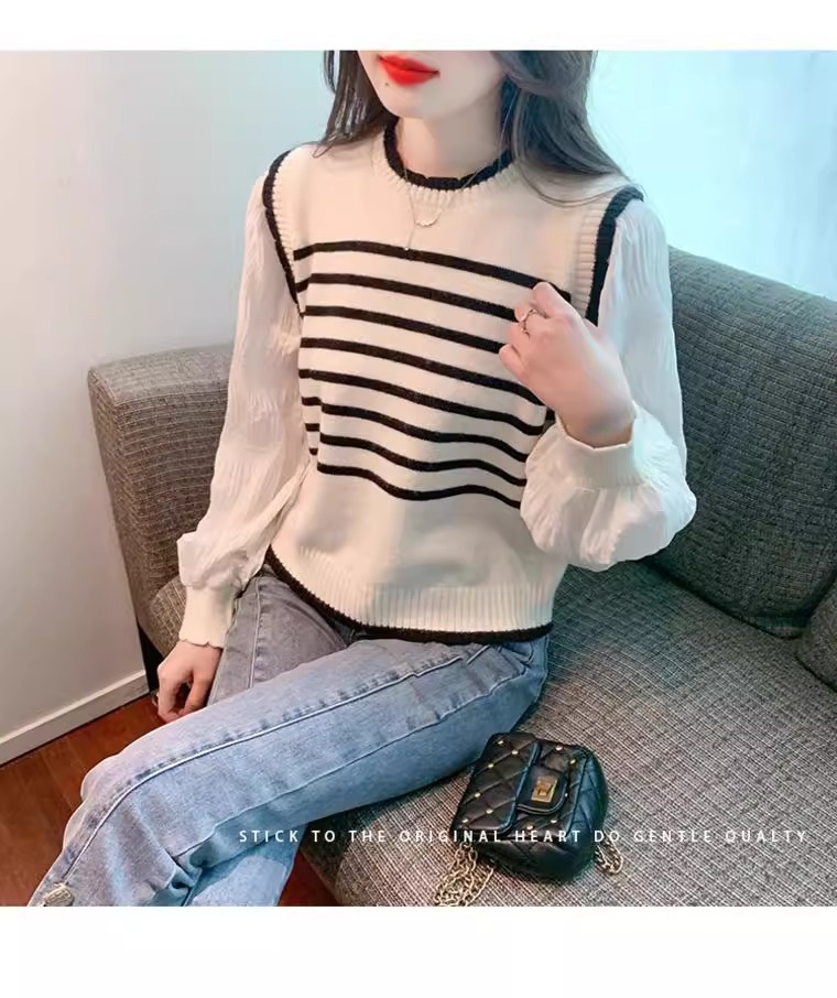 여성용 가짜 투피스 니트 바닥 셔츠 2025 봄 신작 스트라이프 긴팔 티셔츠 인기 쉬폰 탑스토어 가기