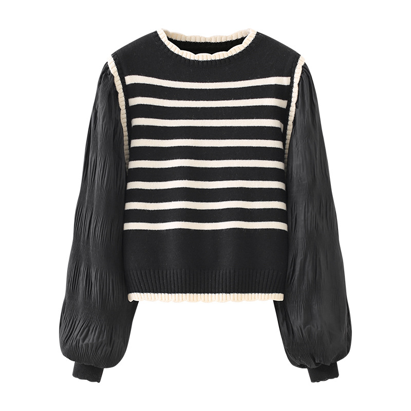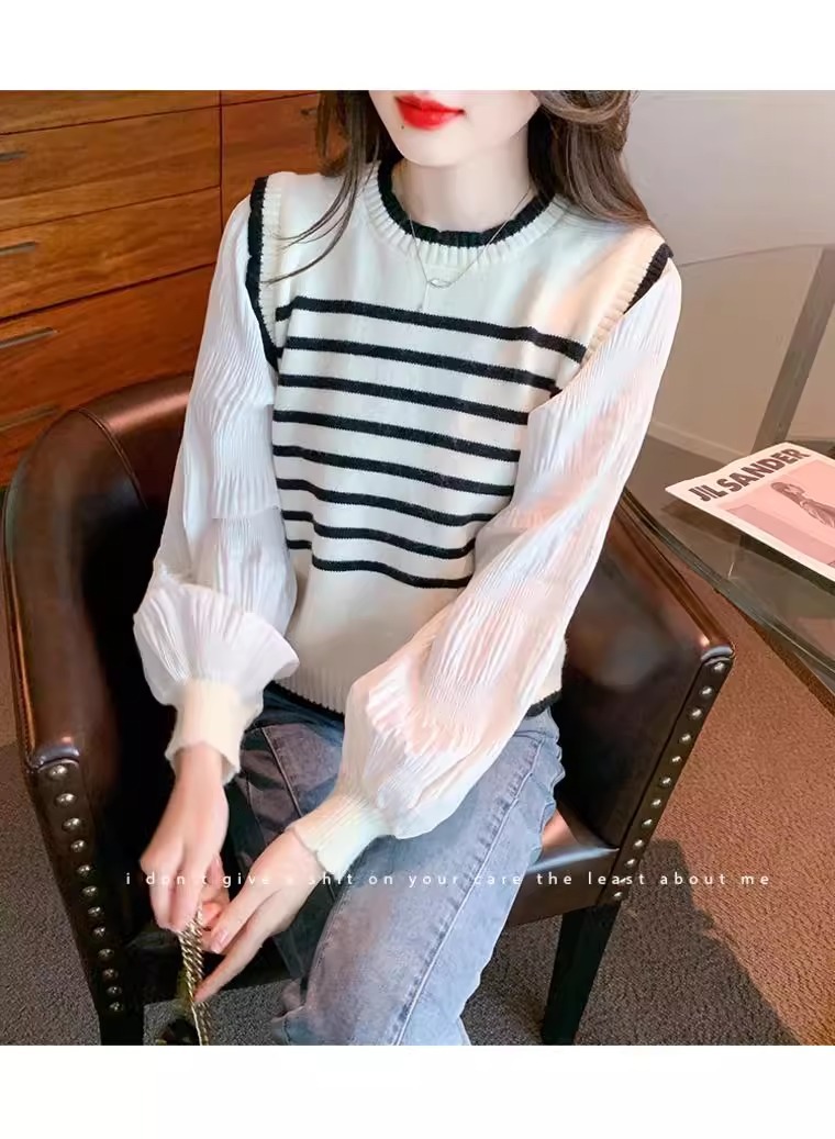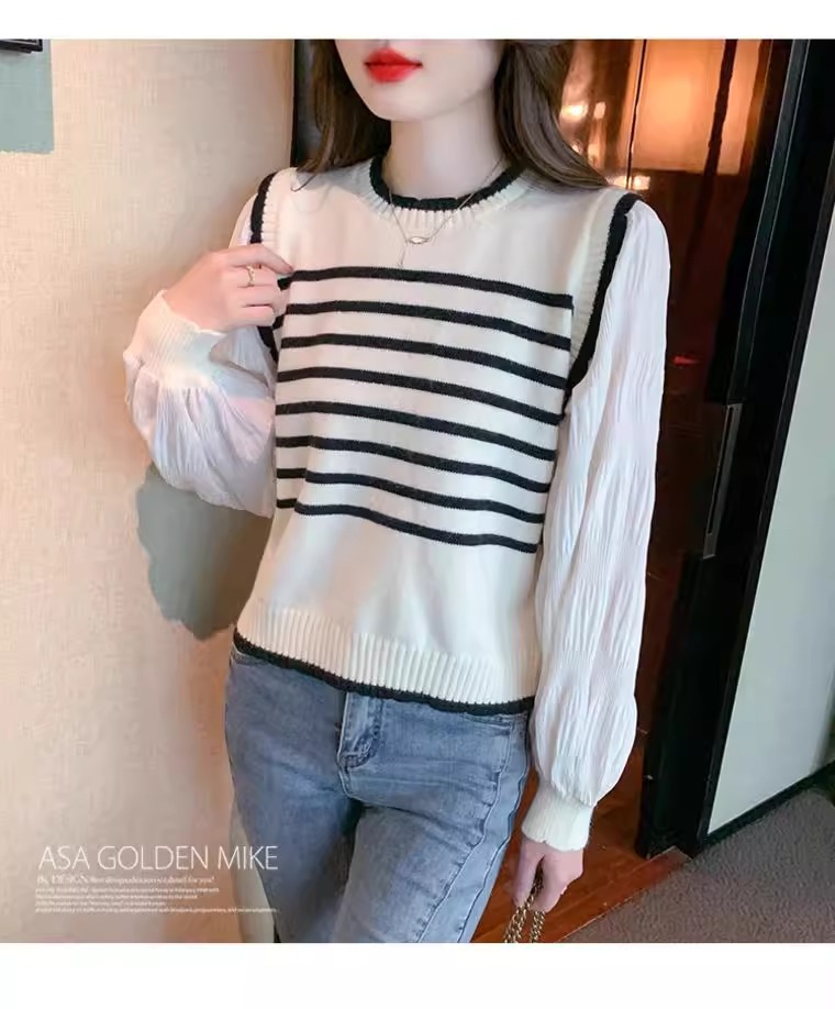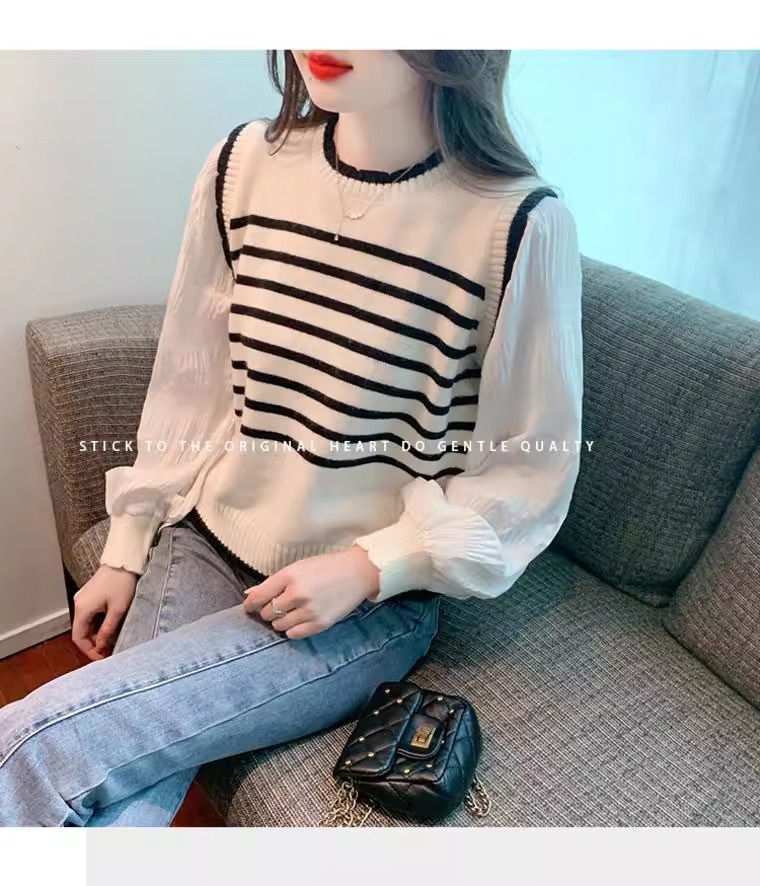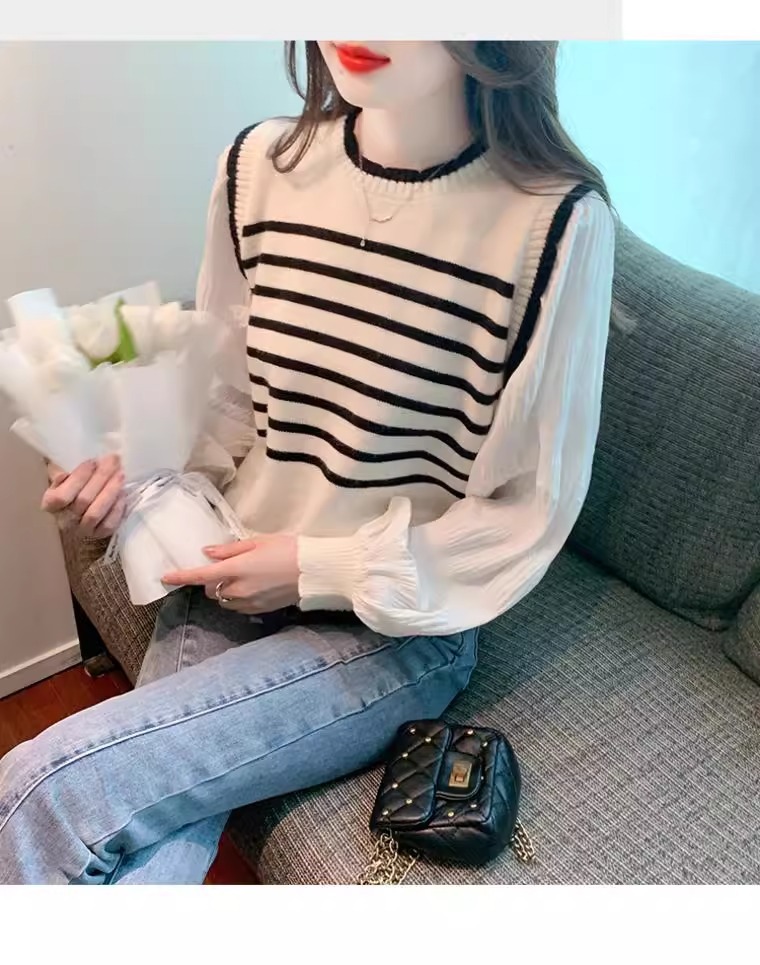 여성용 가짜 투피스 니트 바닥 셔츠 2025 봄 신작 스트라이프 긴팔 티셔츠 인기 쉬폰 탑스토어 가기