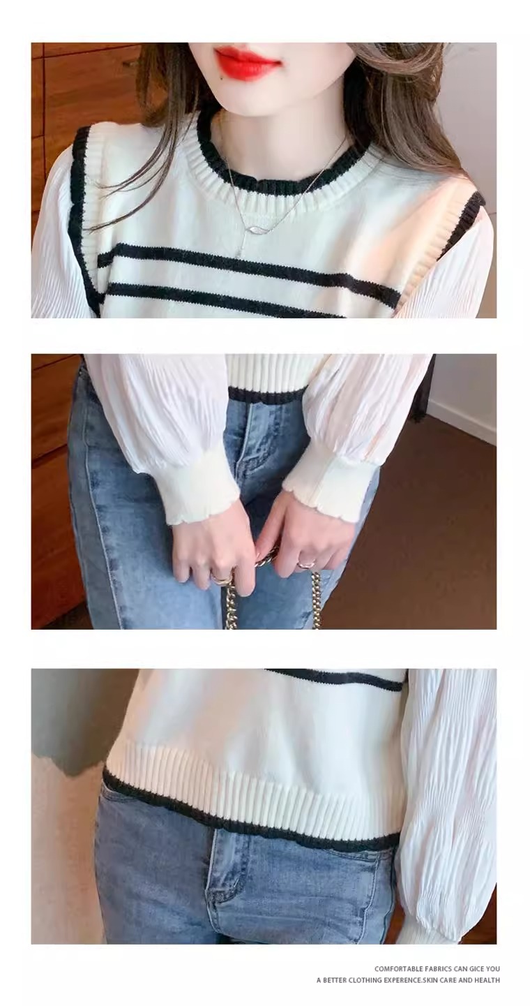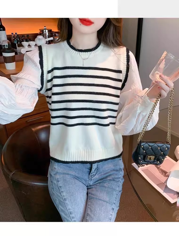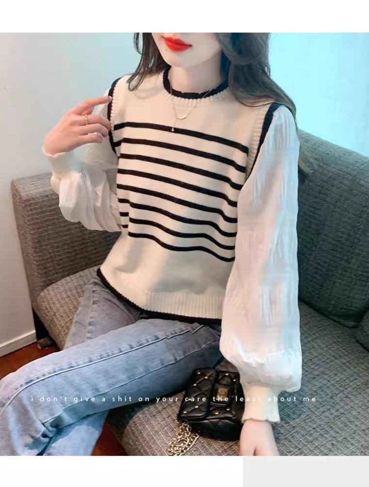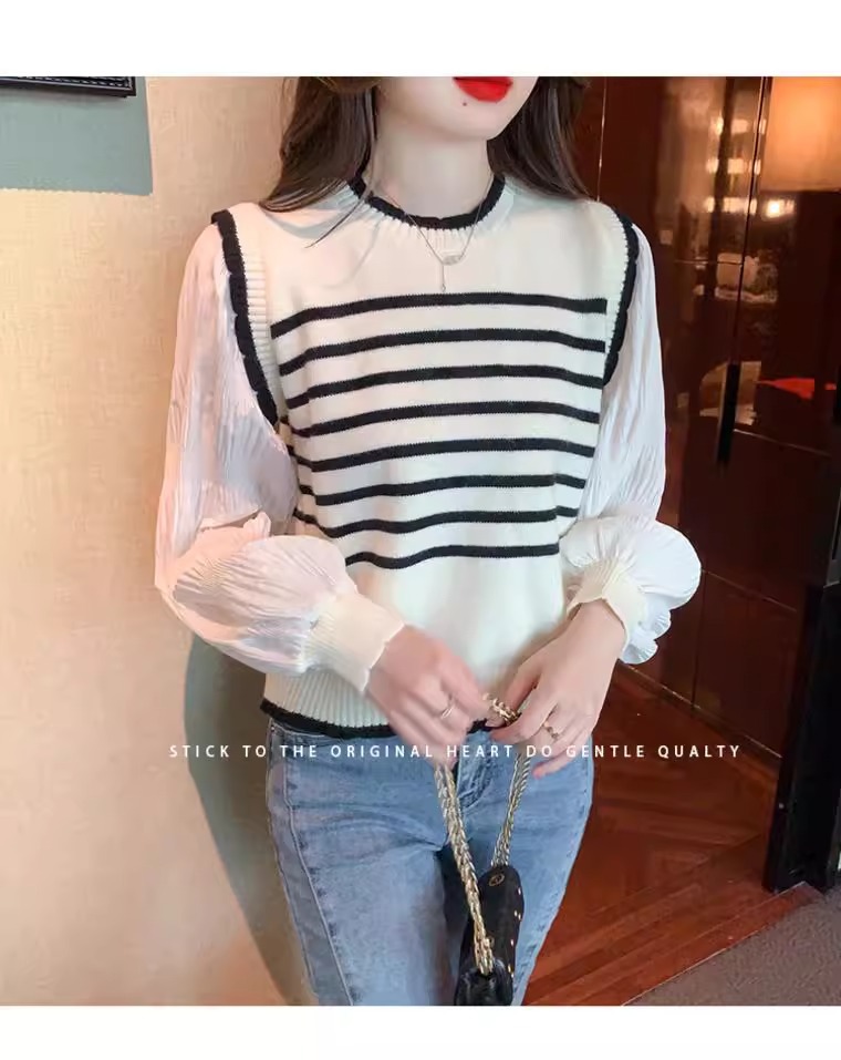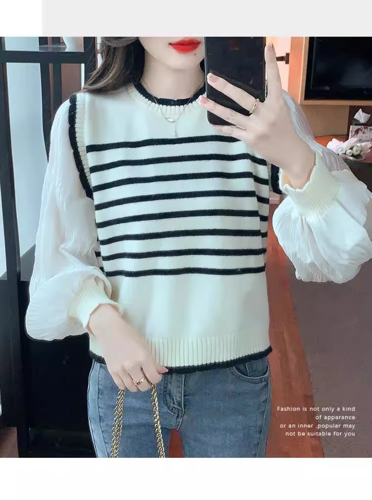 여성용 가짜 투피스 니트 바닥 셔츠 2025 봄 신작 스트라이프 긴팔 티셔츠 인기 쉬폰 탑