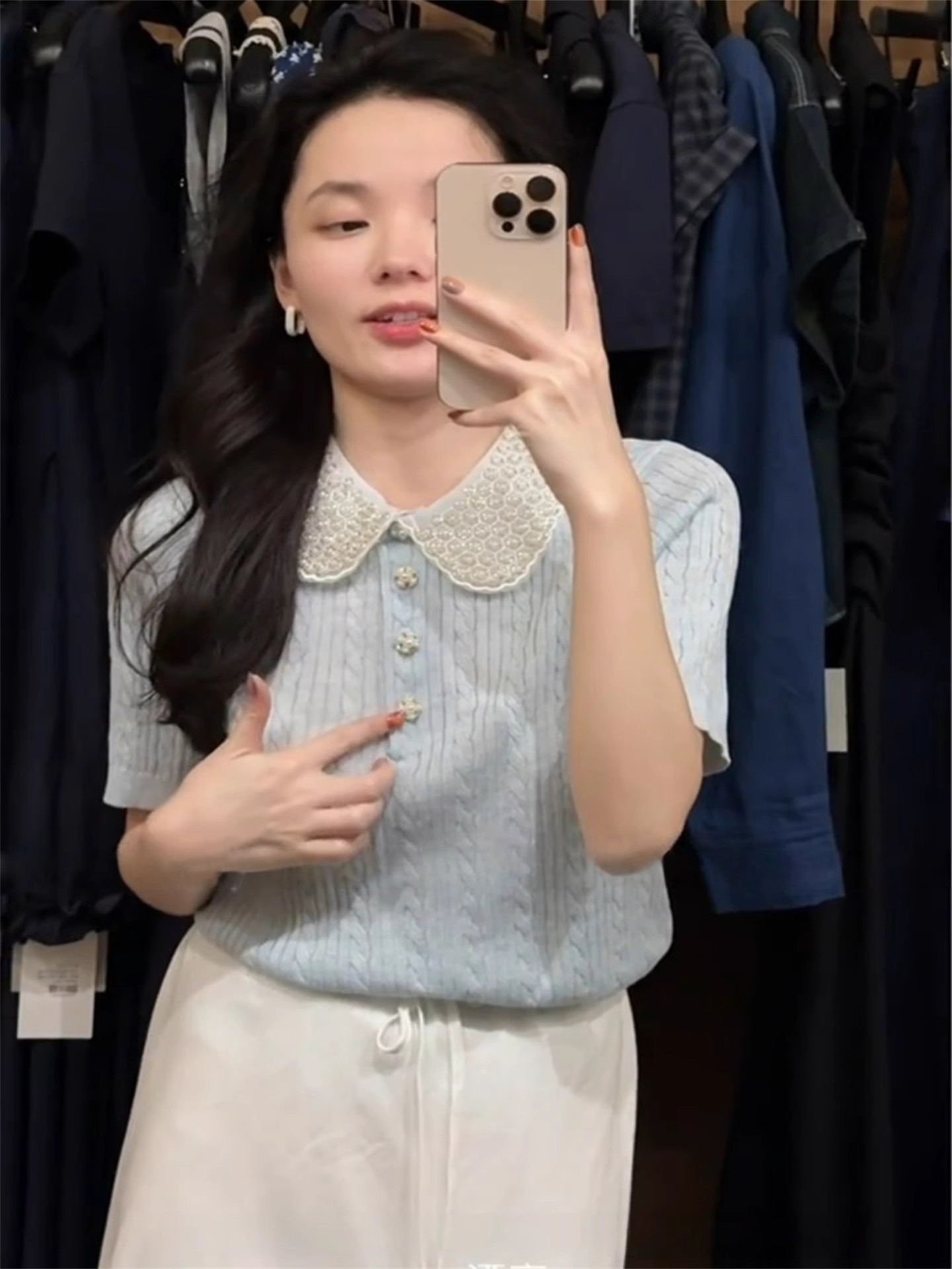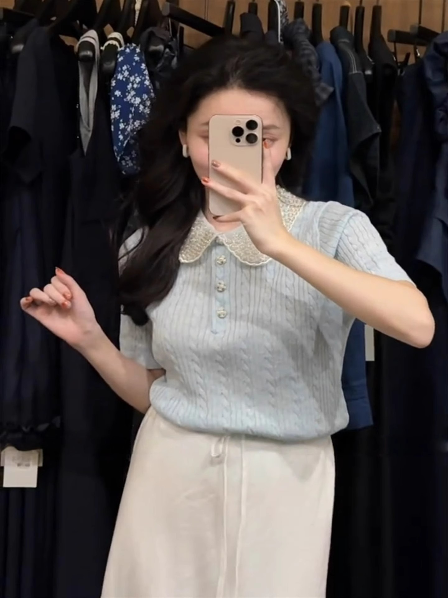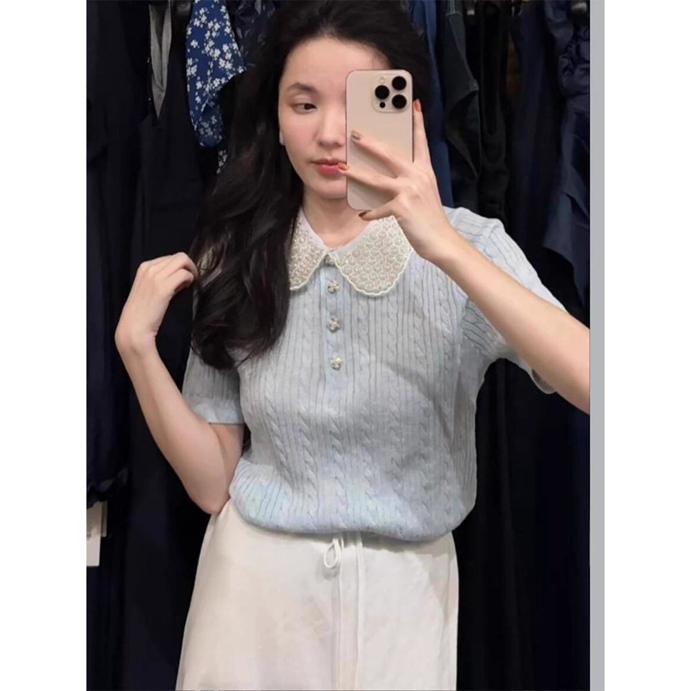 여름 여성용 블루 비즈 인형 칼라 니트 반팔 티셔츠, 독특하고 아름다운 라펠 탑스토어 가기