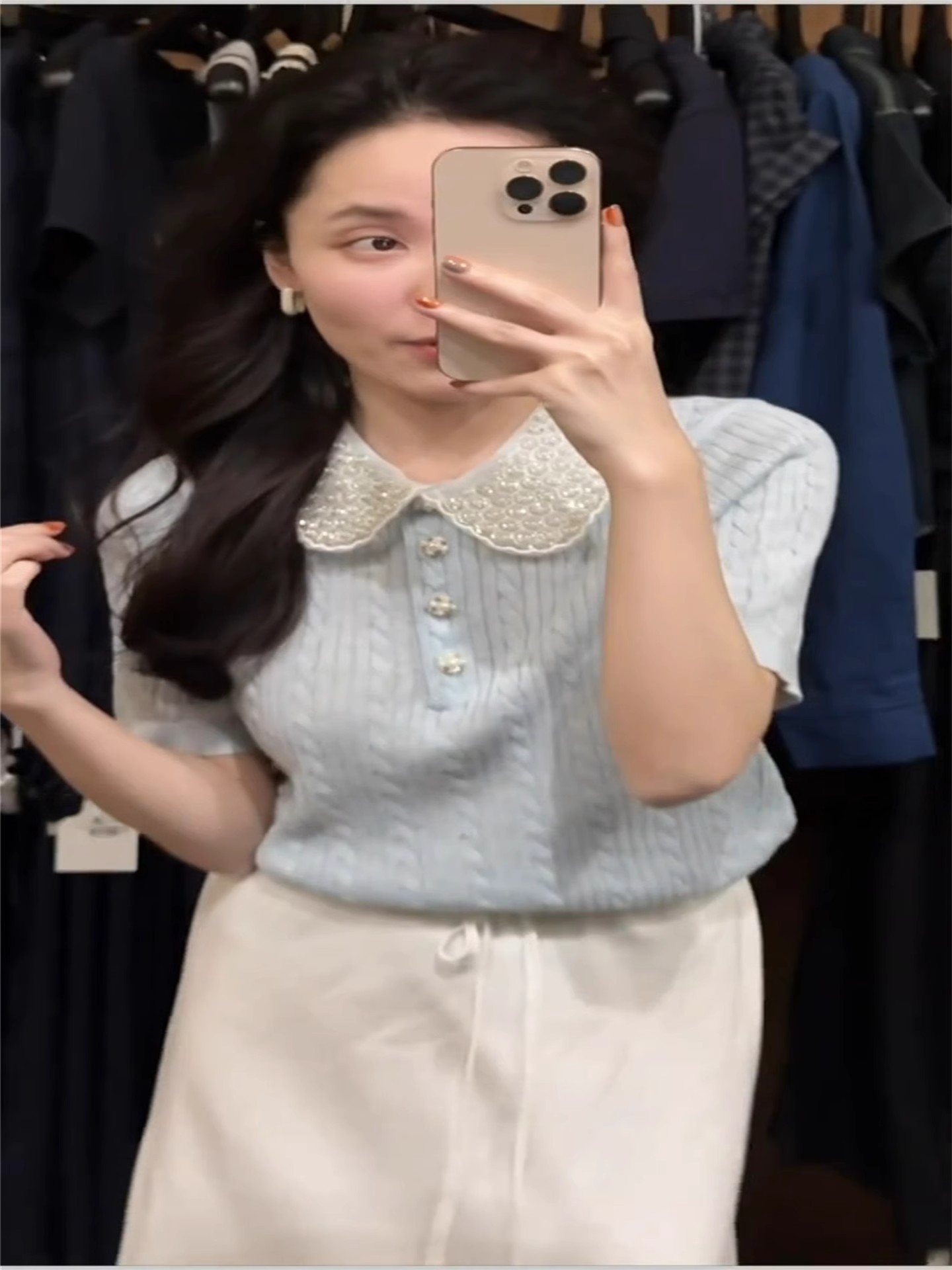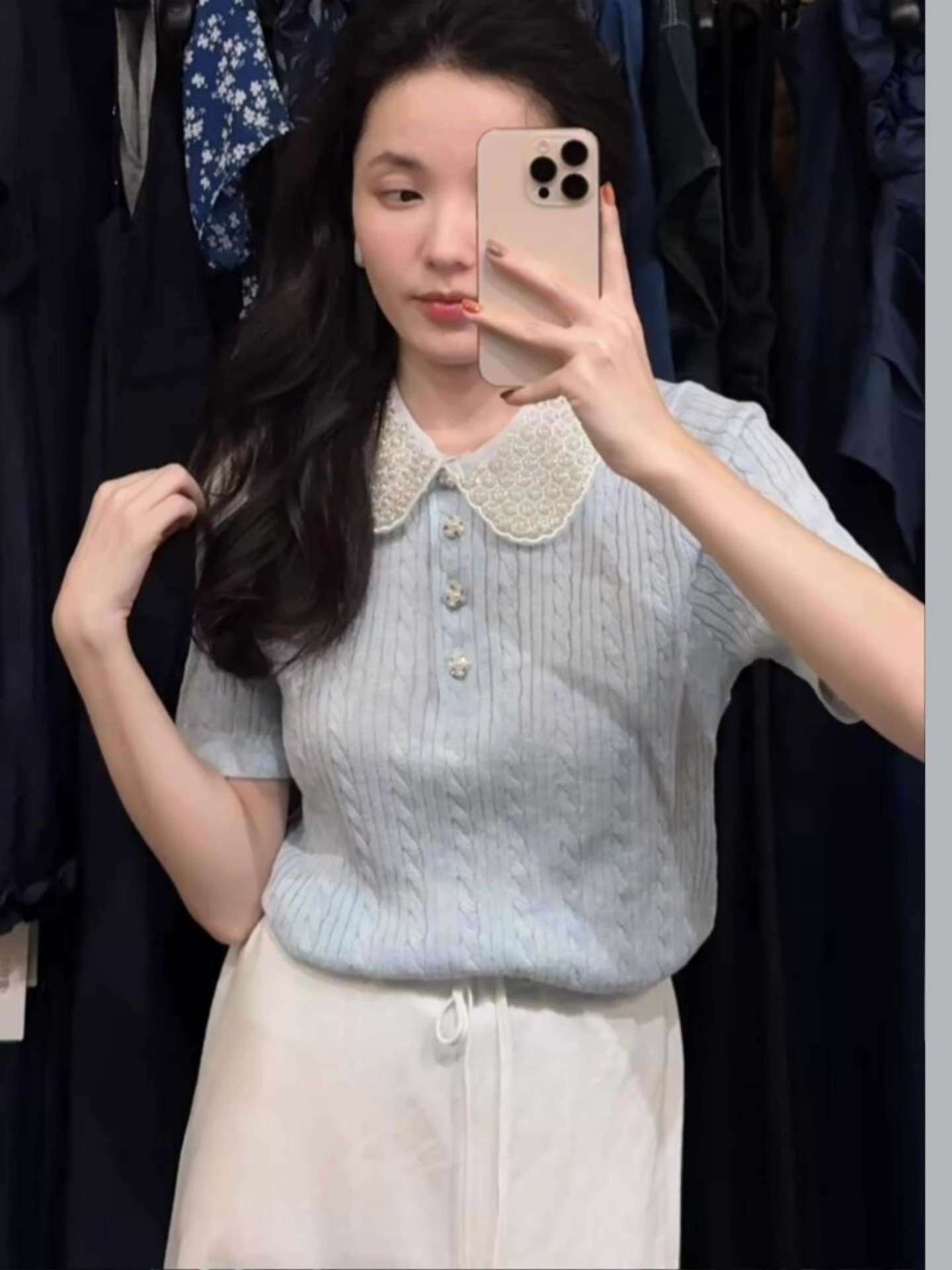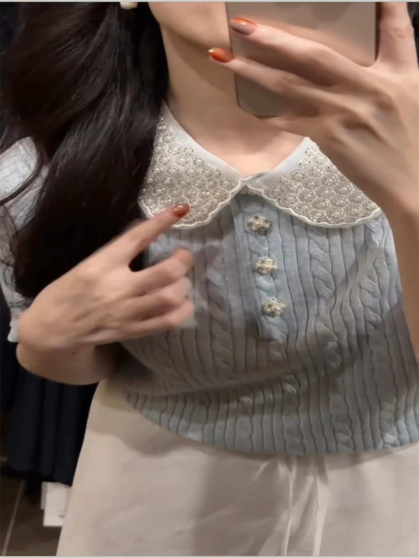 여름 여성용 블루 비즈 인형 칼라 니트 반팔 티셔츠, 독특하고 아름다운 라펠 탑스토어 가기