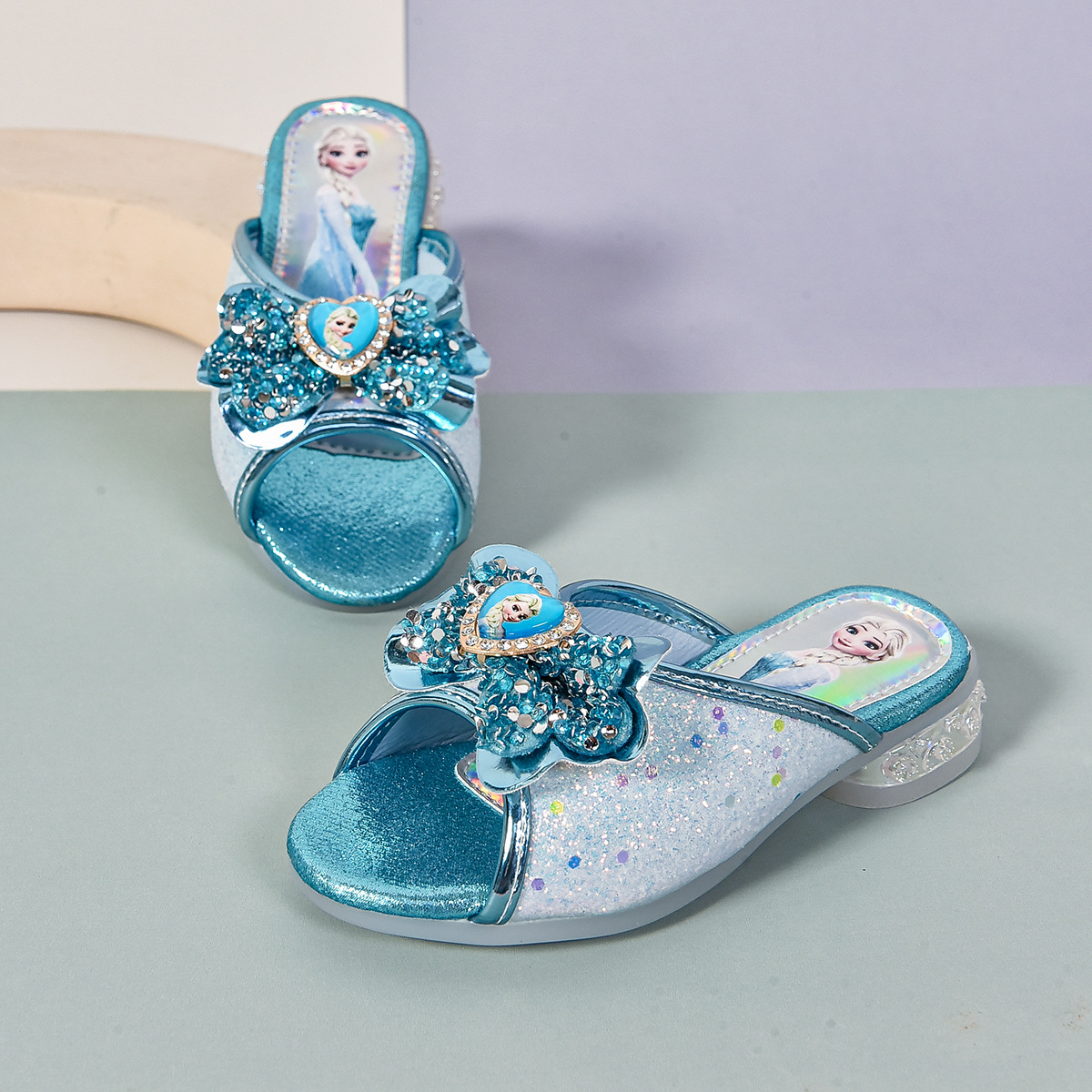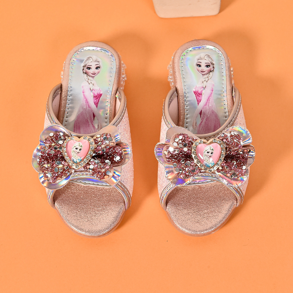 패션 소녀 슬리퍼 2025 여름 한국 스타일 소녀 엘사 공주 밝은 다이아몬드 보우 슬리퍼 하이힐 유행