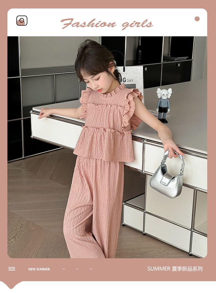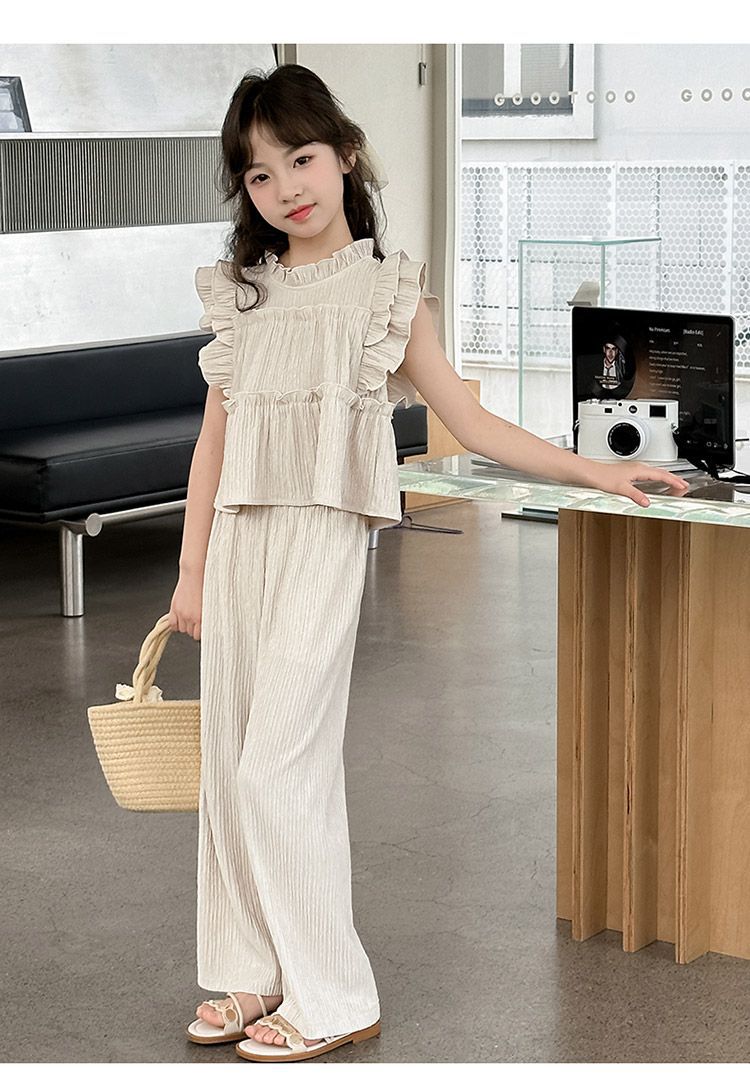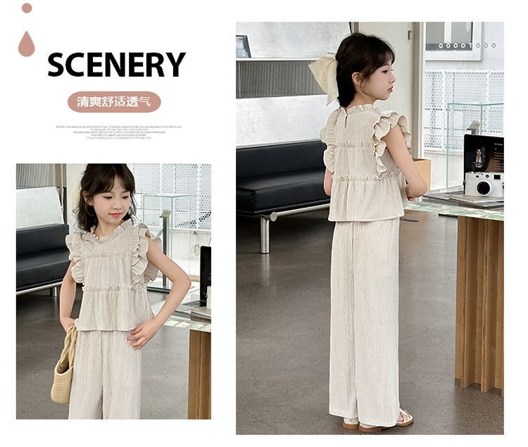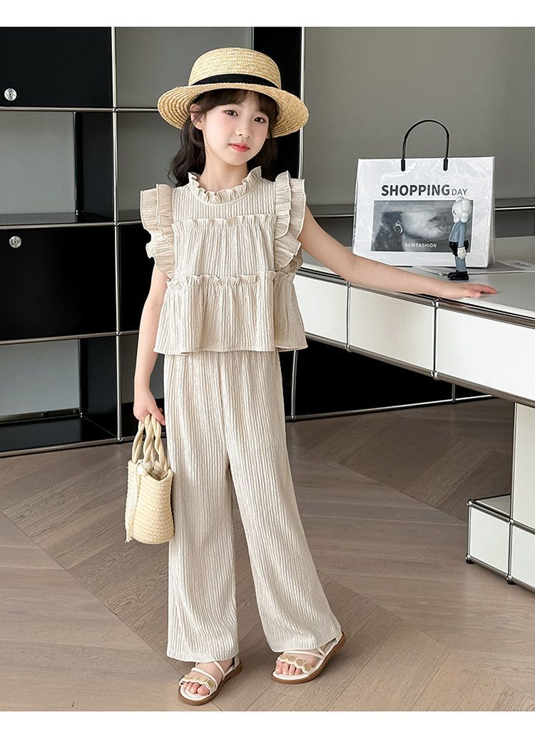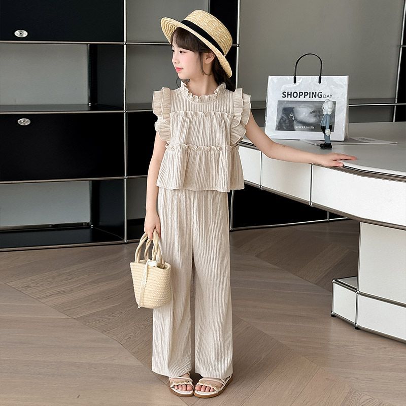 여자 민소매 양복 여름 옷 2025 여름 새로운 한국 스타일 어린이 쉬폰 모기 방지 와이드 팬츠 투피스 세트스토어 가기