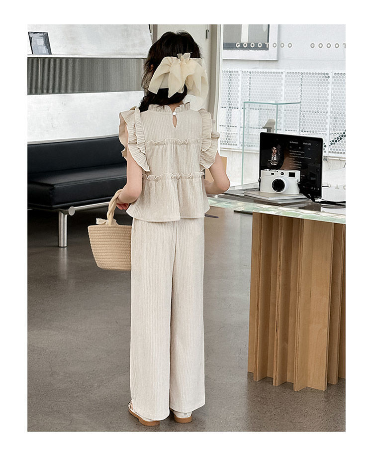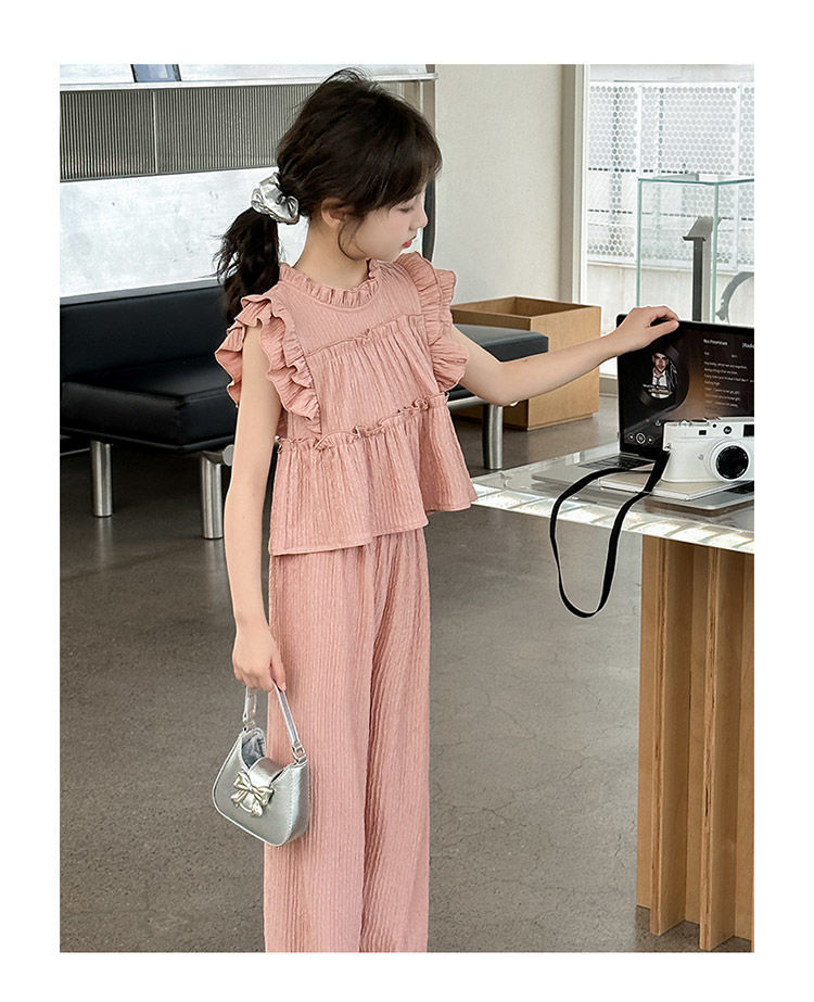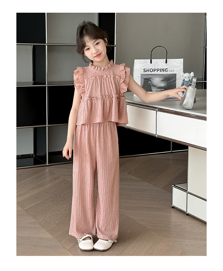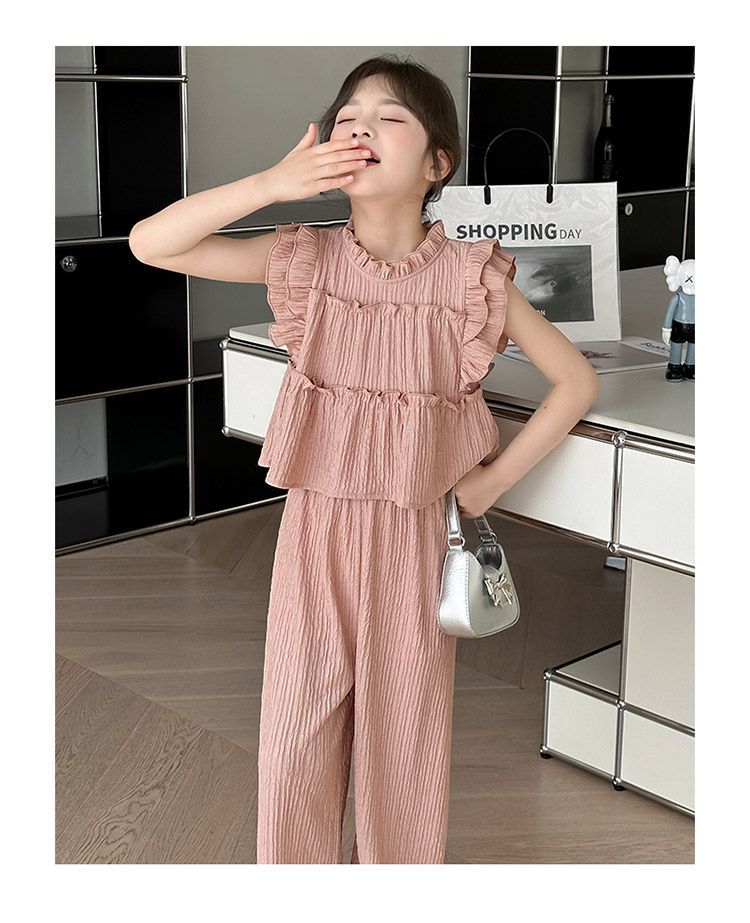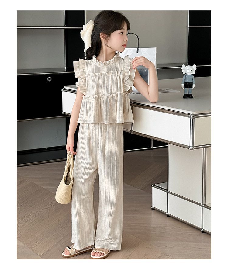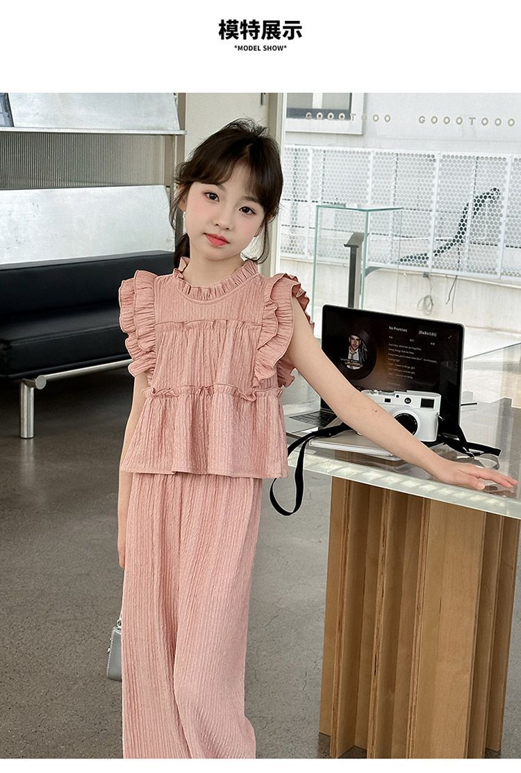 여자 민소매 양복 여름 옷 2025 여름 새로운 한국 스타일 어린이 쉬폰 모기 방지 와이드 팬츠 투피스 세트스토어 가기