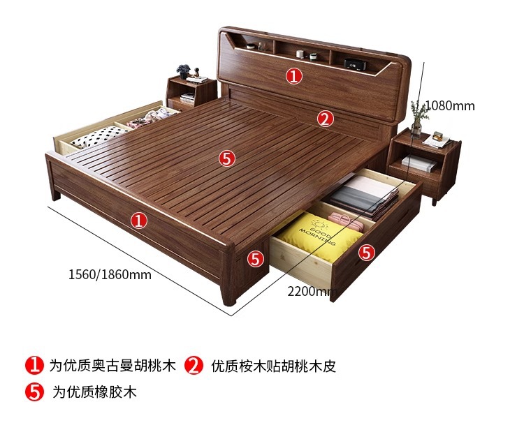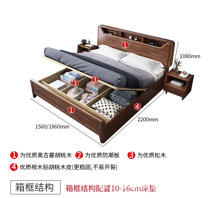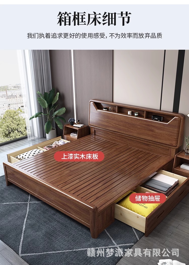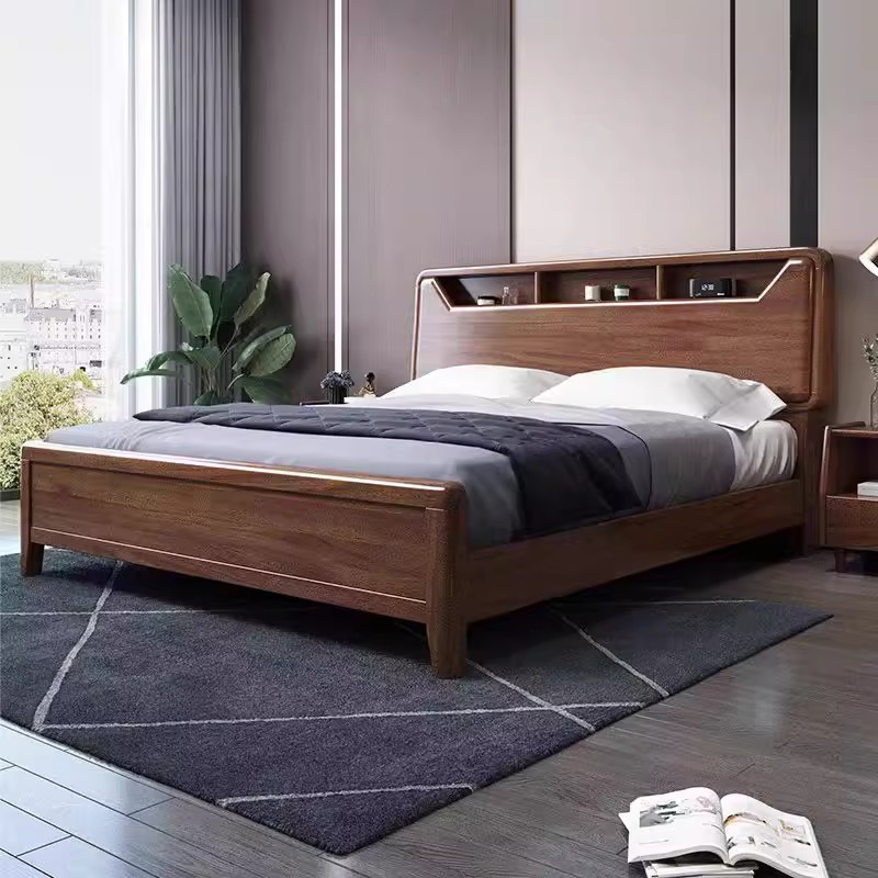 단단한 나무 침대 현대적인 미니멀리스트 호두나무 2m × 2.2m 대형 침대 새로운 중국 스타일 1.8m 마스터 침실 더블 수납 웨딩 침대