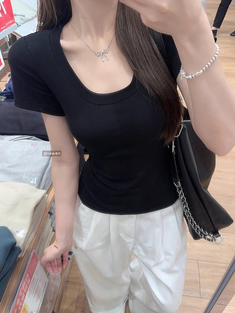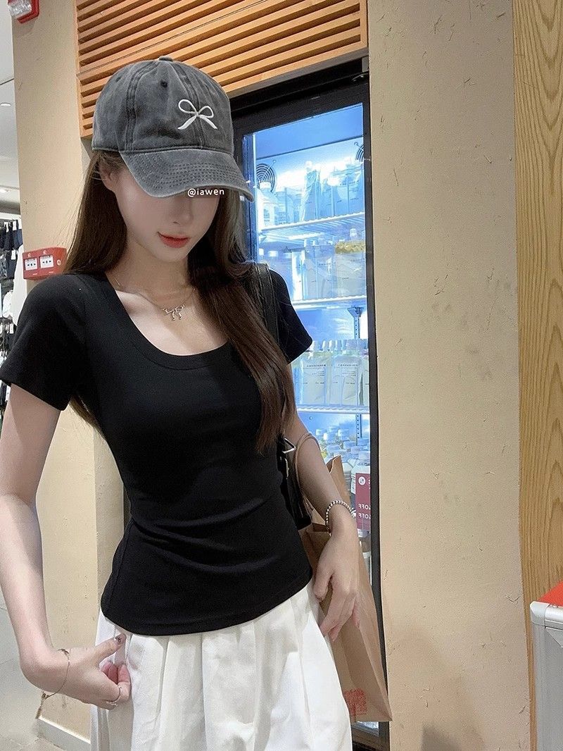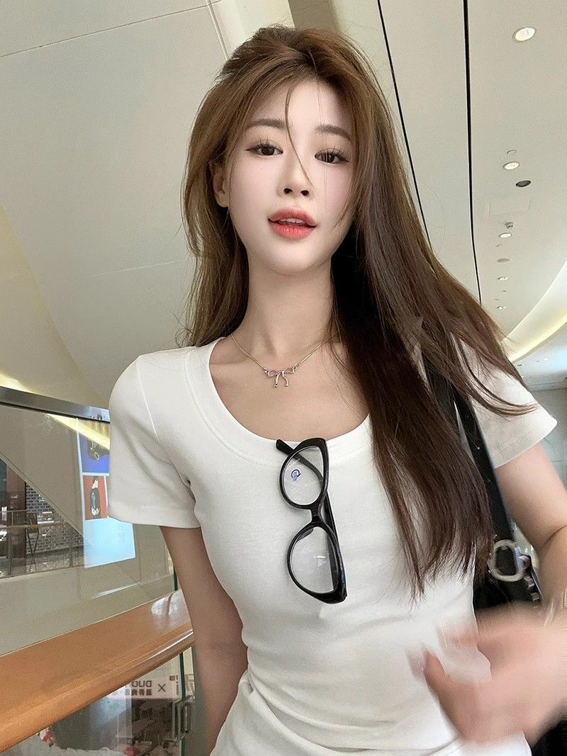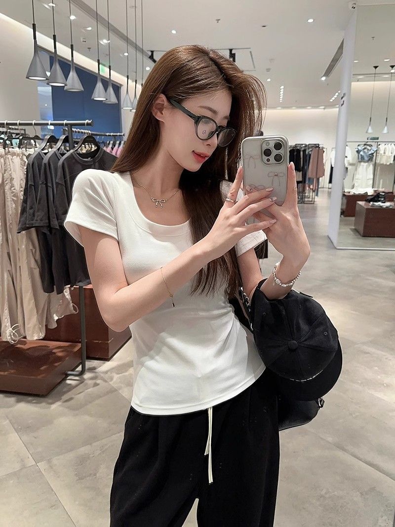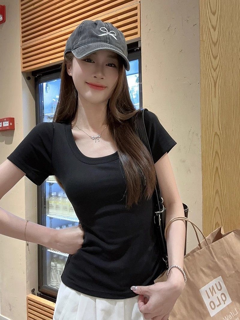 유넥 슬림핏 반팔 여성 2025 여름 신상 한국 스타일 티셔츠 화이트 숄더라인 기본 셔츠 수출용 여성 상의스토어 가기