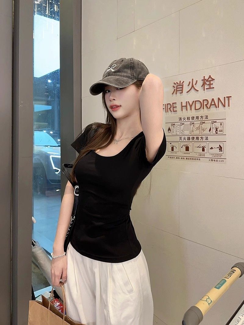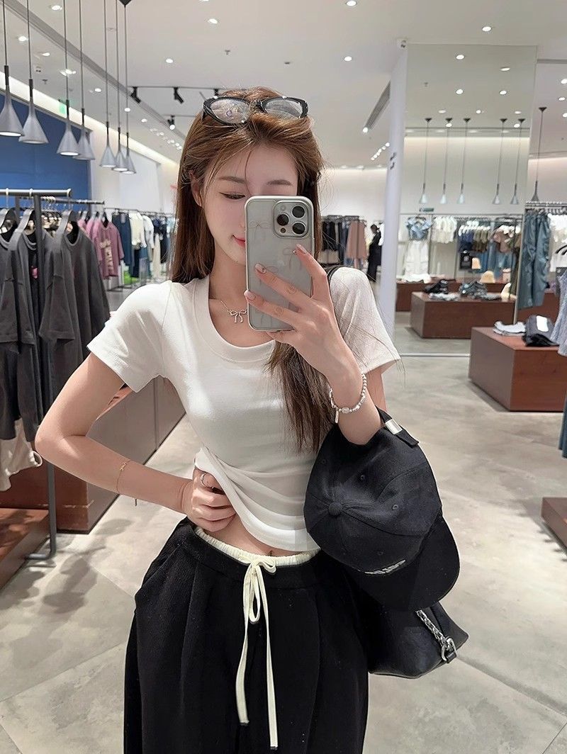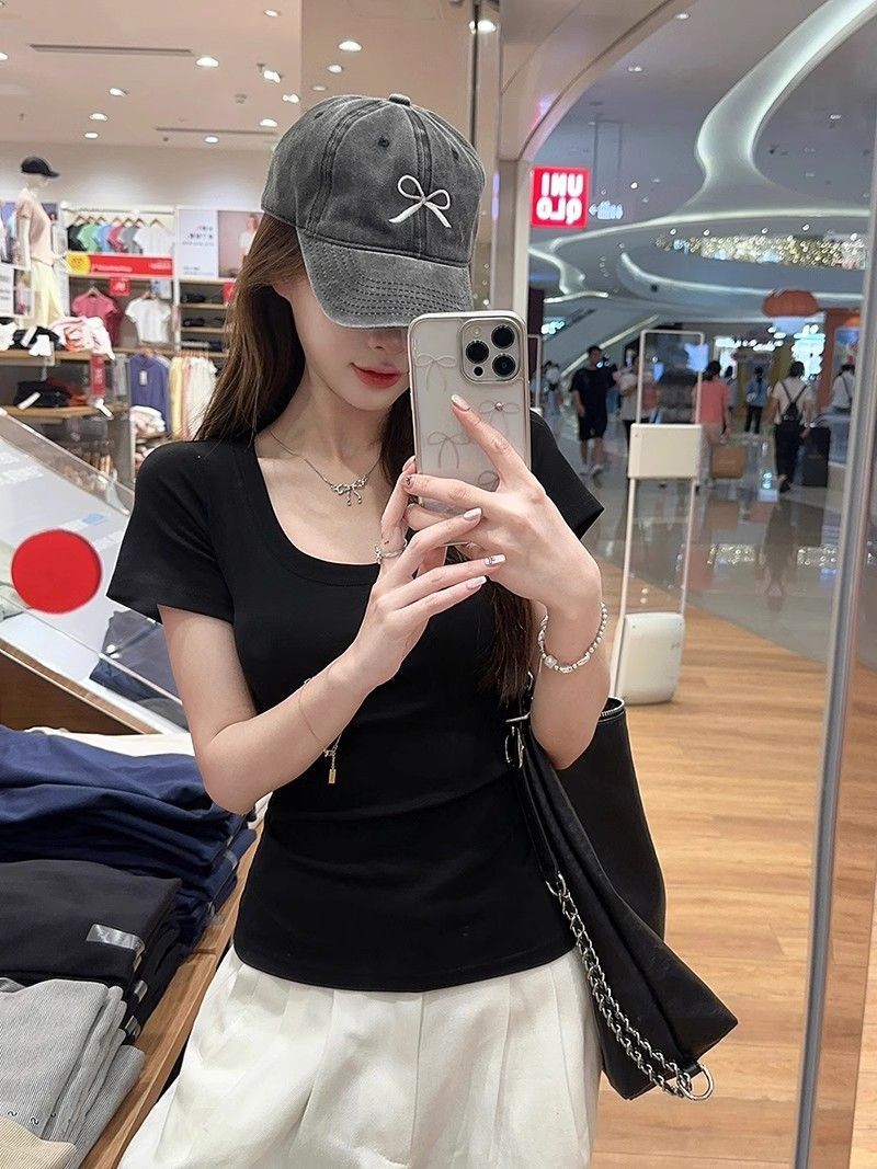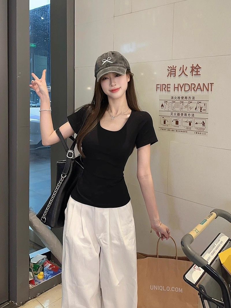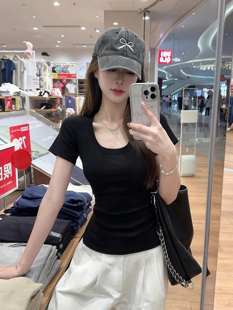 유넥 슬림핏 반팔 여성 2025 여름 신상 한국 스타일 티셔츠 화이트 숄더라인 기본 셔츠 수출용 여성 상의스토어 가기