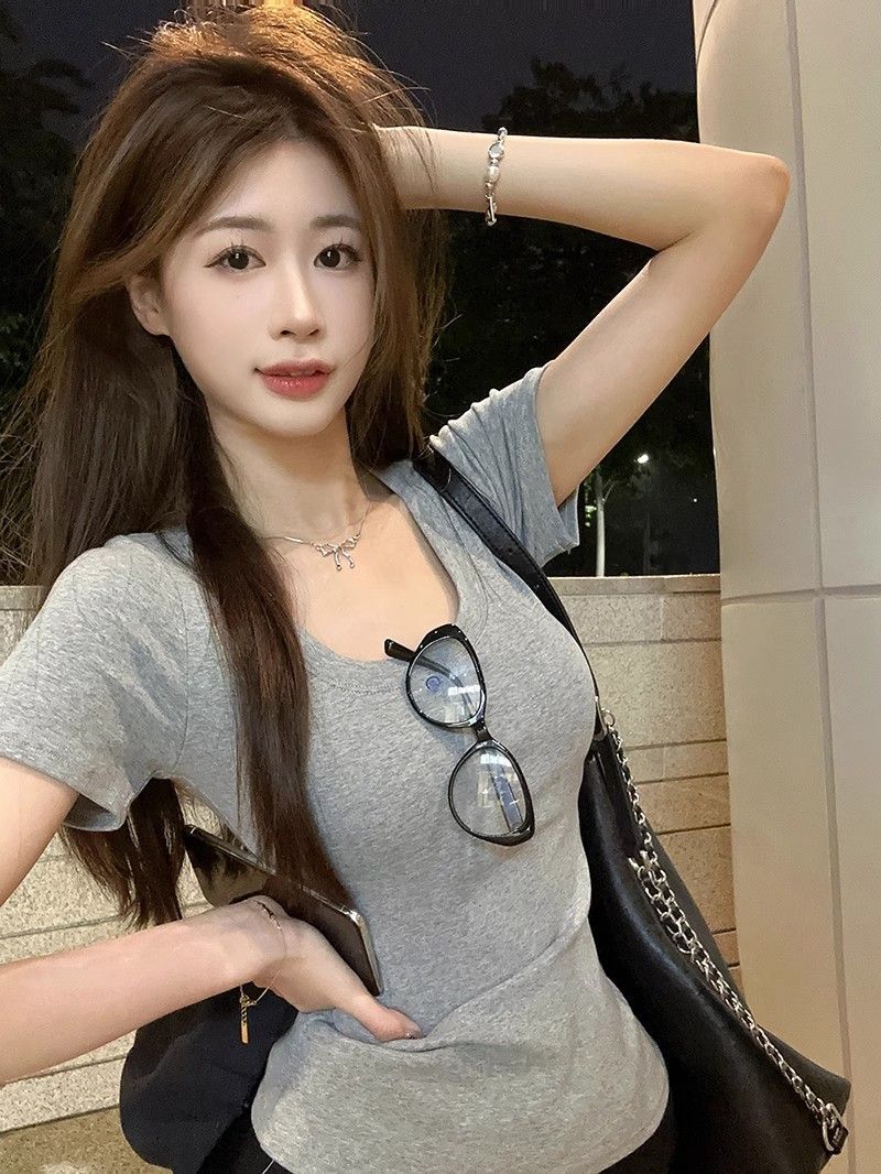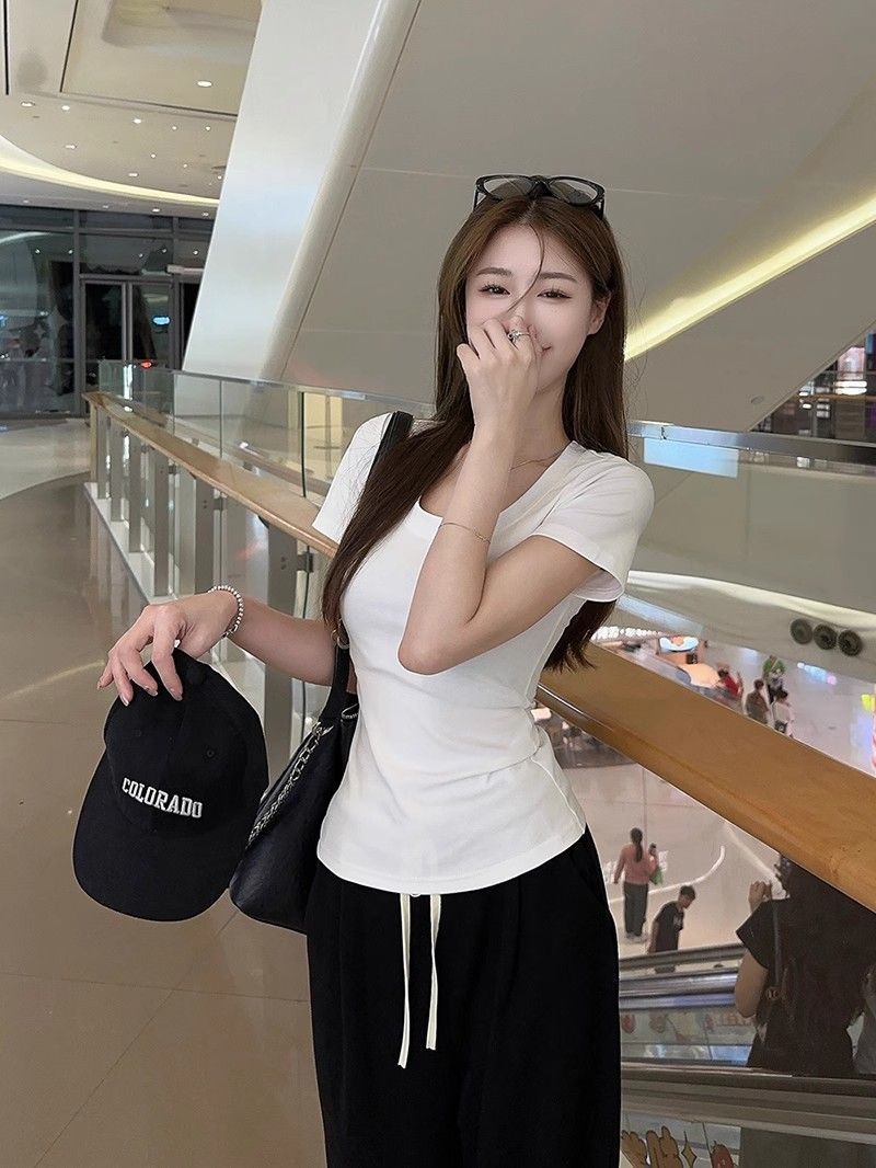 유넥 슬림핏 반팔 여성 2025 여름 신상 한국 스타일 티셔츠 화이트 숄더라인 기본 셔츠 수출용 여성 상의