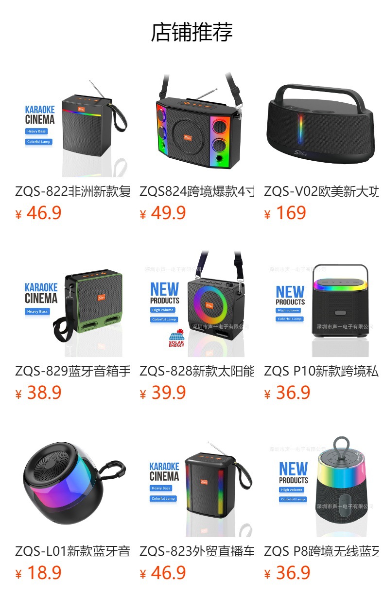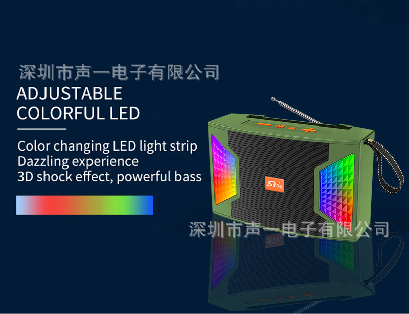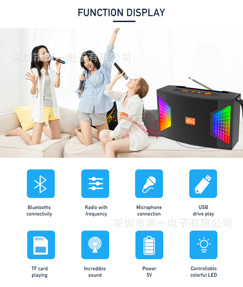 功能:蓝牙、FM、USB、TF、MIC、手机支架、RGB彩灯