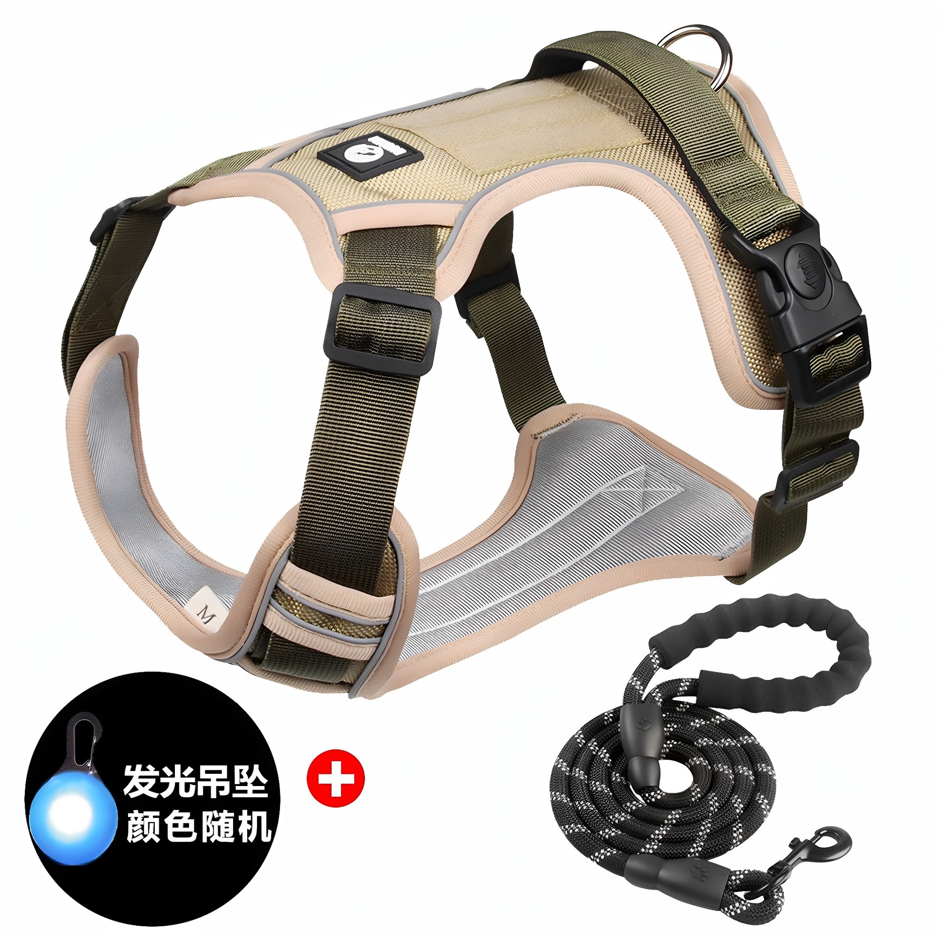 • 카키색 가슴 하네스 + 1.5m 반사 원형 로프 + LED 라이트