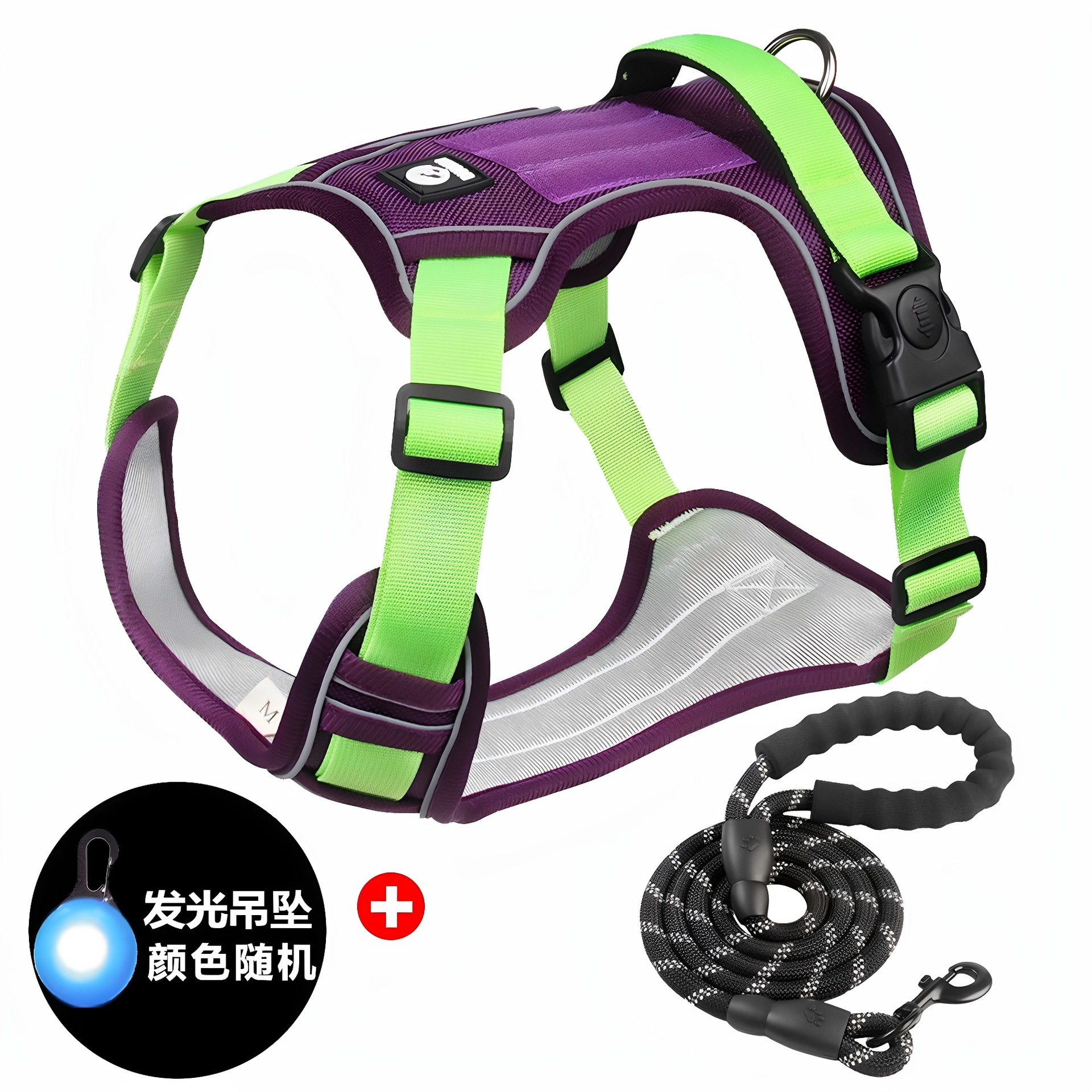• 보라색 가슴 하네스 + 1.5m 반사 원형 로프 + LED 라이트