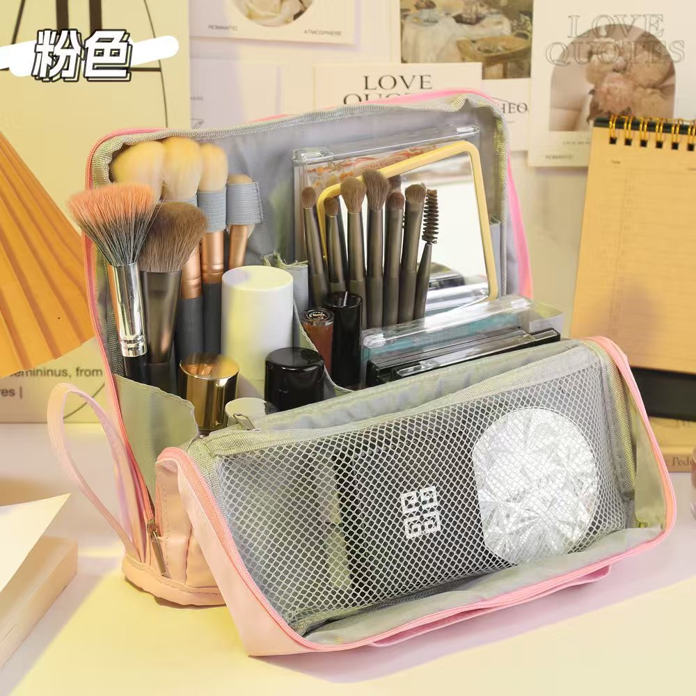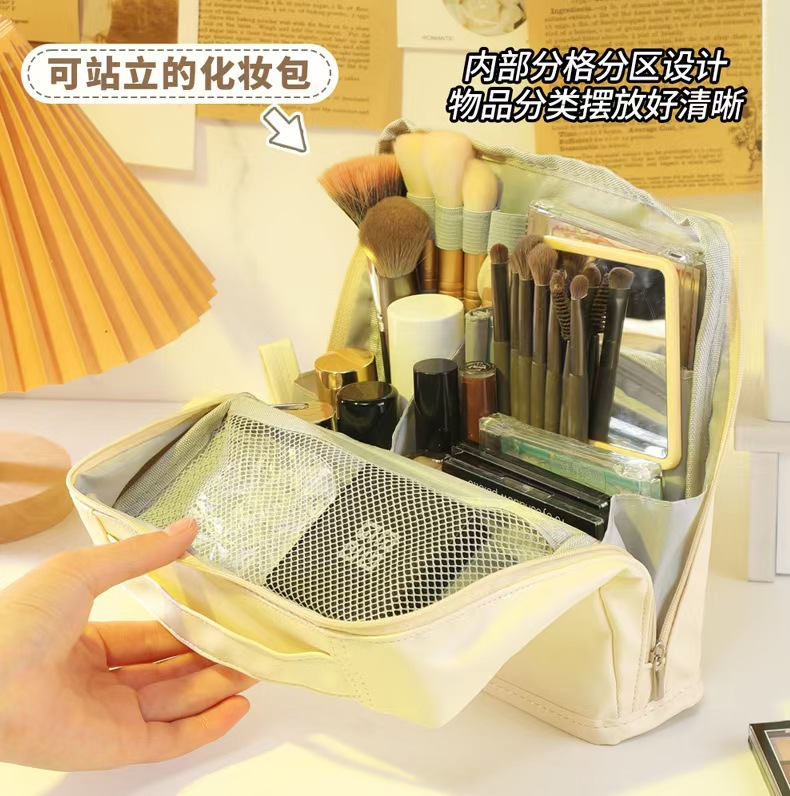 대용량 화장품 가방 PU 가죽 세로형 접이식 화장품 수납 가방 휴대용 여행용 세면도구 가방 세로형 수납