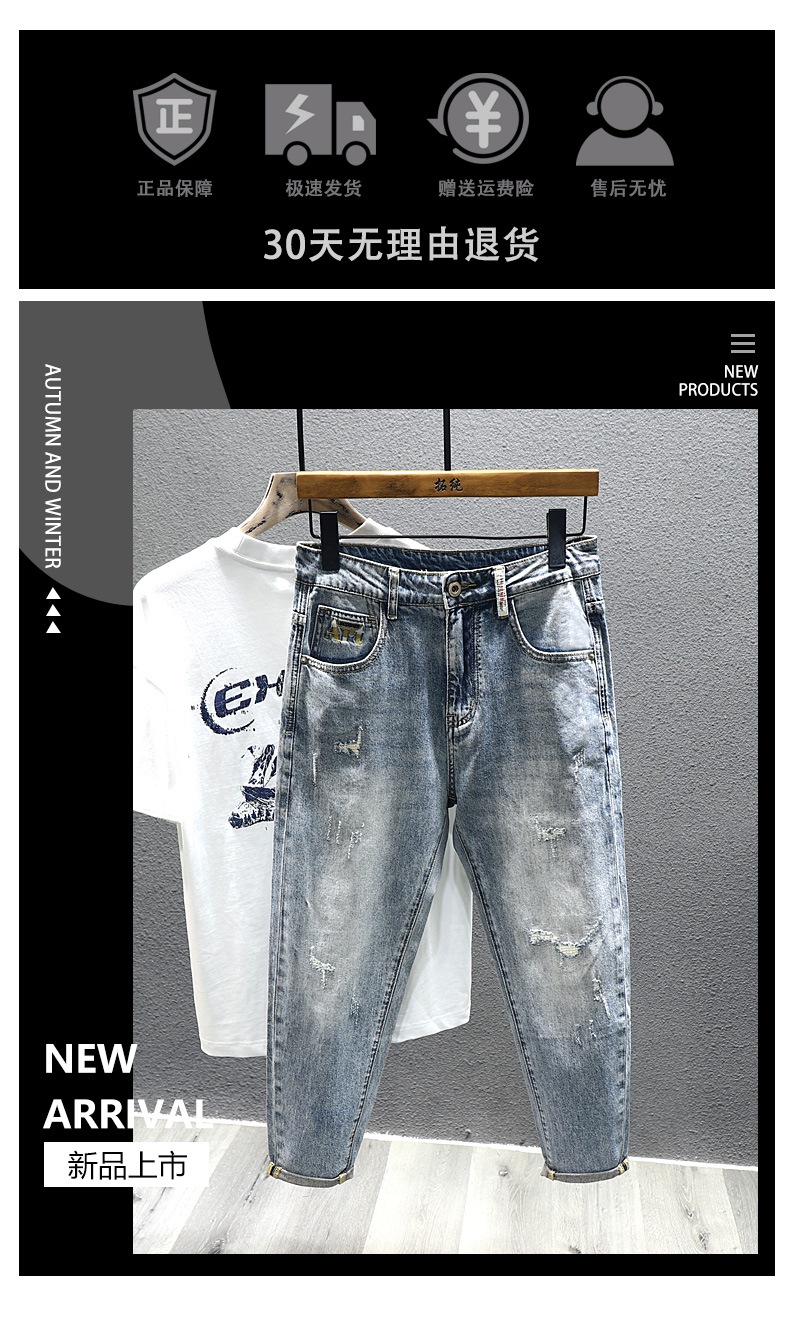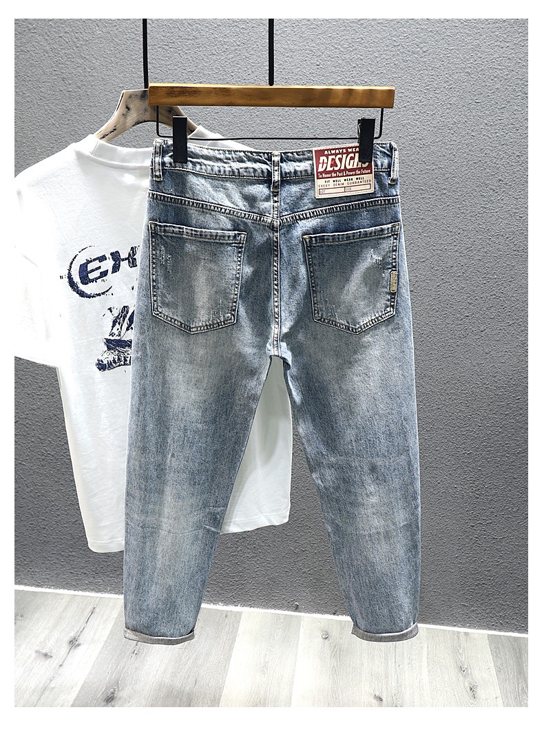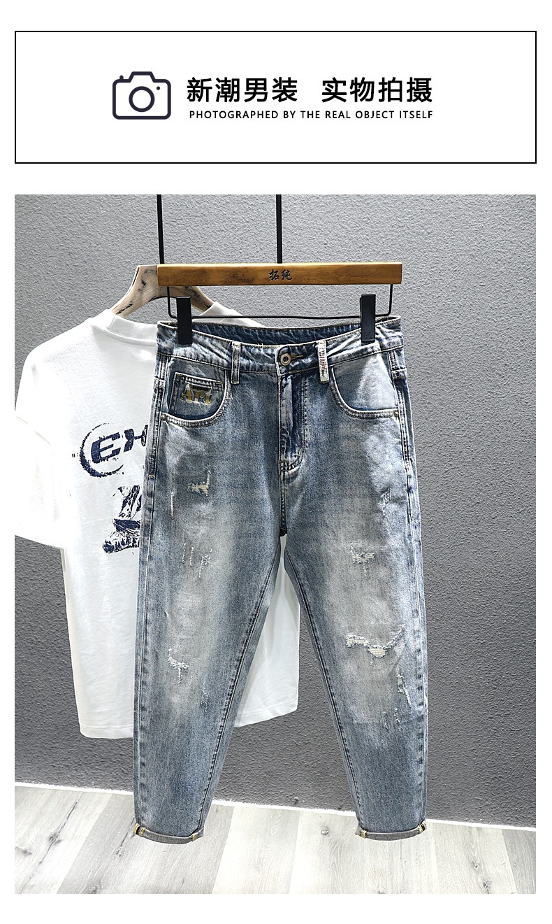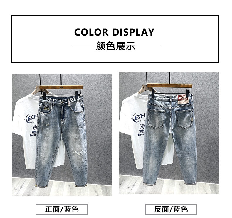 하이엔드 라이트 블루 9부 팬츠 남성 청바지 트렌디 브랜드 인즈 찢어진 패치 핸섬 청소년 9부 팬츠 여름 얇은 스타일스토어 가기