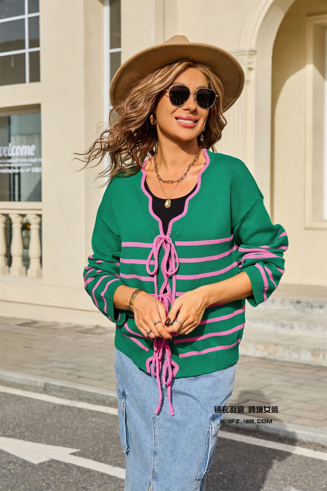 2025 새로운 가을, 겨울 대외 무역 크로스 보더 레이스 카디건 스트라이프 컬러 매칭 느슨한 슬리밍 대비 색상 여성용 스웨터