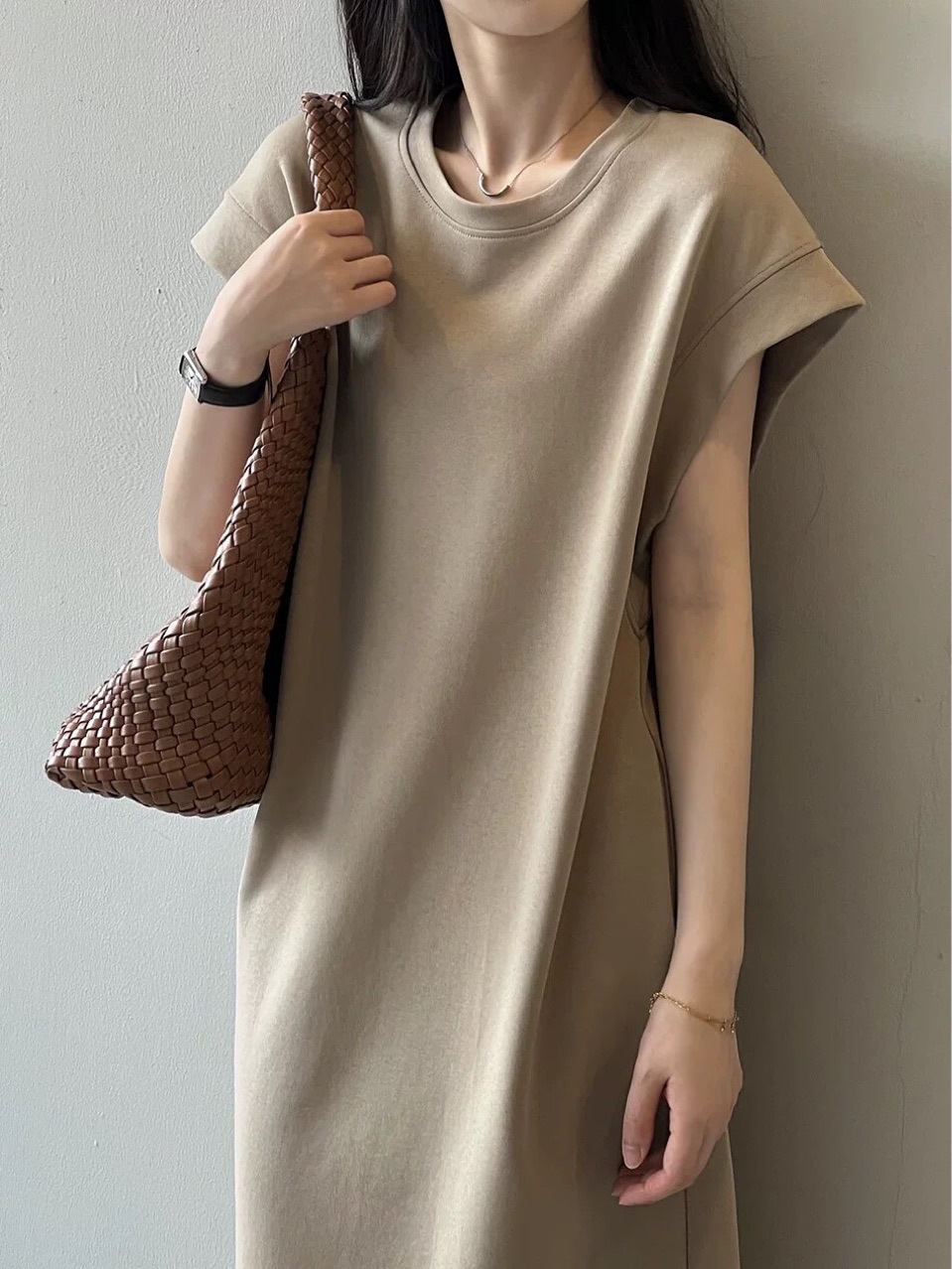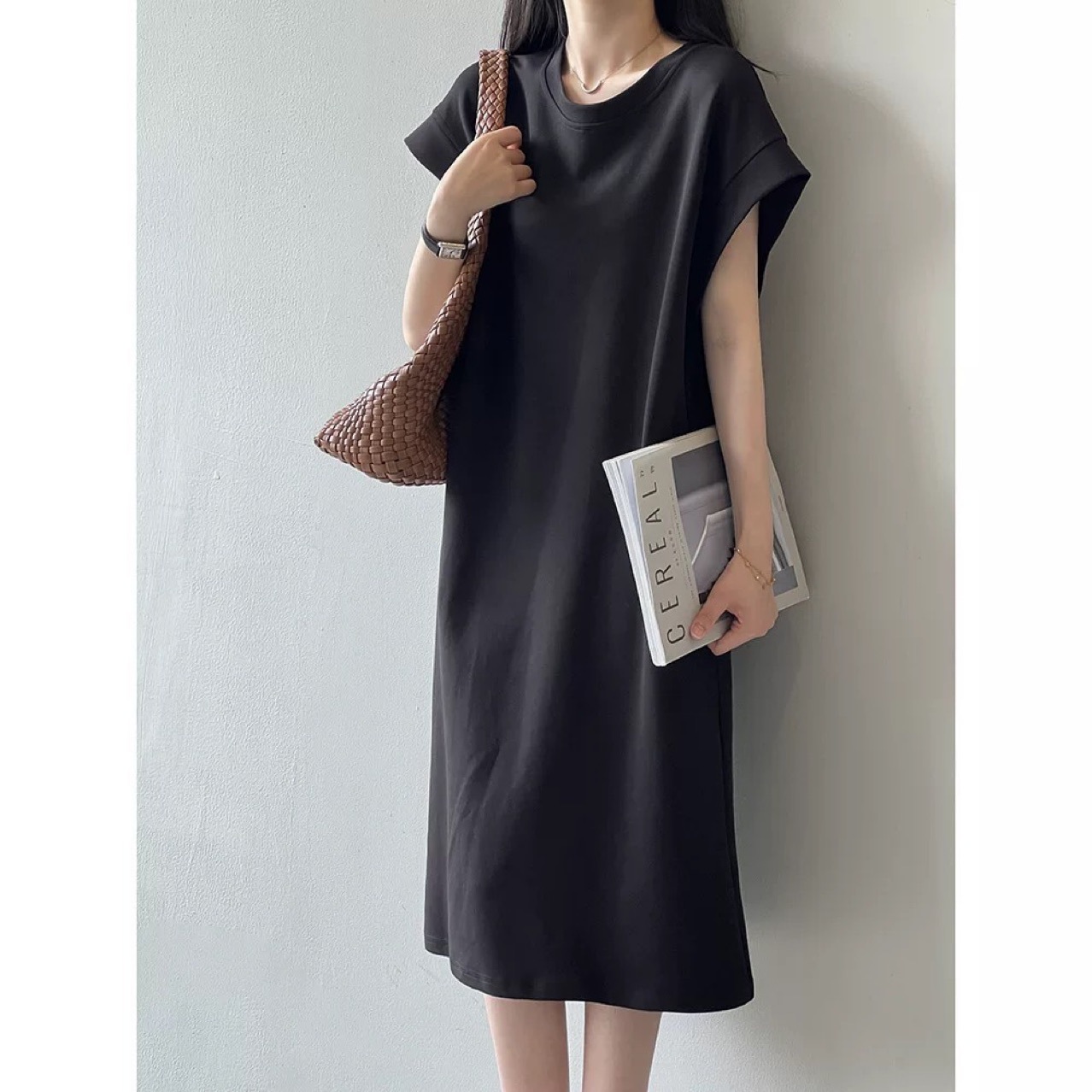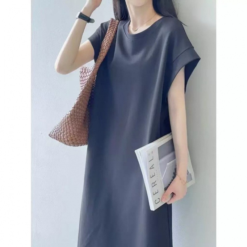 일본과 한국 캐주얼 여름 플러스 사이즈 플라잉 슬리브 드레스 프렌치 노출 방지 루즈 니치 여성용 중간 길이 티셔츠 드레스