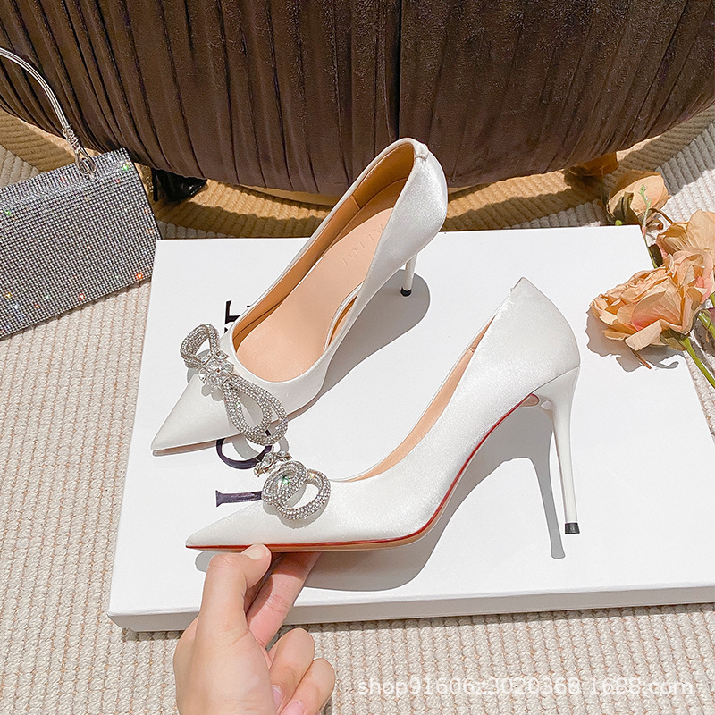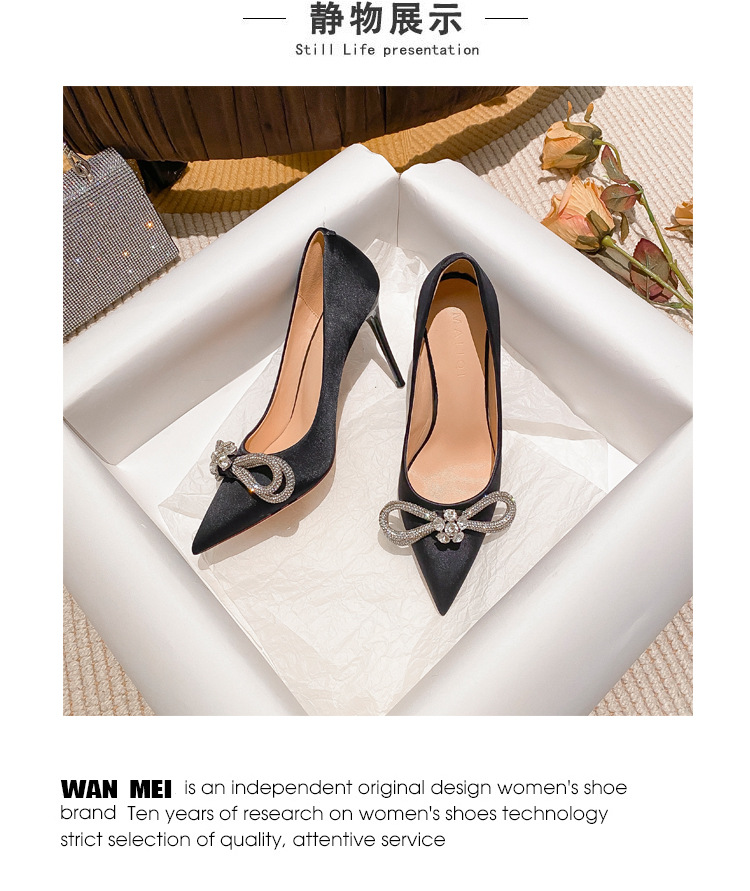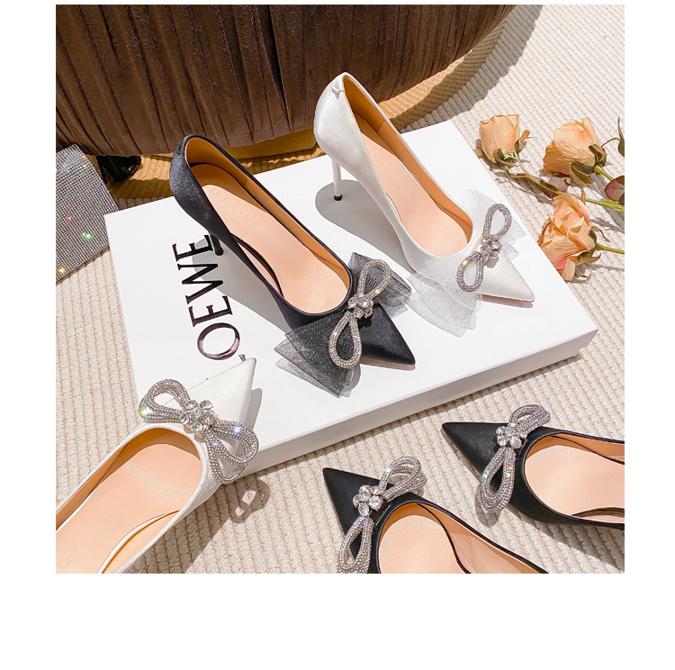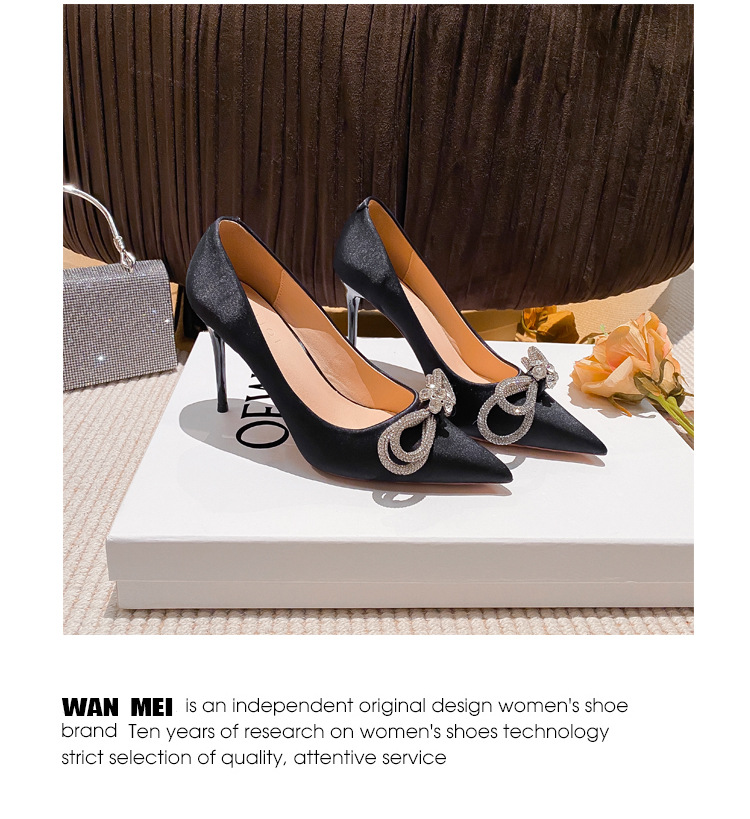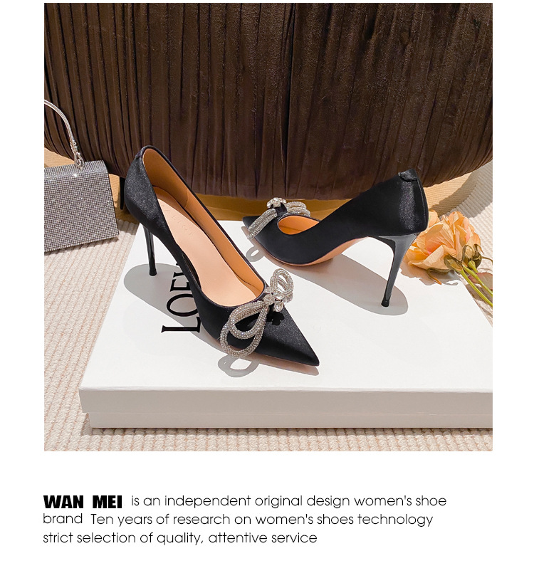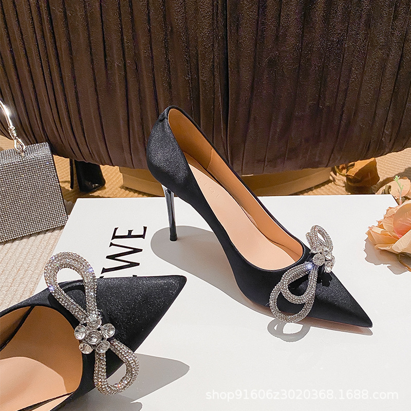 리본 블랙 아름다운 뾰족한 하이힐 여성용 스틸레토 하이힐 라인스톤 피곤하지 않은 통근 신발 2025 봄 신작스토어 가기