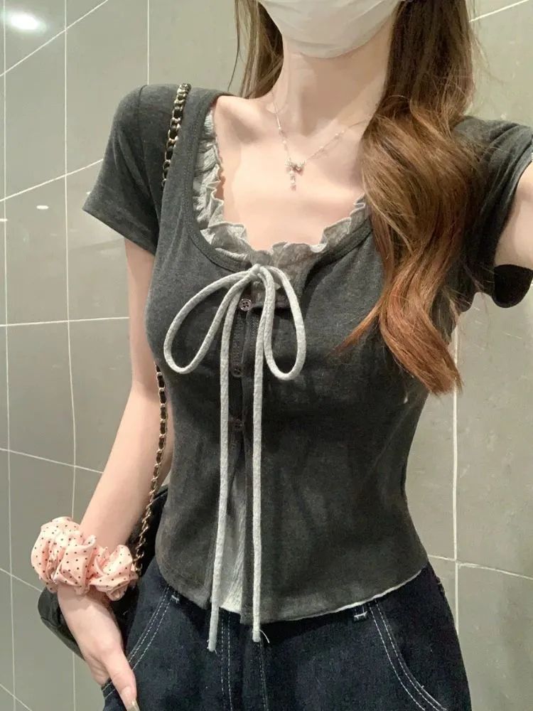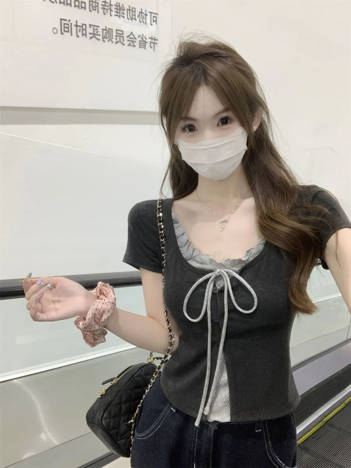 2025년 초여름 착용 새로운 스타일의 여성용 오른쪽 어깨 스퀘어 넥 반팔 티셔츠, 독특하고 아름답고 멋진 쇼트 탑스토어 가기
