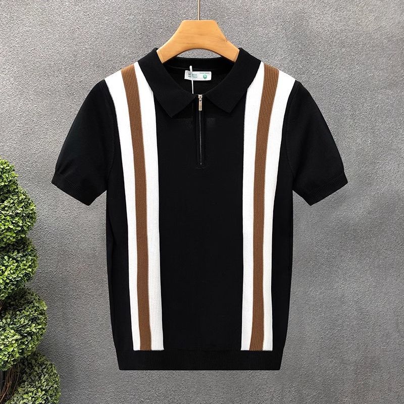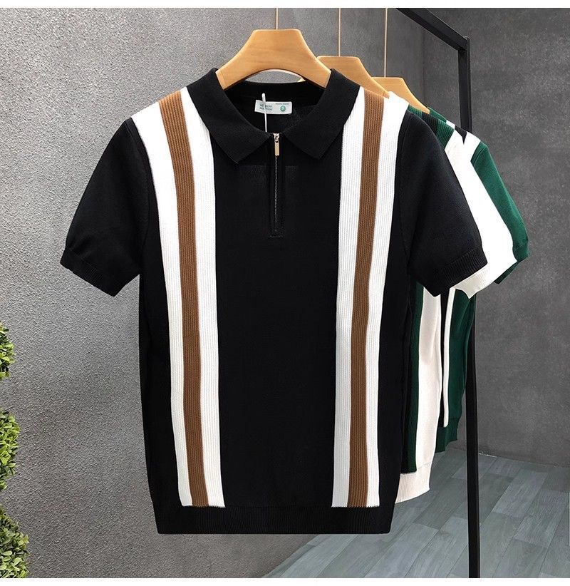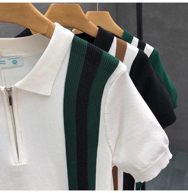라펠 스트라이프 컬러 블록 니트 반팔 남성 여름 아우터 다용도 캐주얼 대형 티셔츠 핸섬 피트니스 탑스토어 가기