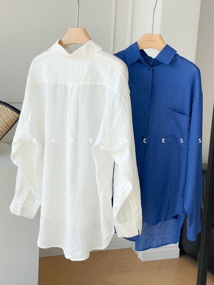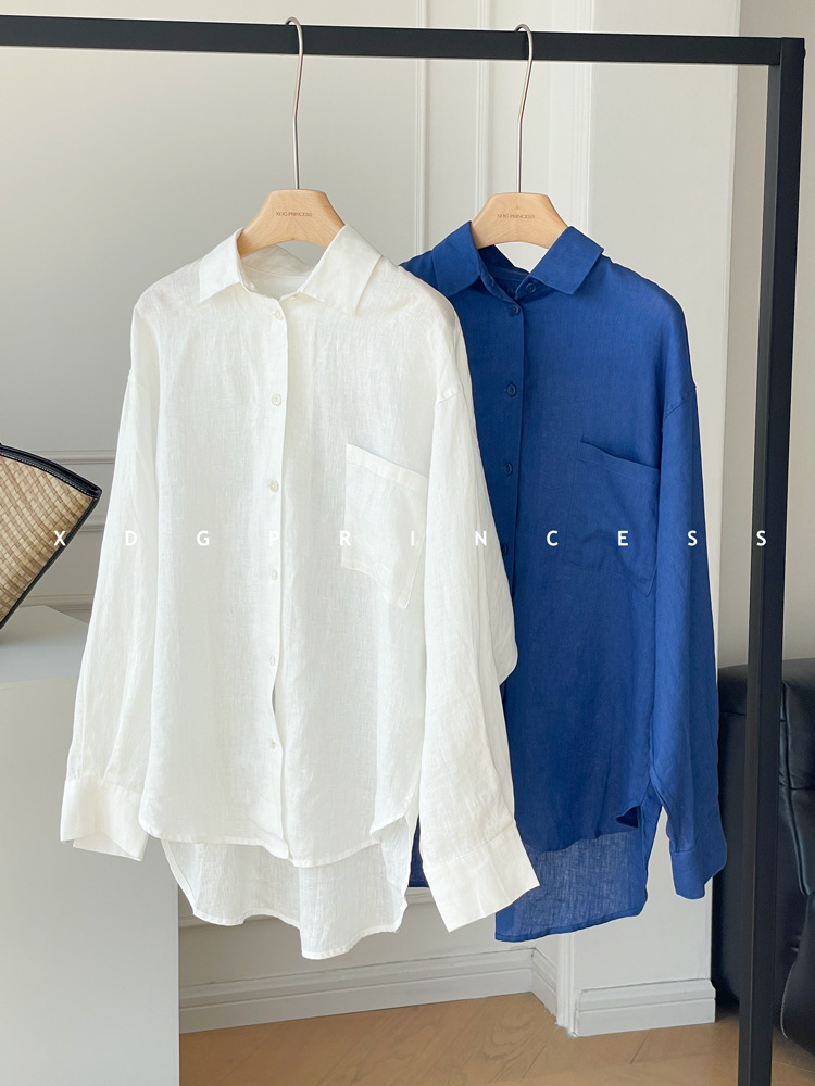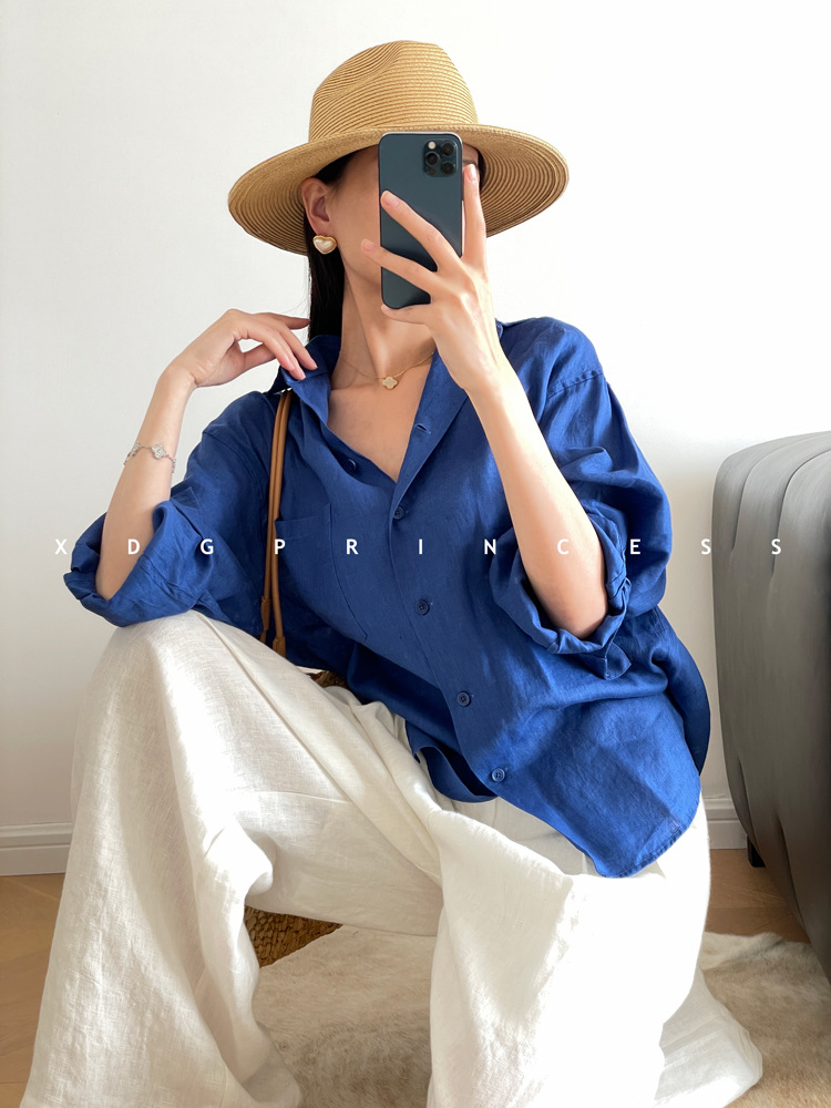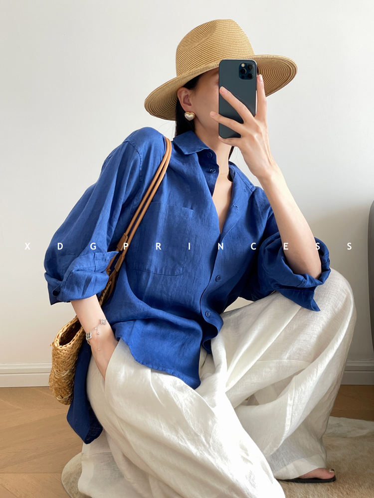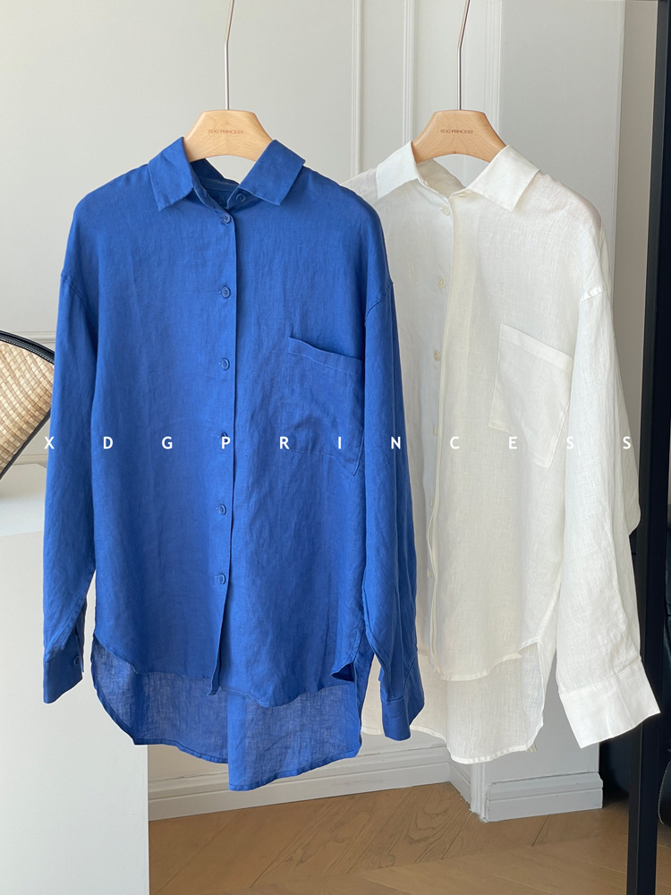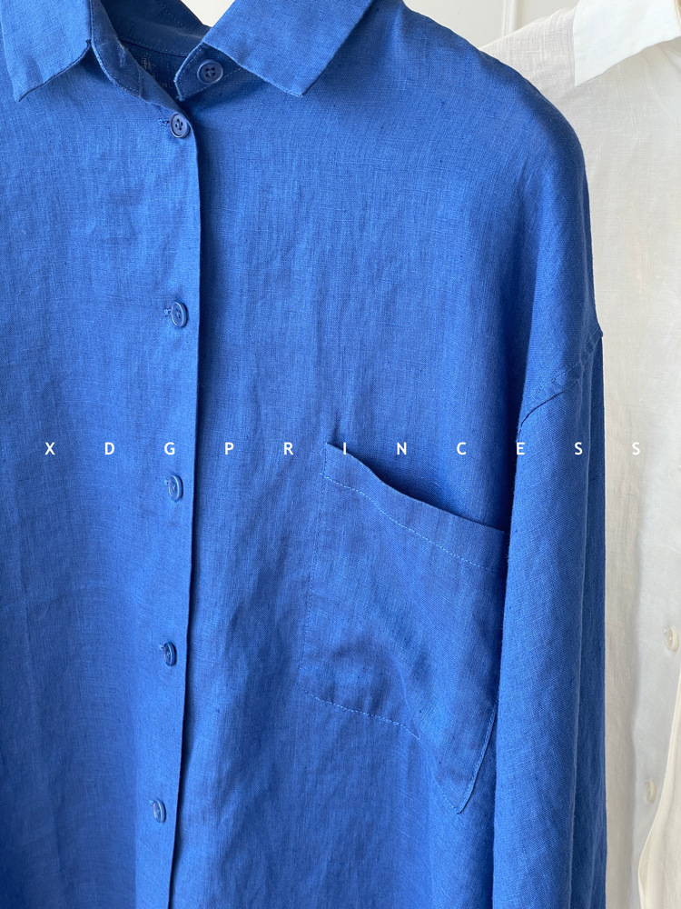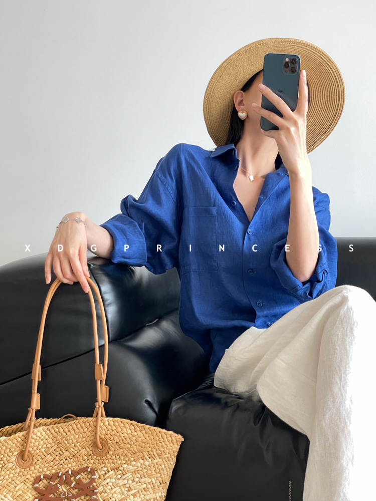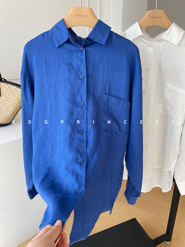 ROW 오리지널 상품~클라인 블루 린넨 여성용 긴팔 셔츠 봄 여름 루즈한 레이지 스타일 하이엔드 탑스토어 가기