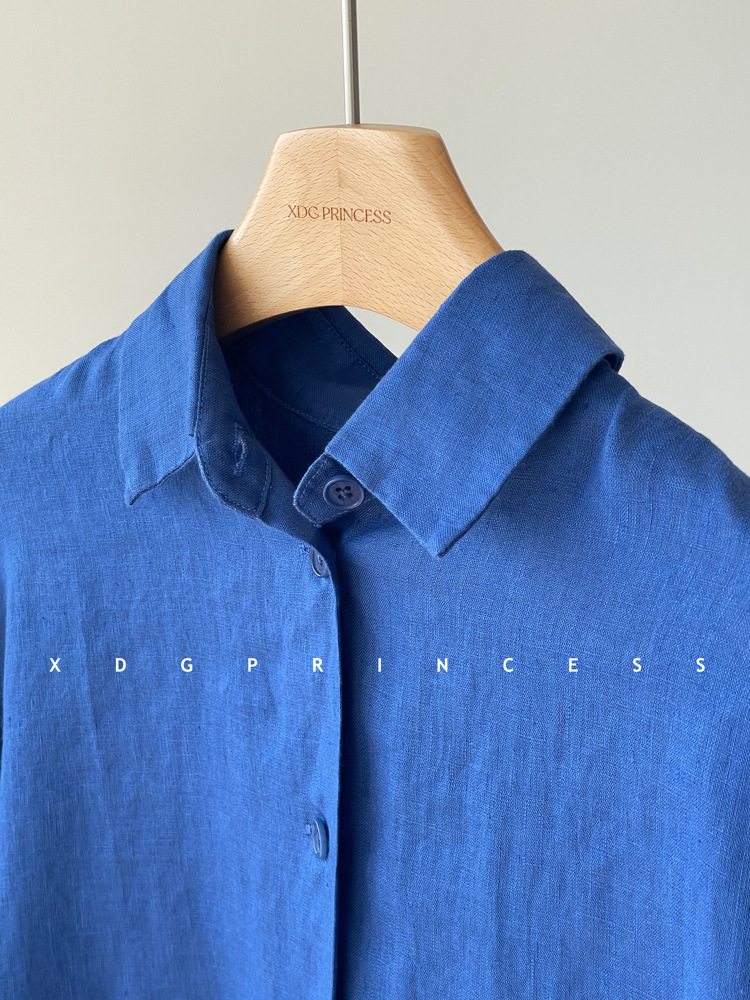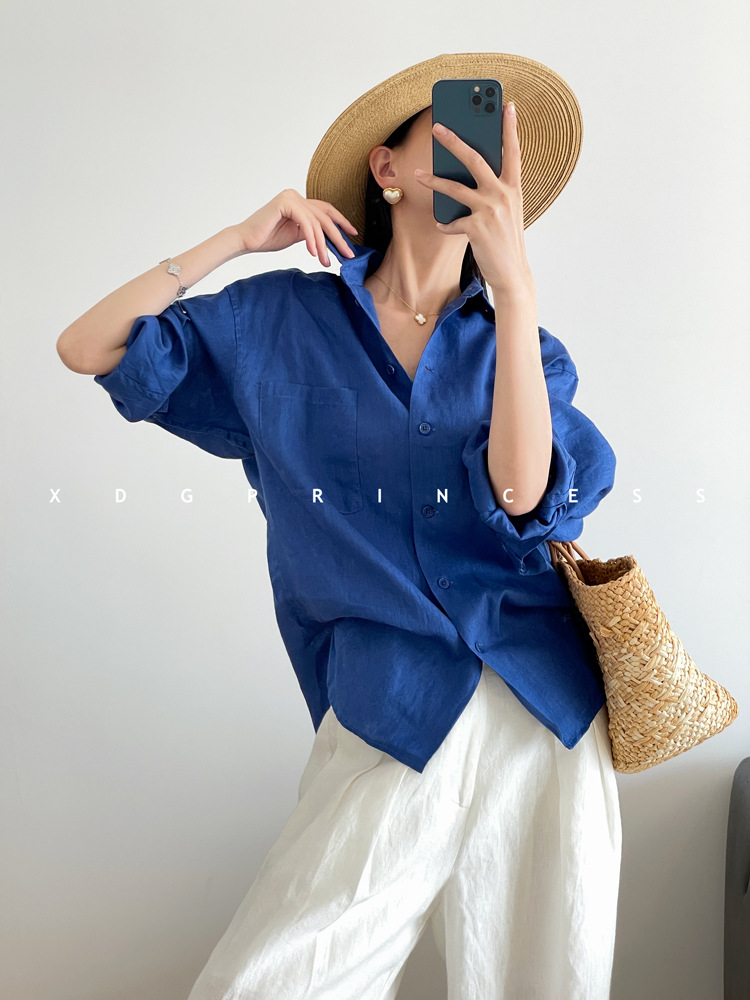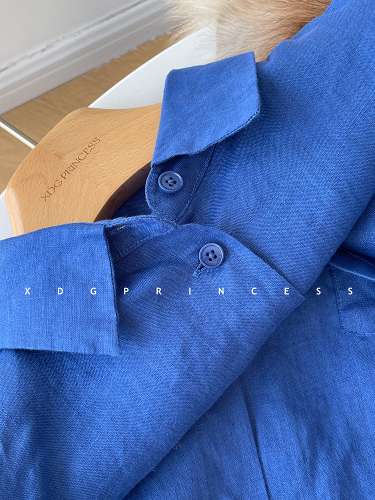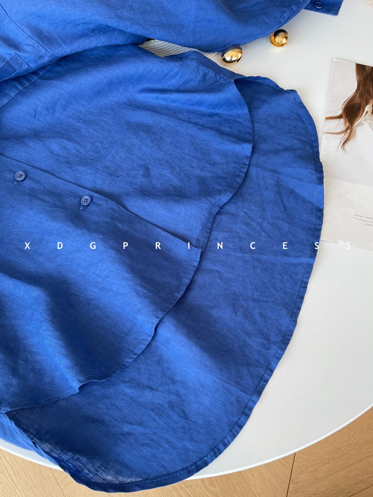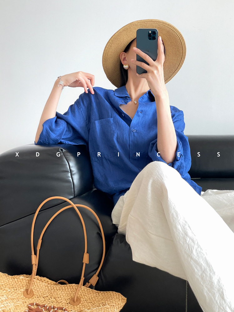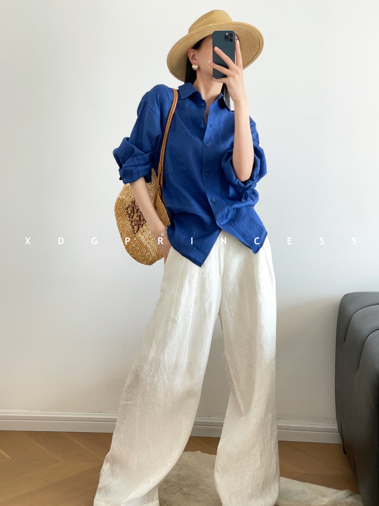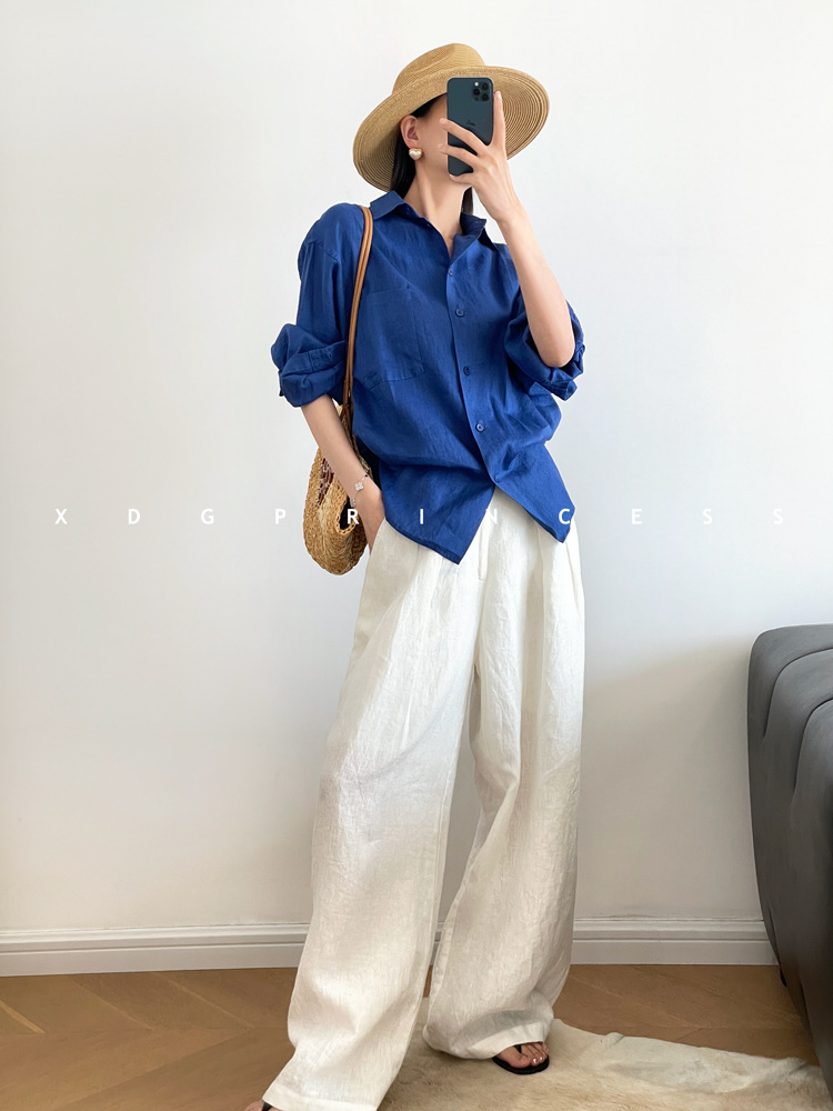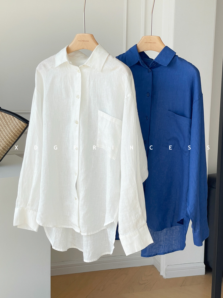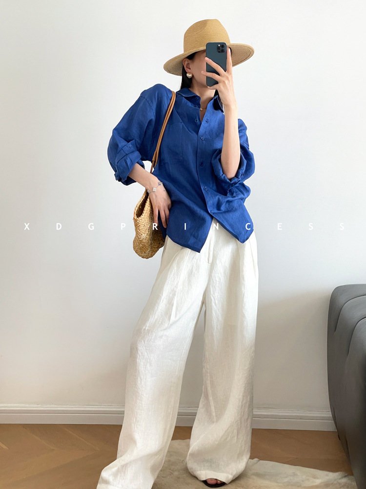 ROW 오리지널 상품~클라인 블루 린넨 여성용 긴팔 셔츠 봄 여름 루즈한 레이지 스타일 하이엔드 탑스토어 가기