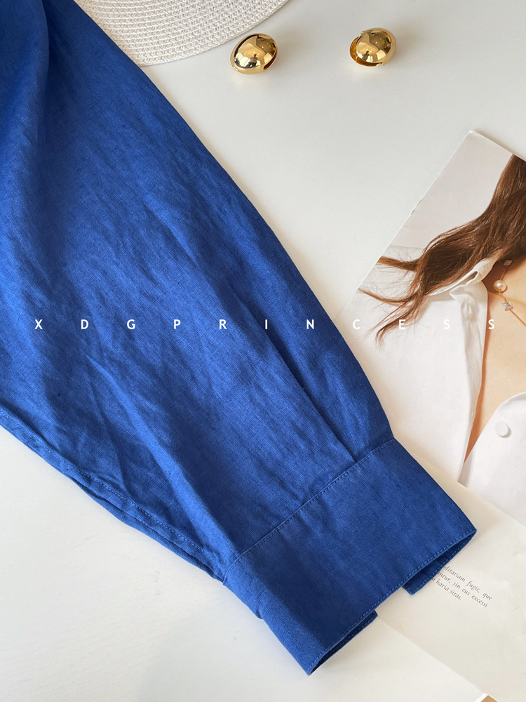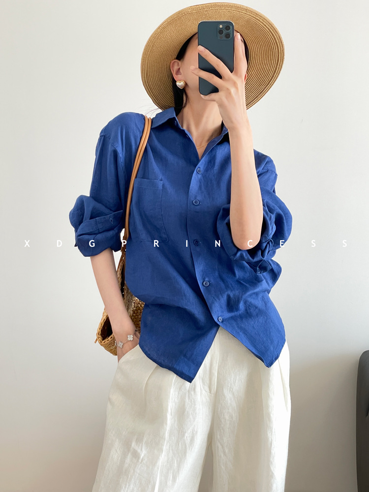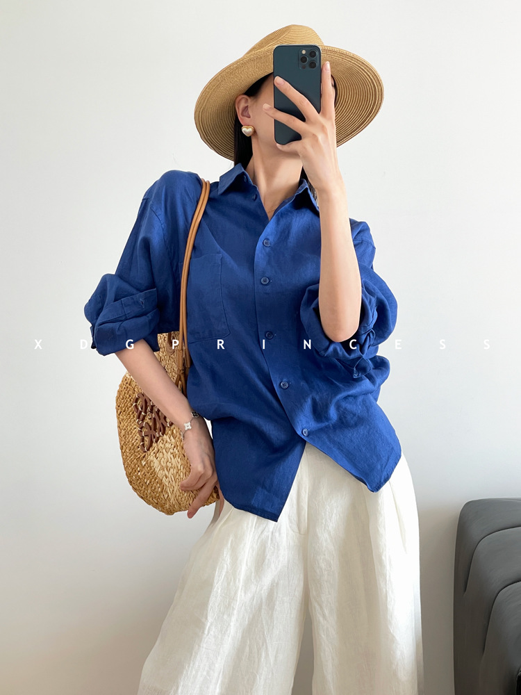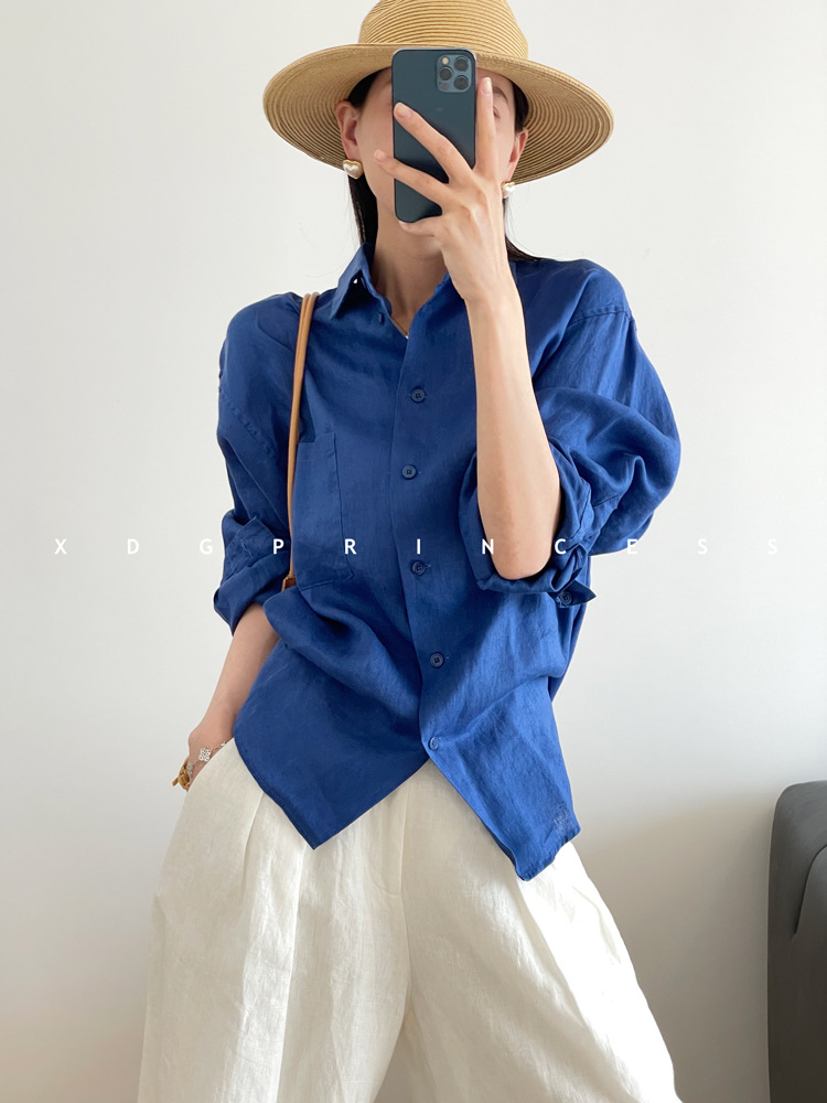 ROW 오리지널 상품~클라인 블루 린넨 여성용 긴팔 셔츠 봄 여름 루즈한 레이지 스타일 하이엔드 탑