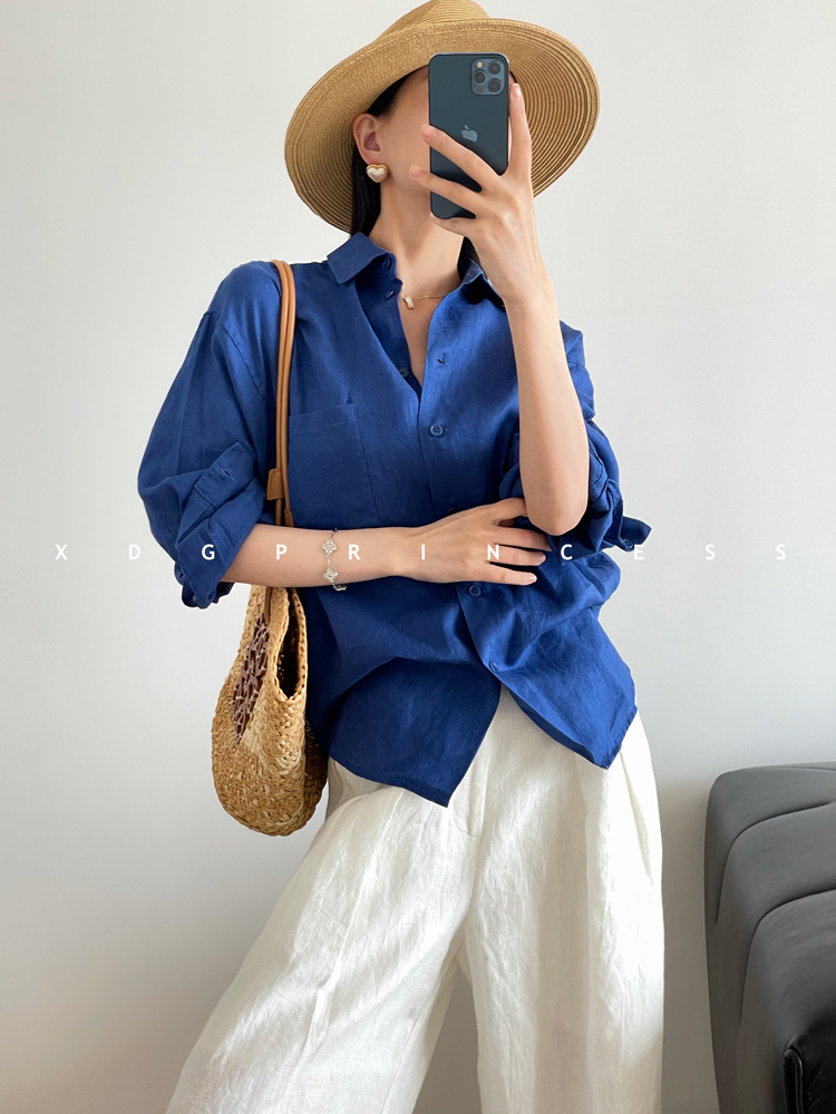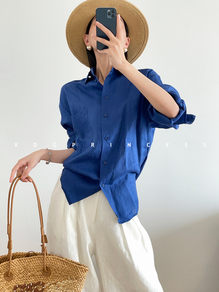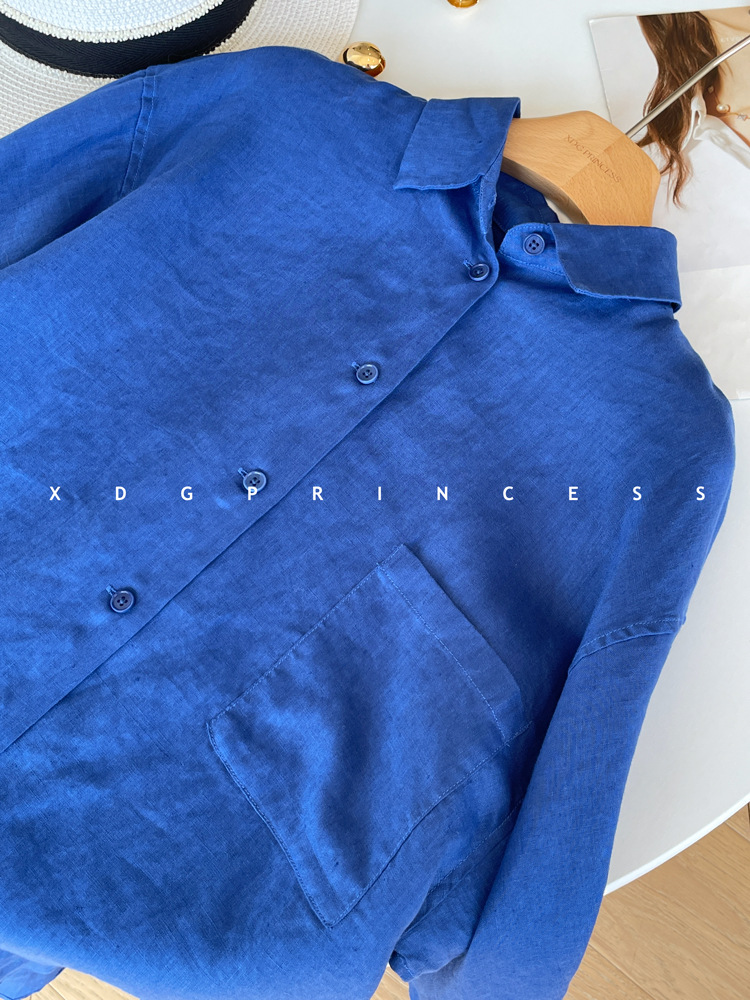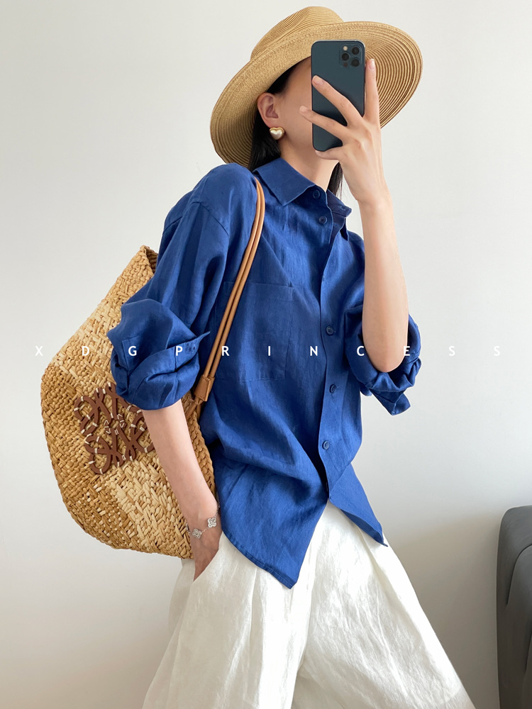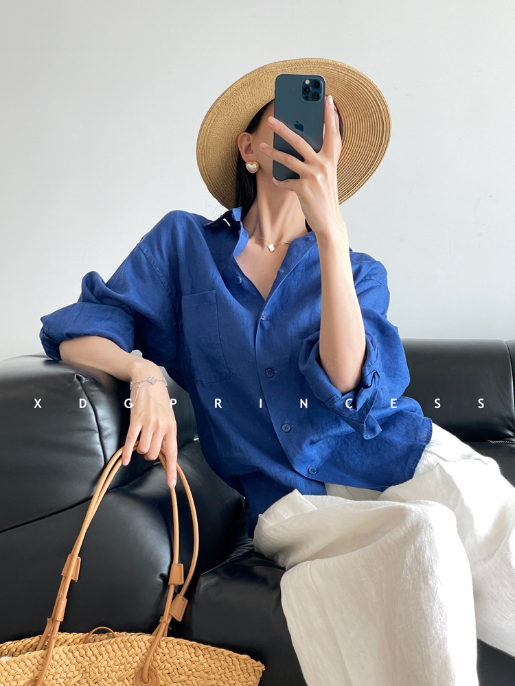 ROW 오리지널 상품~클라인 블루 린넨 여성용 긴팔 셔츠 봄 여름 루즈한 레이지 스타일 하이엔드 탑