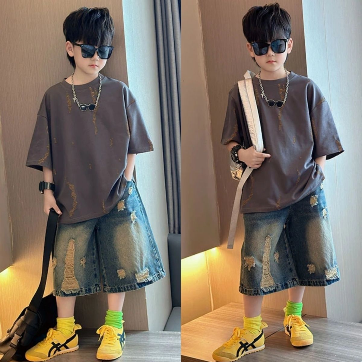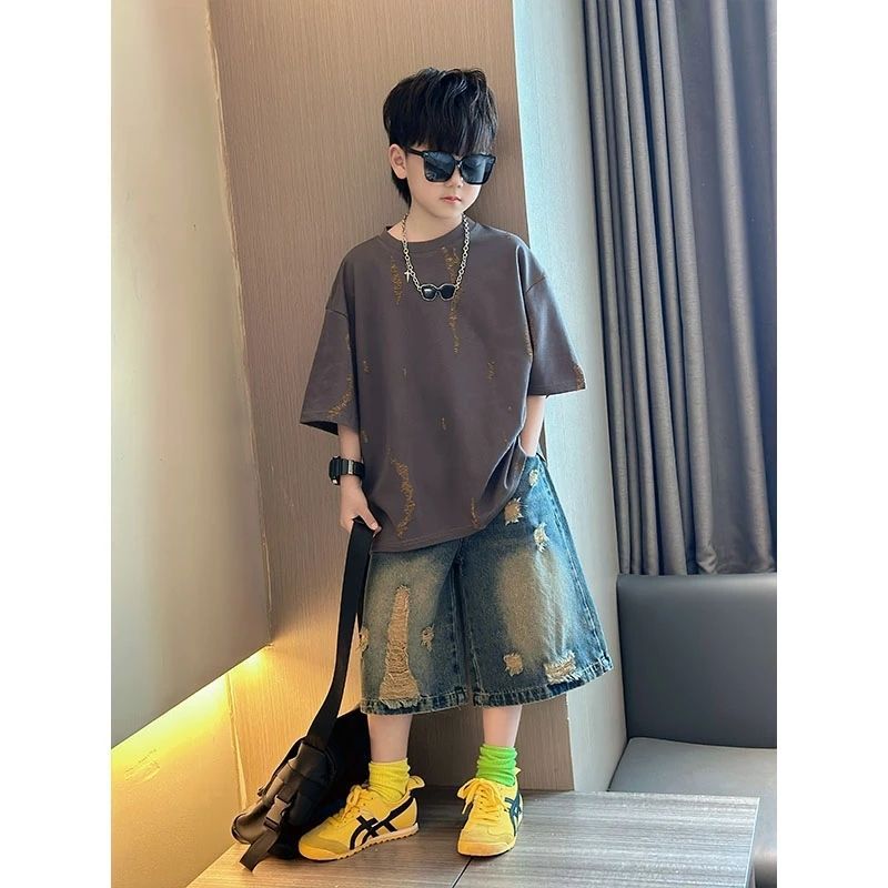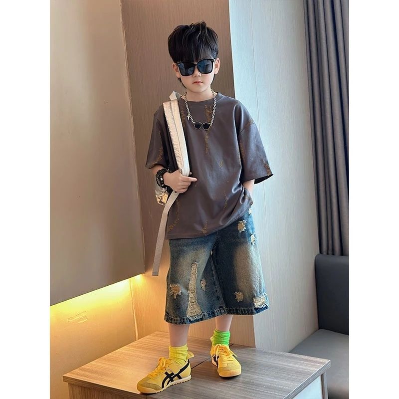 남아용 여름 패셔너블 캐주얼 다용도 반팔 셔츠, 중대형 아동용, 멋진 스트리트 루즈 찢어진 데님 5부 팬츠스토어 가기