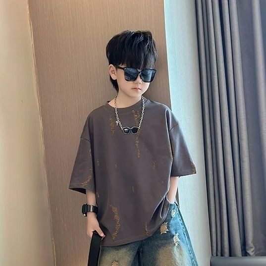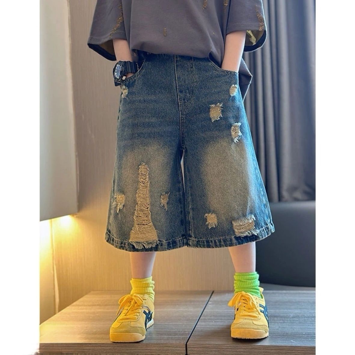 남아용 여름 패셔너블 캐주얼 다용도 반팔 셔츠, 중대형 아동용, 멋진 스트리트 루즈 찢어진 데님 5부 팬츠