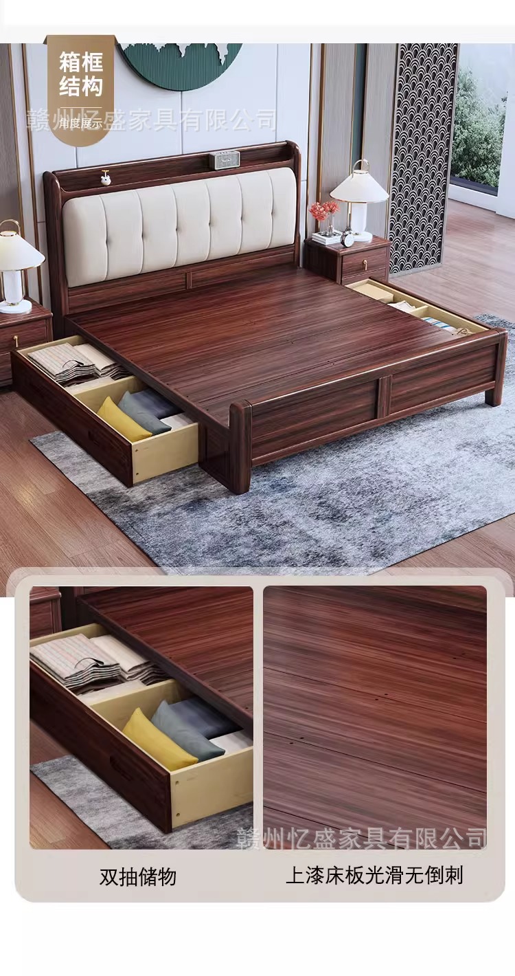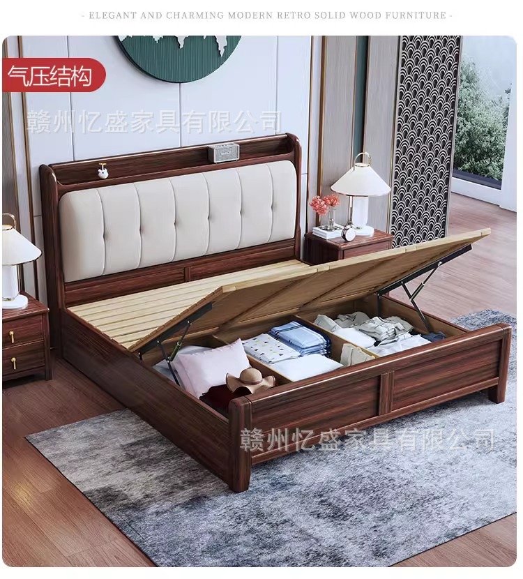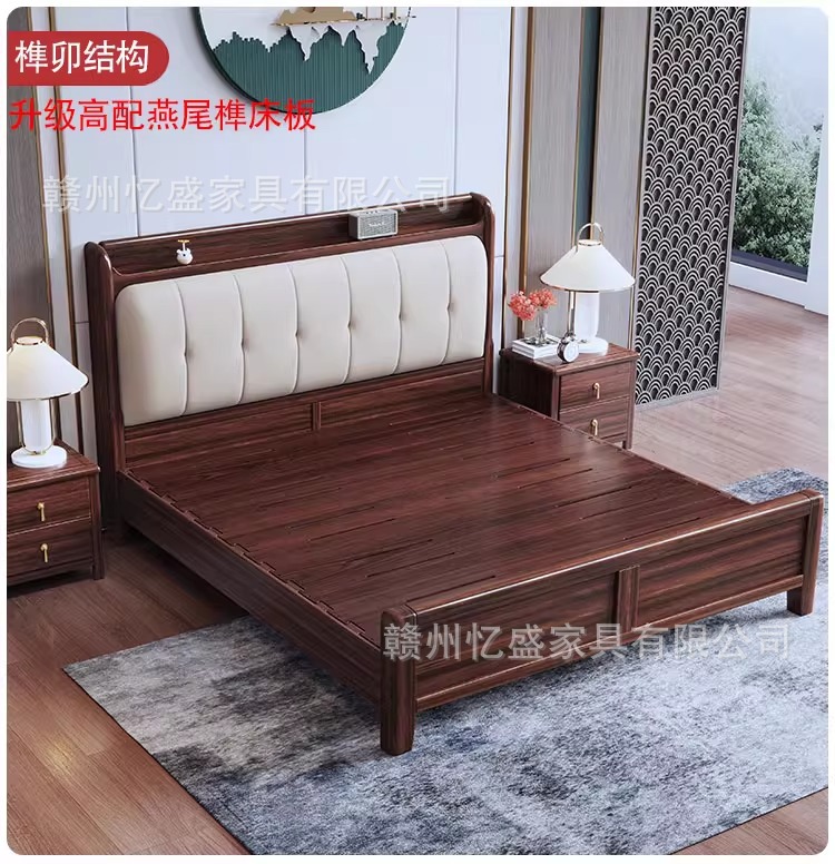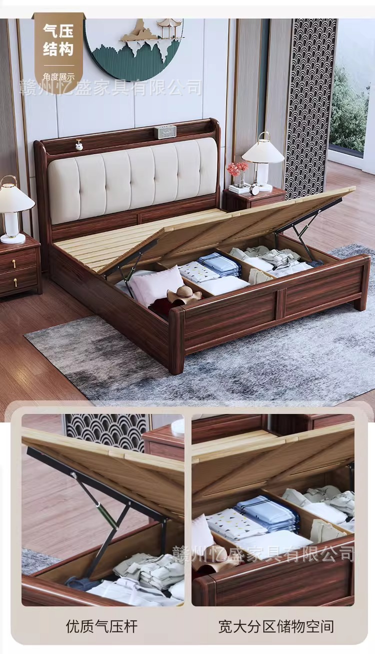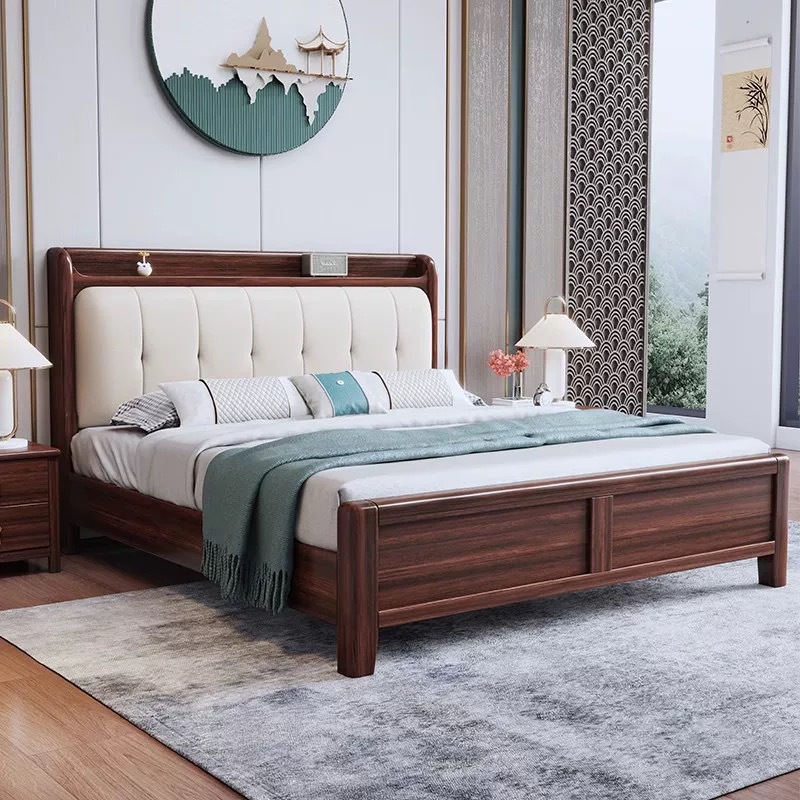 새로운 중국 스타일 검은 골드 우드 솔리드 우드 침대 1.8m 더블 침대 라이트 럭셔리 현대 미니멀리스트 마스터 침실 소프트 등받이 1.5m 수납 침대